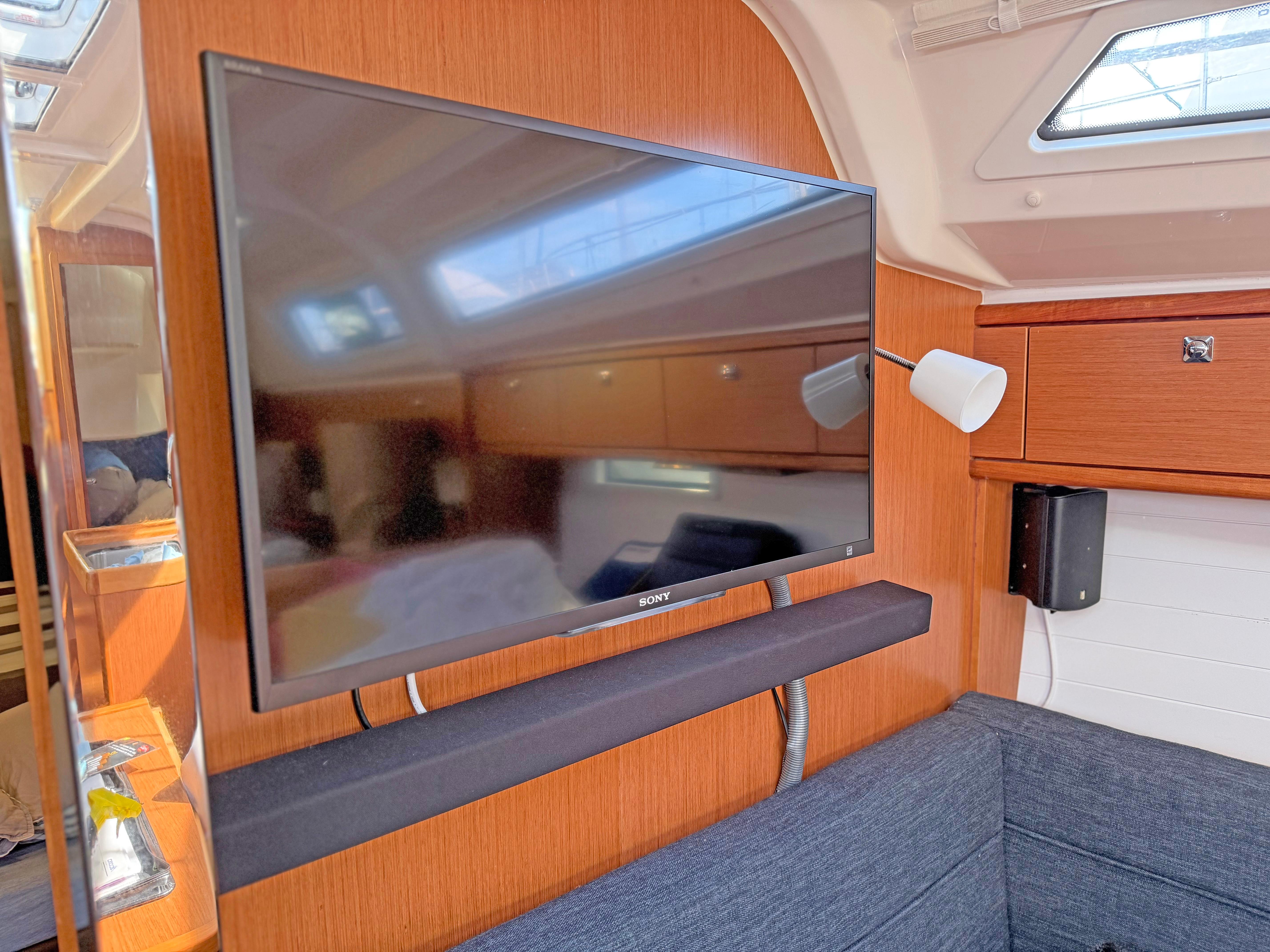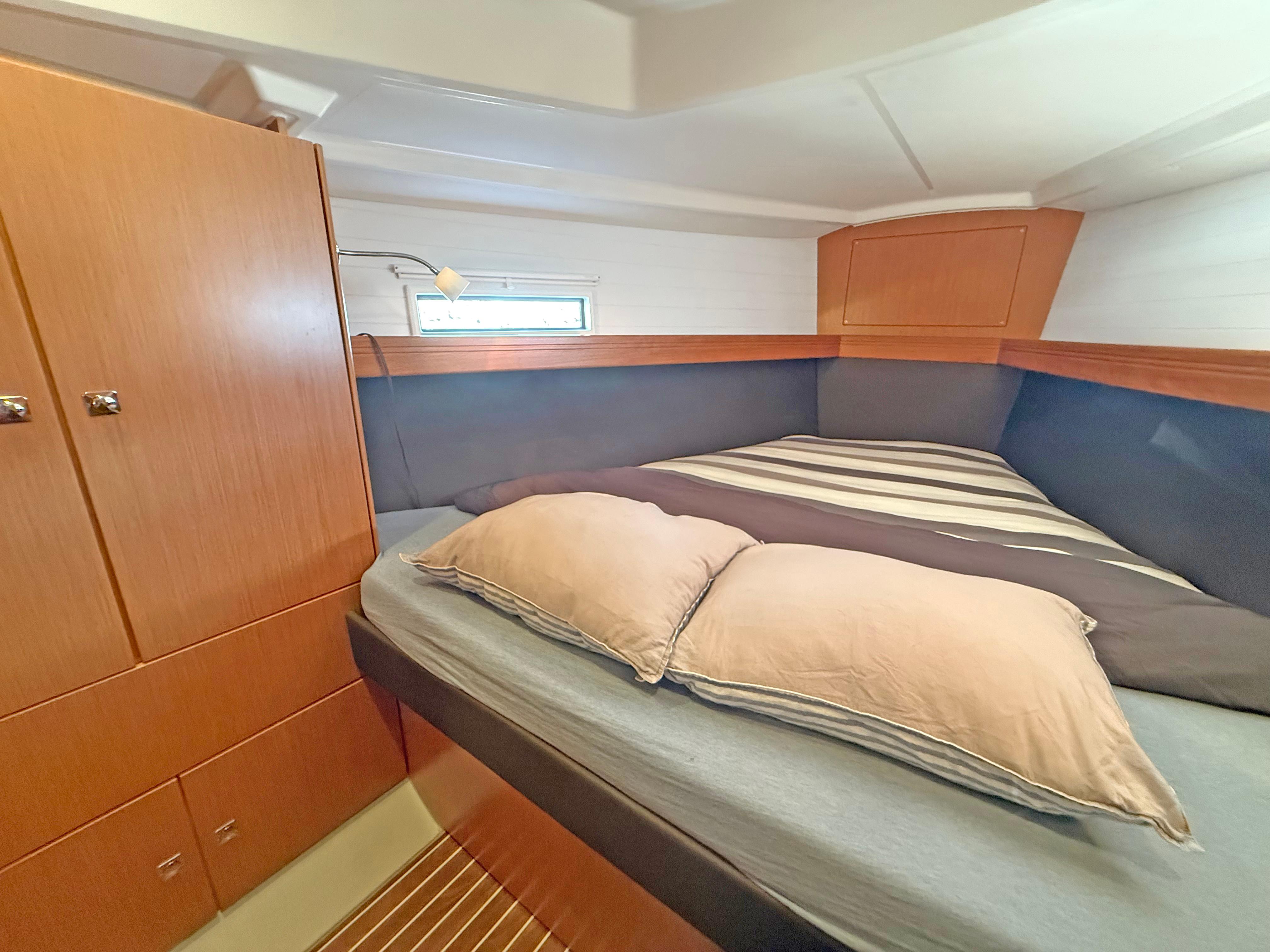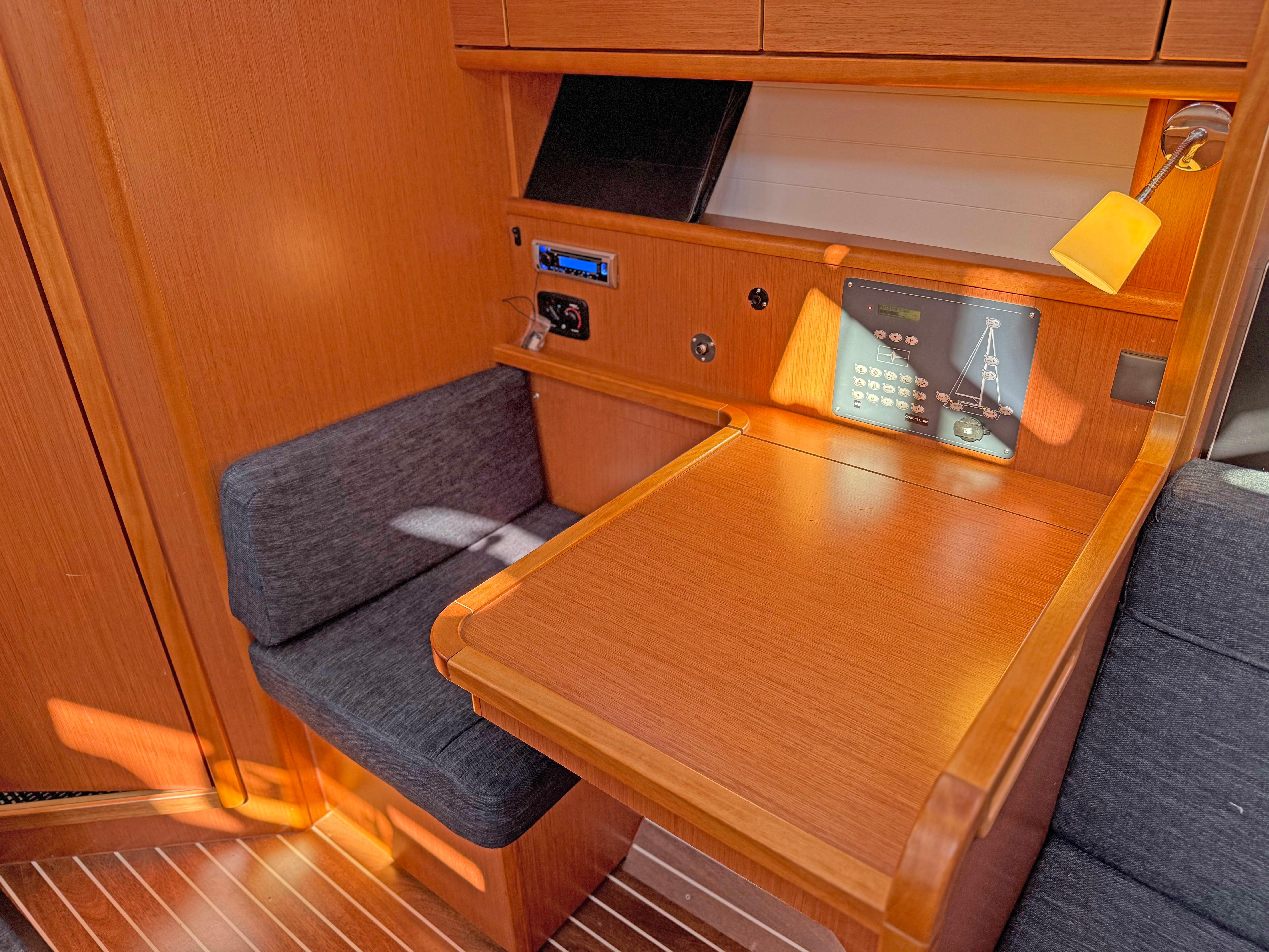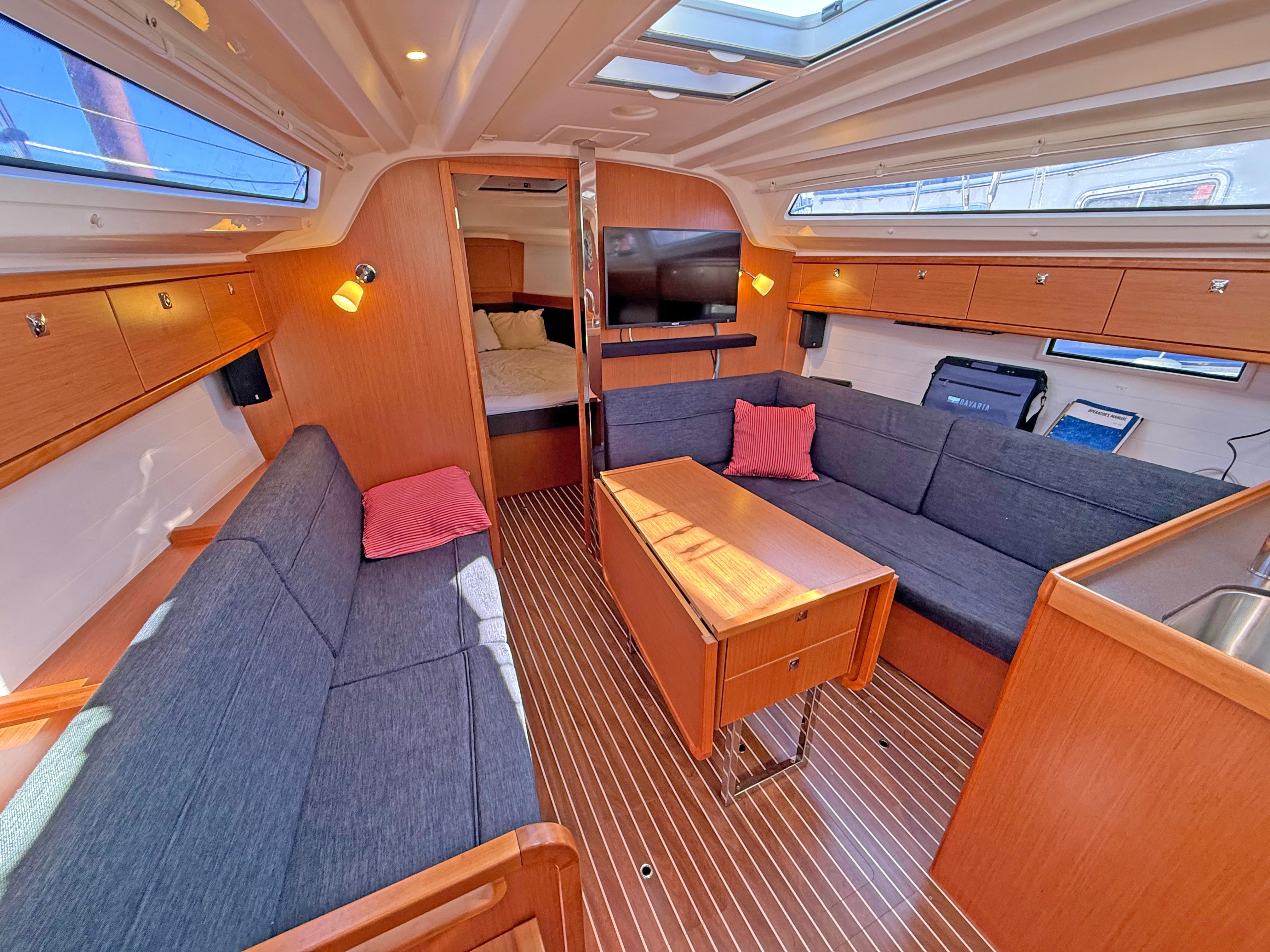 2 Cabin/1 Head layout Very bright with excellent ventilation – lots of windows and opening hatches On entering the vessel the galley is conveniently to starboard and the chart table to port. Large full sized chart table/office with storage Further forward is the saloon table with settees port and starboard. Room to host six for dinner Master cabin is forward with an opening hatch and light from the hull windows. Small bench. Two large hanging lockers Large Head with sink, shower and Jabsco toilet. Easy draining gravity drain holding tank Guest Cabin is aft and to starboard. Includes a hanging locker and small bench. Oceanair blackout/bug screens on all opening hatches All windows, including the long saloon trunk windows, have pleated blinds. 34’ Sony TV with soundbar and speaker system. 6’4” Headroom and all beds are 6’6”. Diesel heat – four season cruising