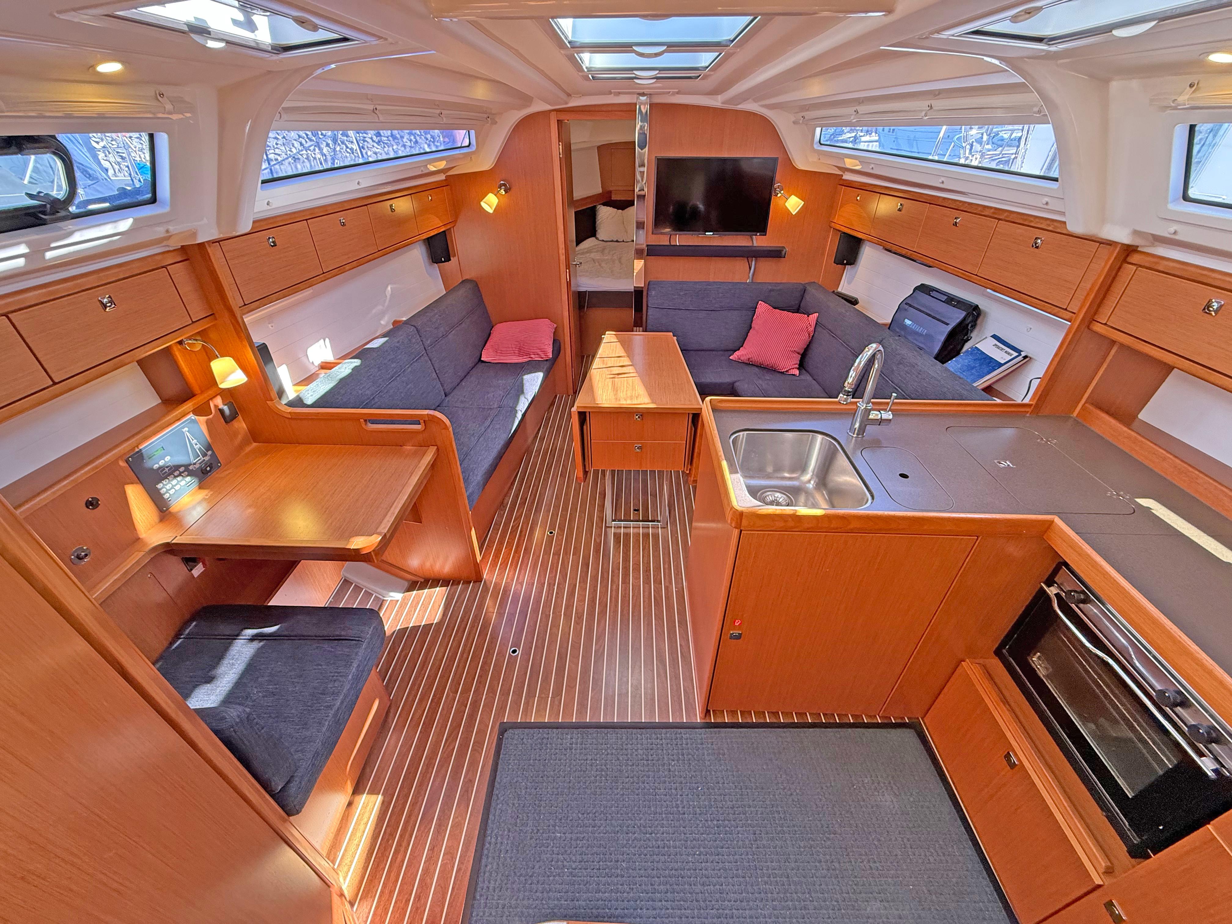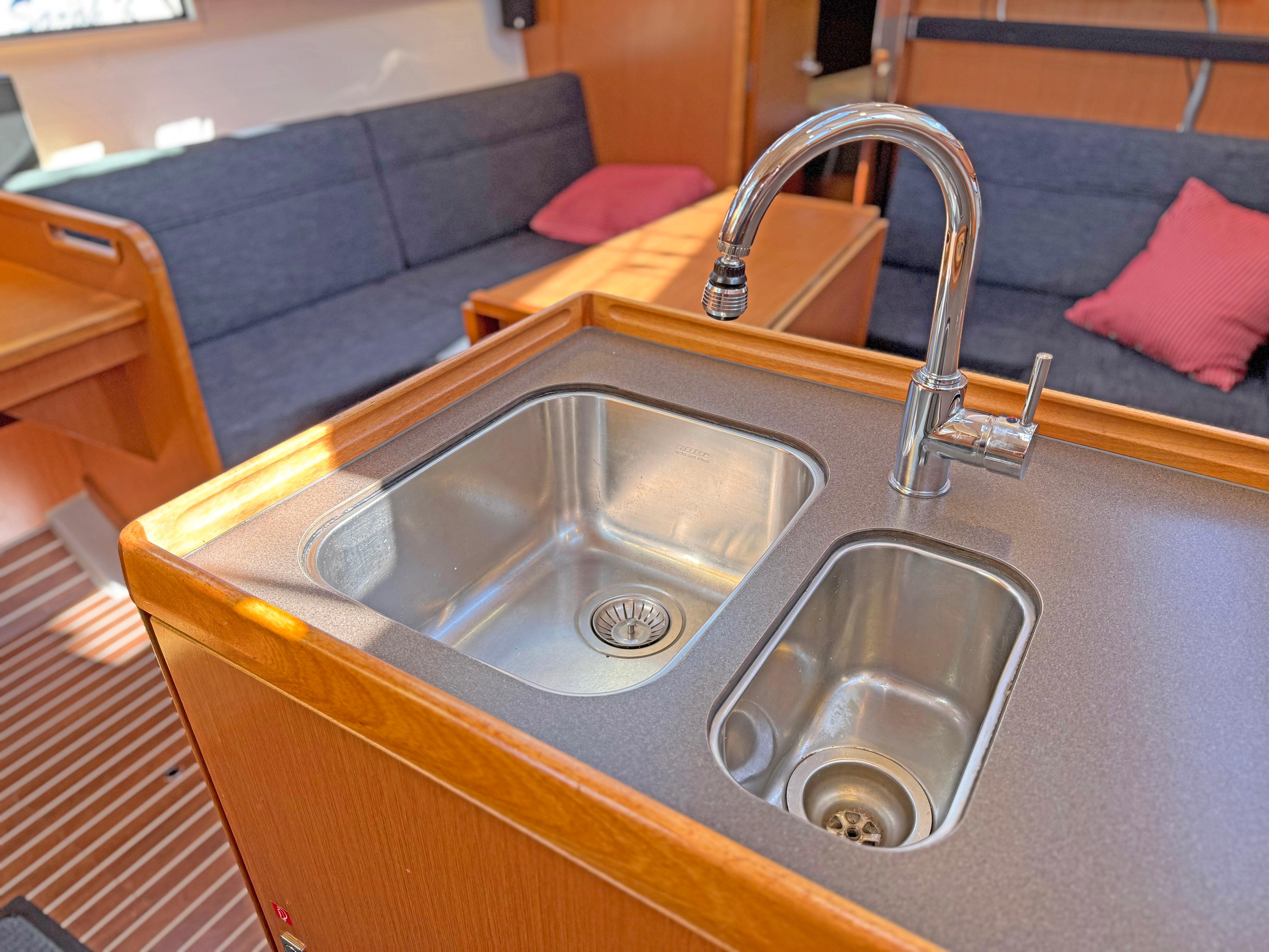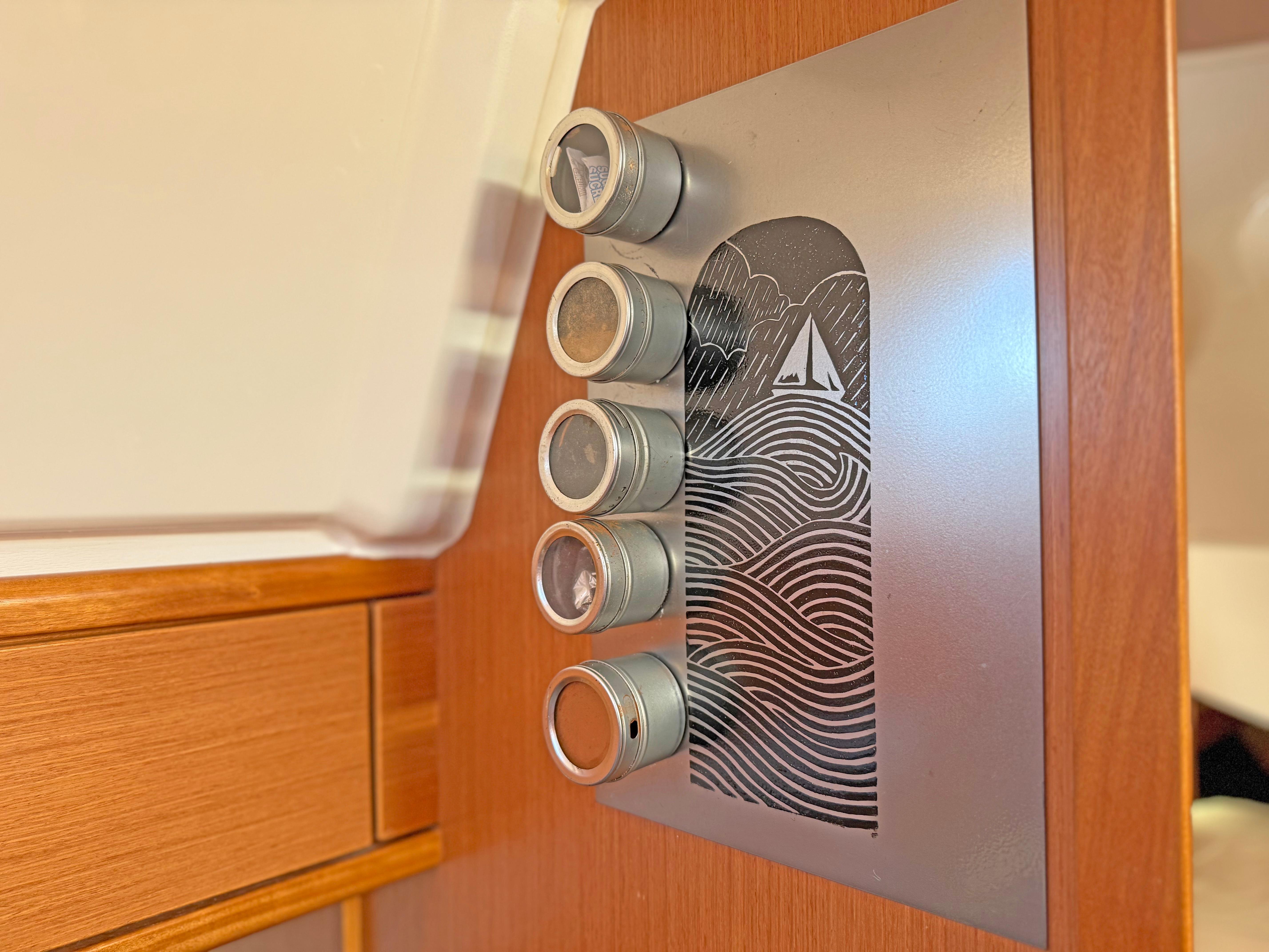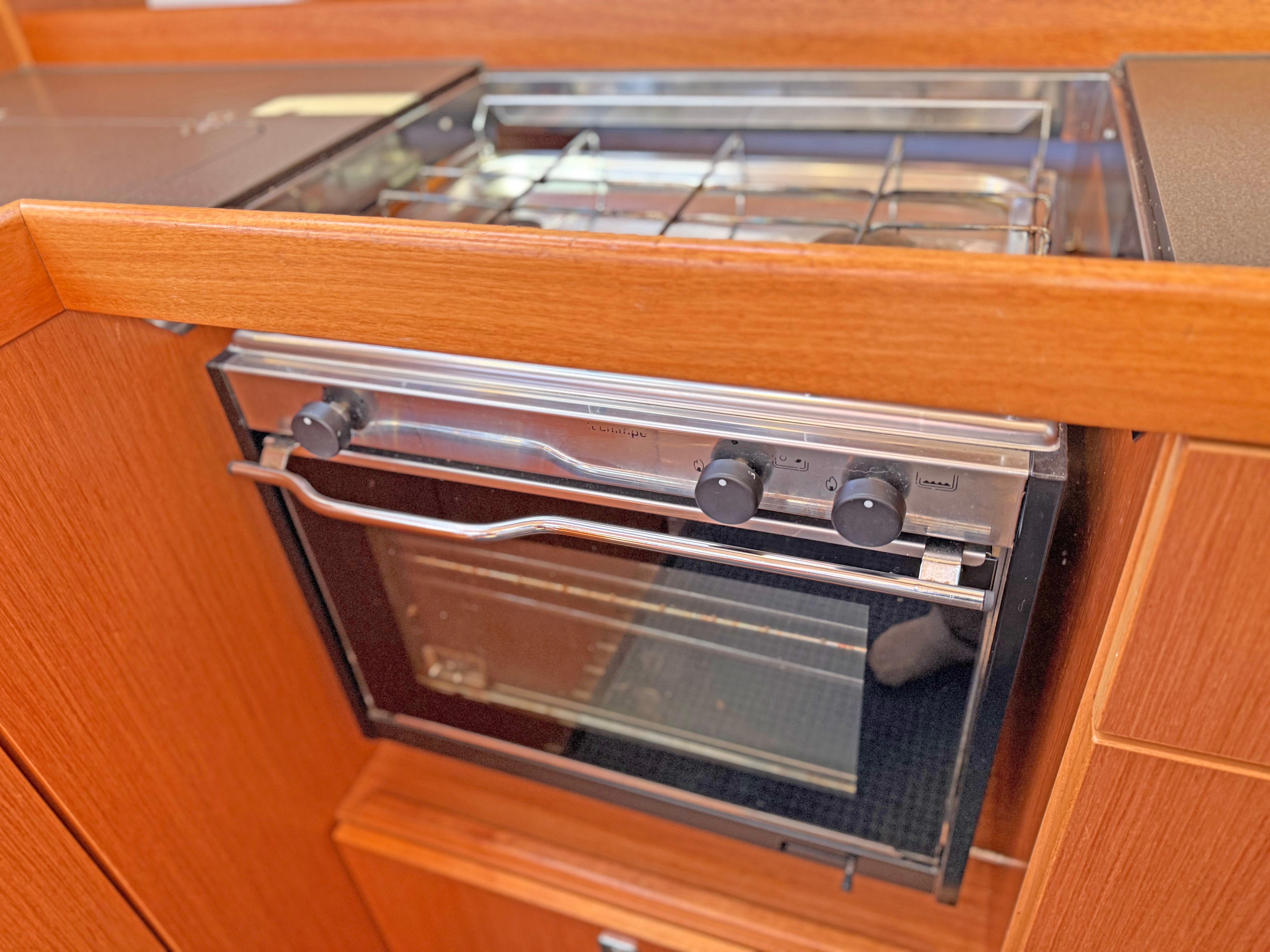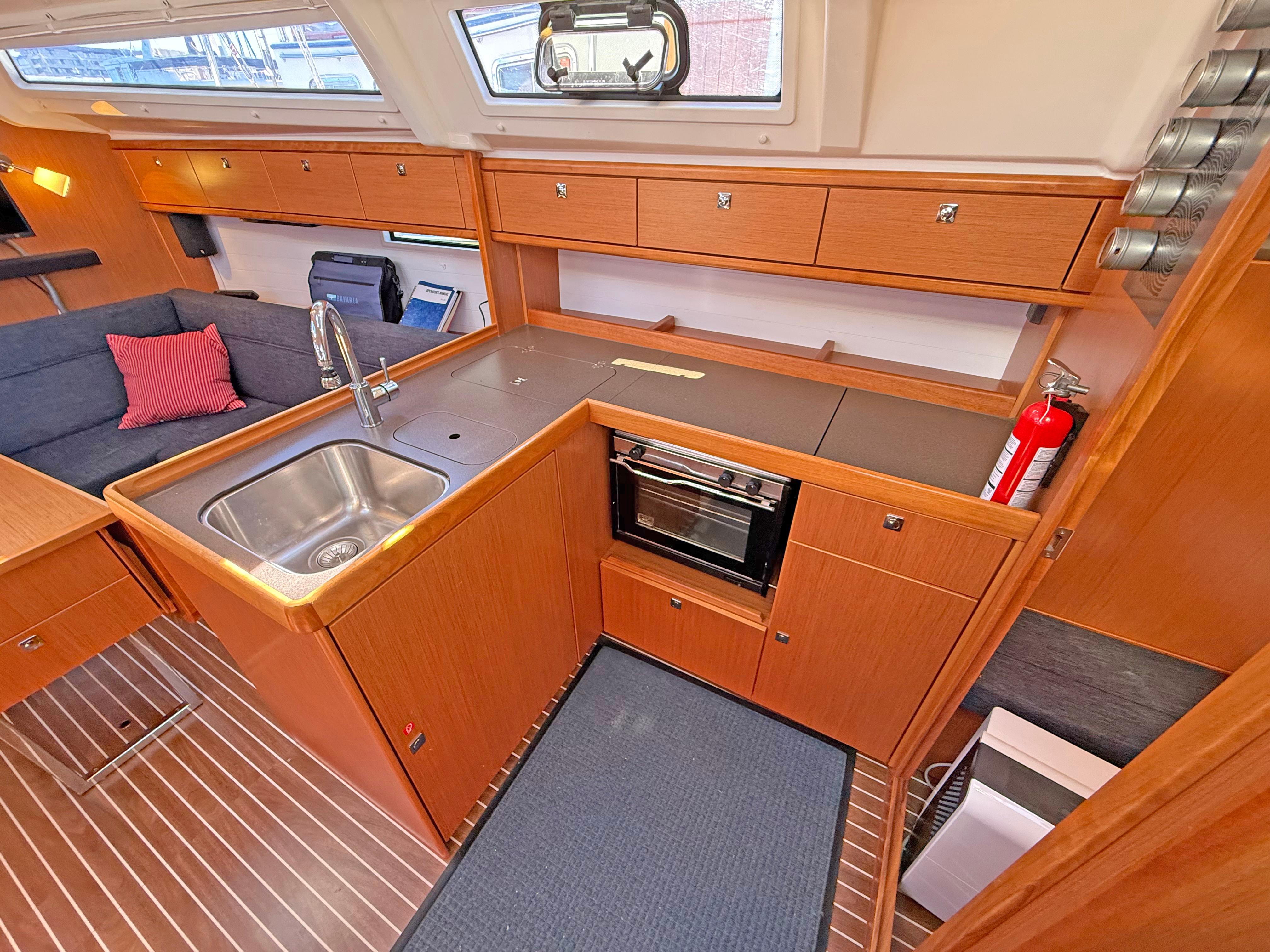 Comfortable galley to starboard with easy access to the cockpit Lots of storage and preparation space Propane Stove/Oven Double stainless-steel sink Large fridge Custom spice storage system