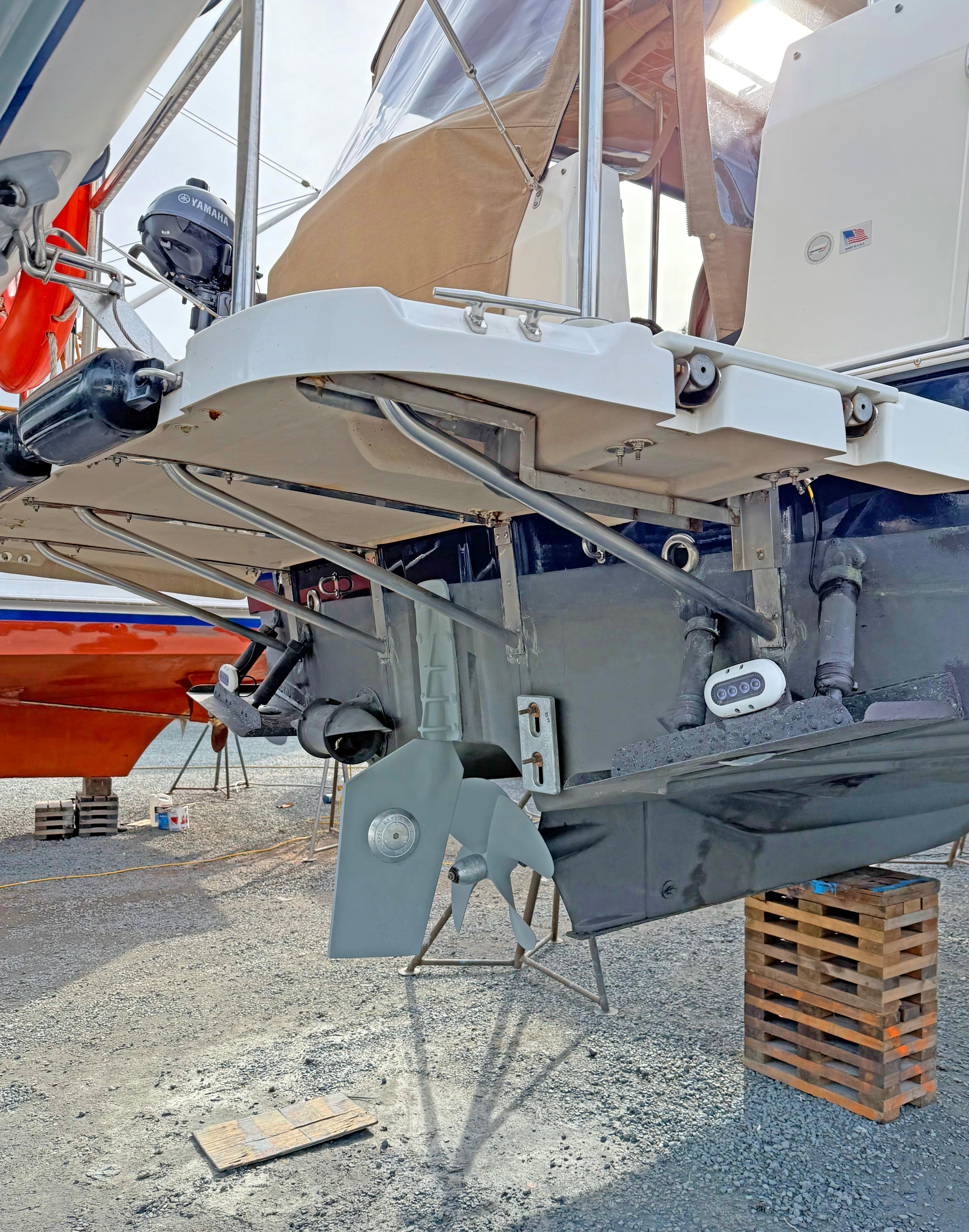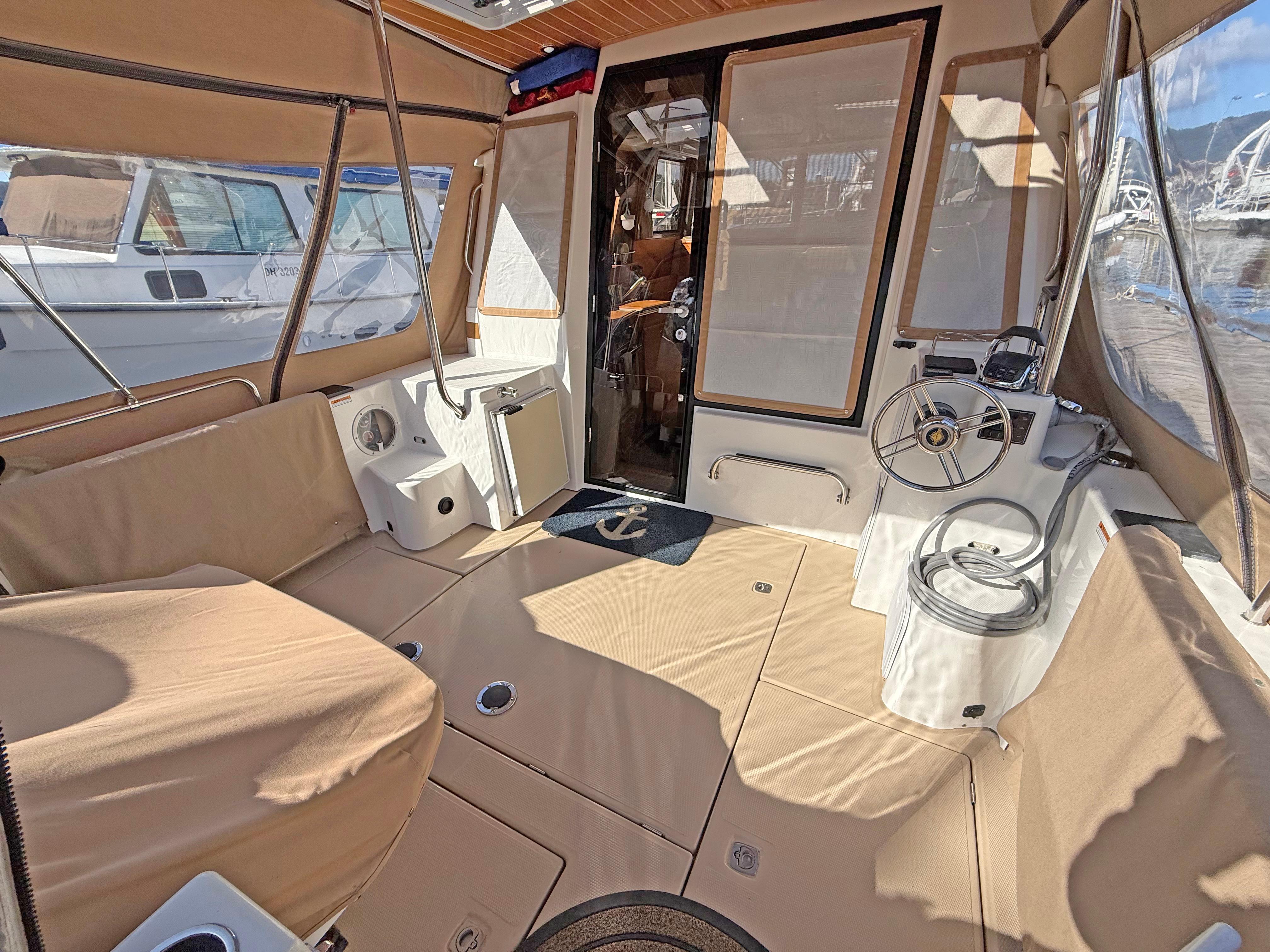 Large swim grid with custom reinforcements.  Integrated swim ladder and built-in fenders. Easy opening door through the transom to enter the cockpit. Custom full cockpit enclosure for all season cruising plus custom bug screens Custom sun awning for the swim platform Remote helm with full controls 2 fold-out cockpit seats and reversible transom seat with custom covers and additional comfortable cushions. 2x Scotty Downrigger plugs and pads 12V Nova Cool refrigerator/freezer Easy-lift crates in the lazarettes Large removable bucket in the engine compartment. Removable cockpit table Rod holders Custom removable cocktail table on swim platform Storage saddles for dinghy standoffs Custom stowable dinghy retriever winch