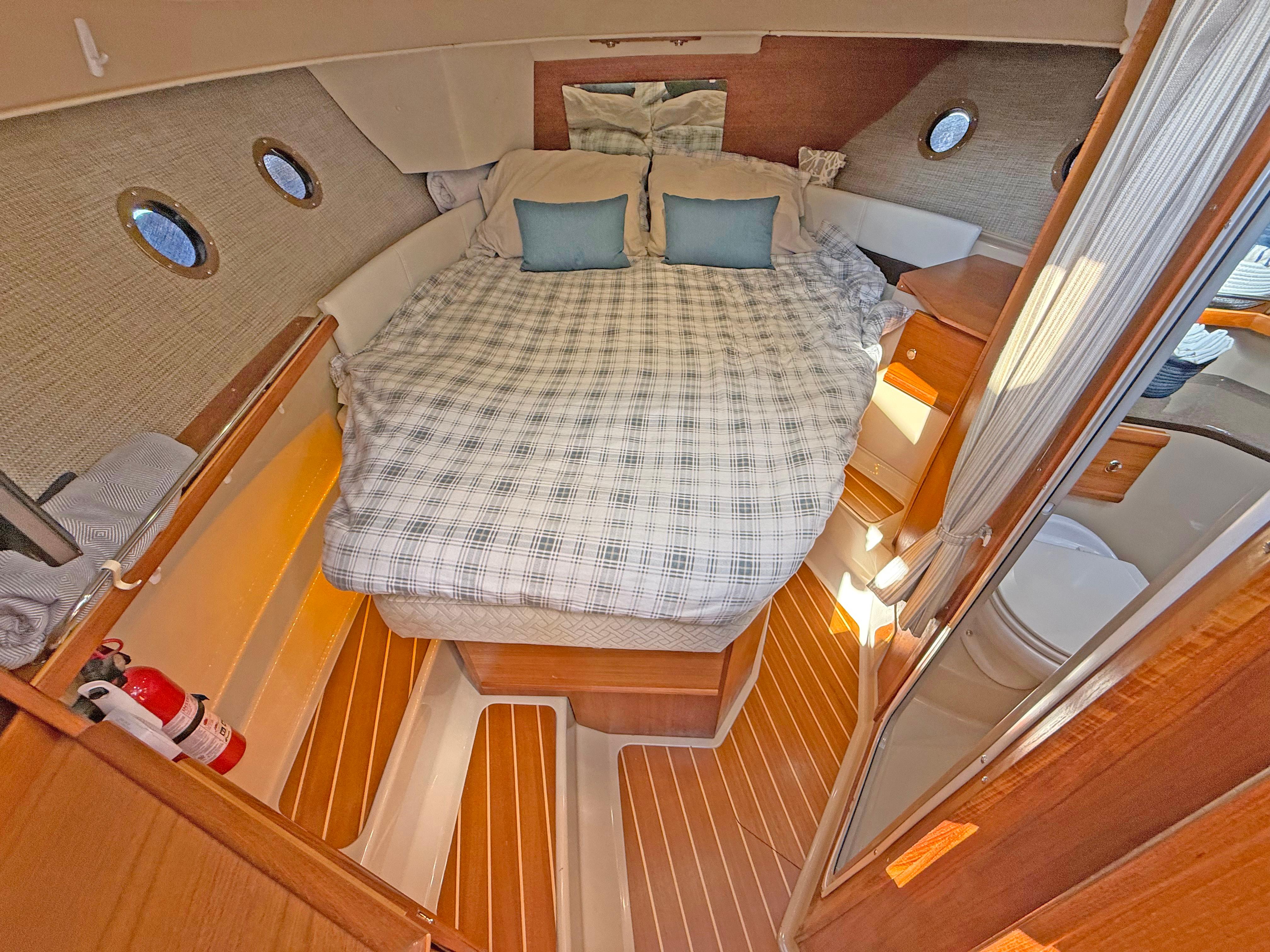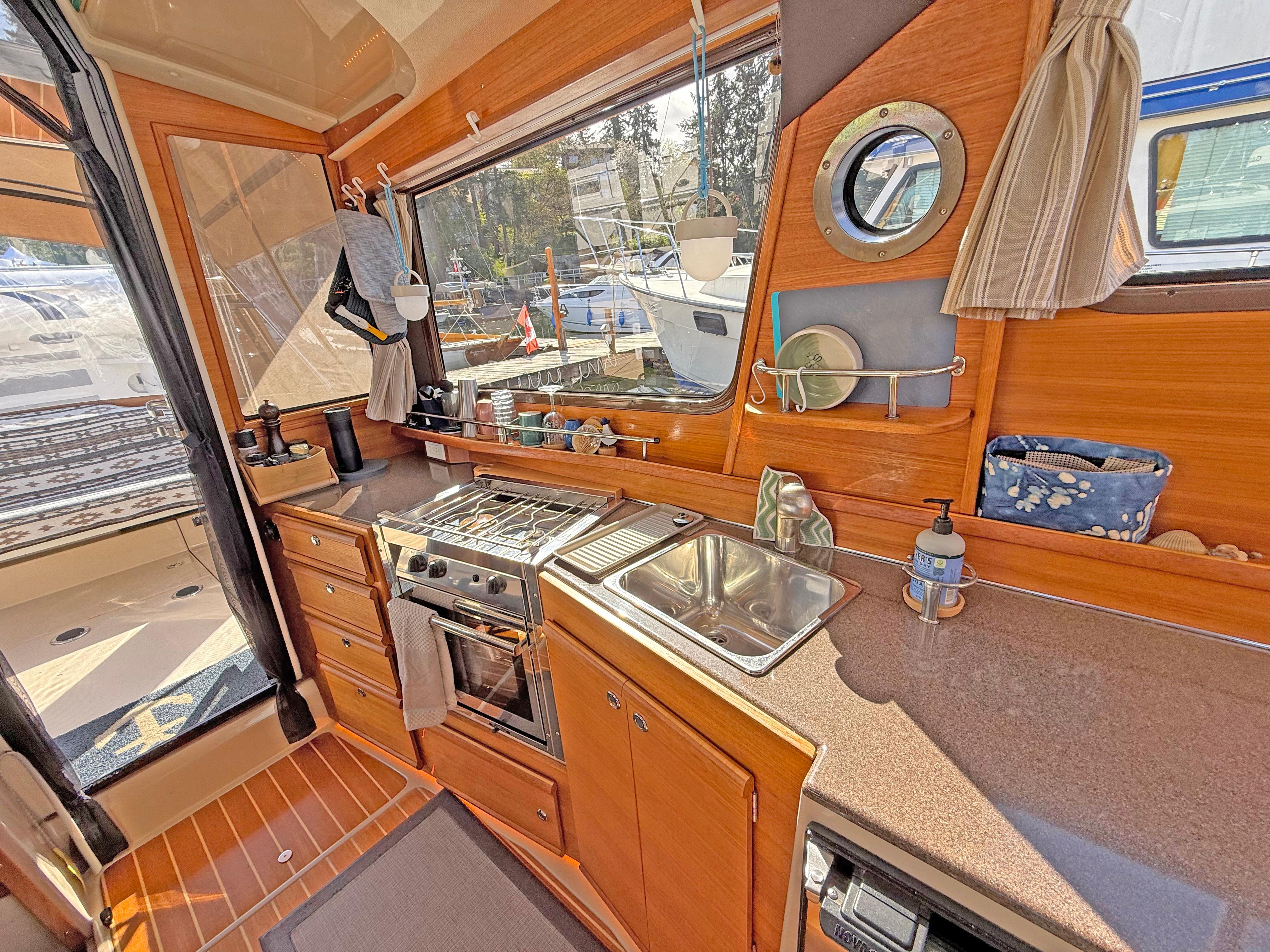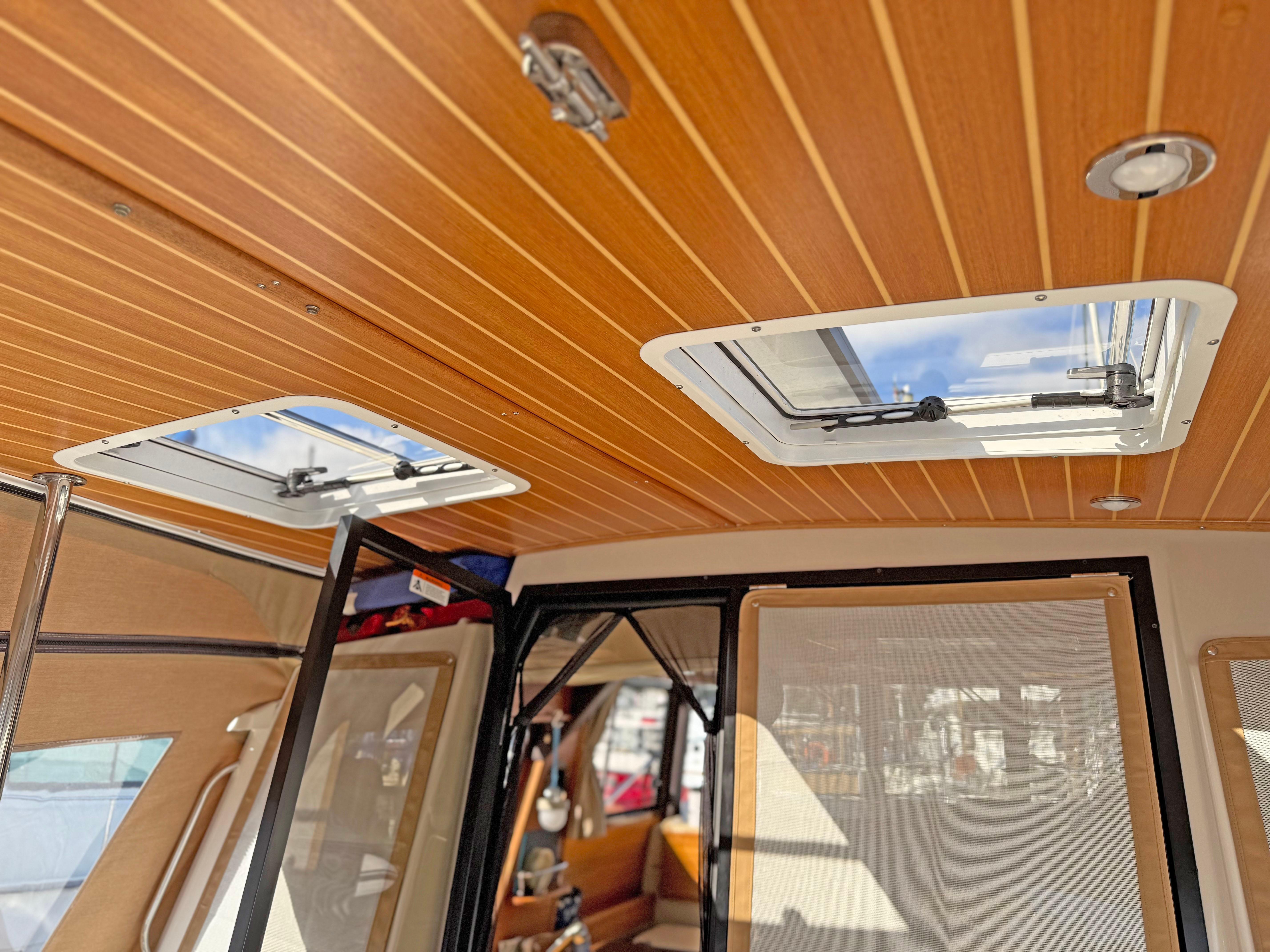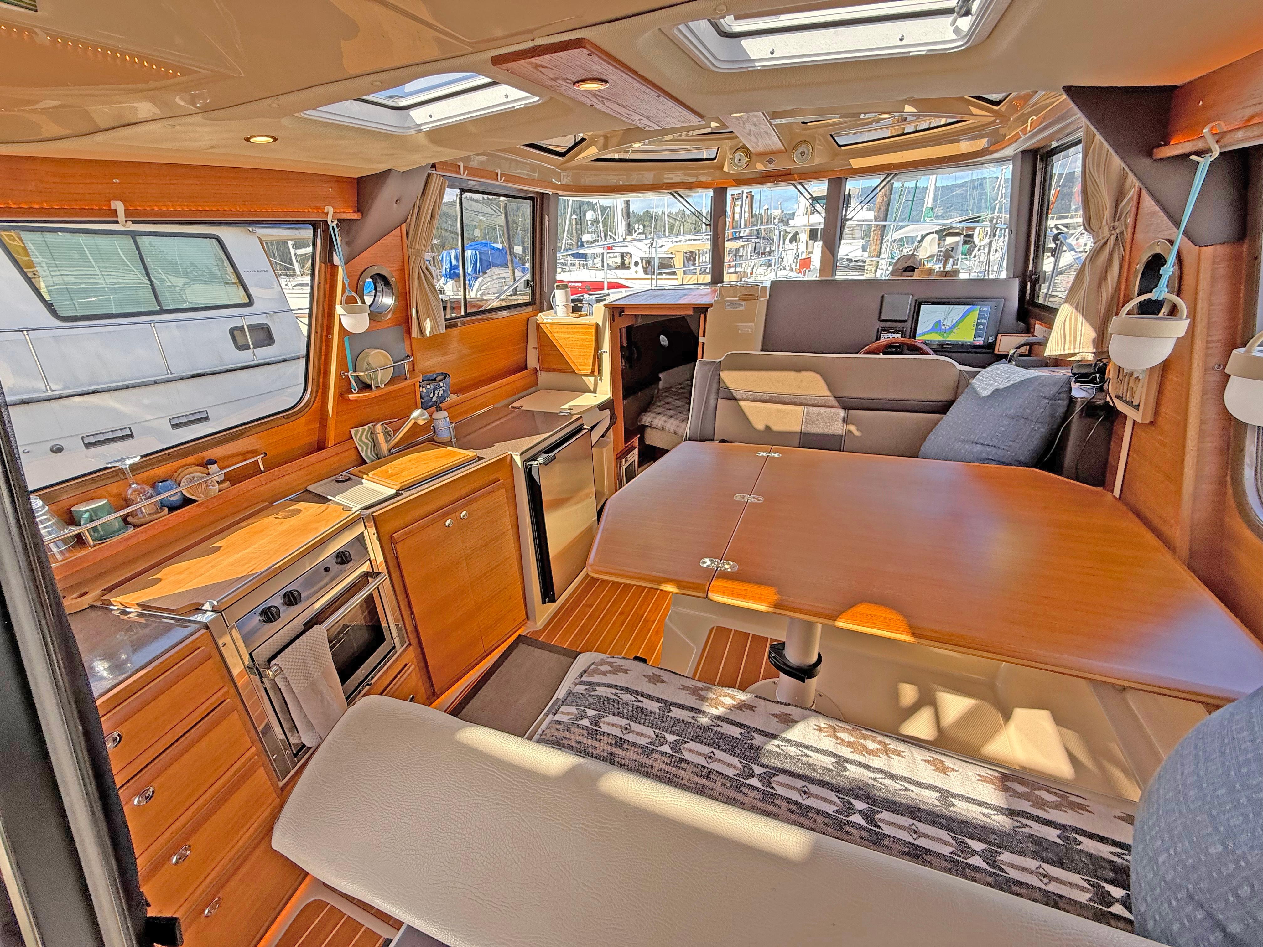 Galley: Functional galley with extensive preparation space and custom storage solutions. Propane stove and oven Nova Cool Refrigerator/Freezer (plus one in the cockpit) Microwave Wine cooler Good storage. Dinette: Adaptable dinette with seating for four with the table low/high, big/small and converts into a berth for two.  Aft seat converts to aft facing to the massive opening aft opening bulkhead. Master cabin: Queen-sized island berth with memory foam and custom improvements. Extensive storage through out the master cabin including under the bed.   Guest cabin: midship with a queen mattress.   Head: Enclosed electric head with shower.  Heat: Multiple sources of heat.  Primarily a Webasto diesel forced air backed up by a bus heater off the engine.  Also an Espar diesel heater to heat water when the engine is not running Entertainment: Fusion 750 with multiple zones plus two 22” TV’s. Saloon TV rotates to face the cockpit. Stereo also controllable through Garmin MFD. Indirect lighting throughout as well as thoughtful courtesy lighting. Custom storage solutions throughout the vessel. Custom bug screens for the doorway and the large aft opening window. UV screens for the windows