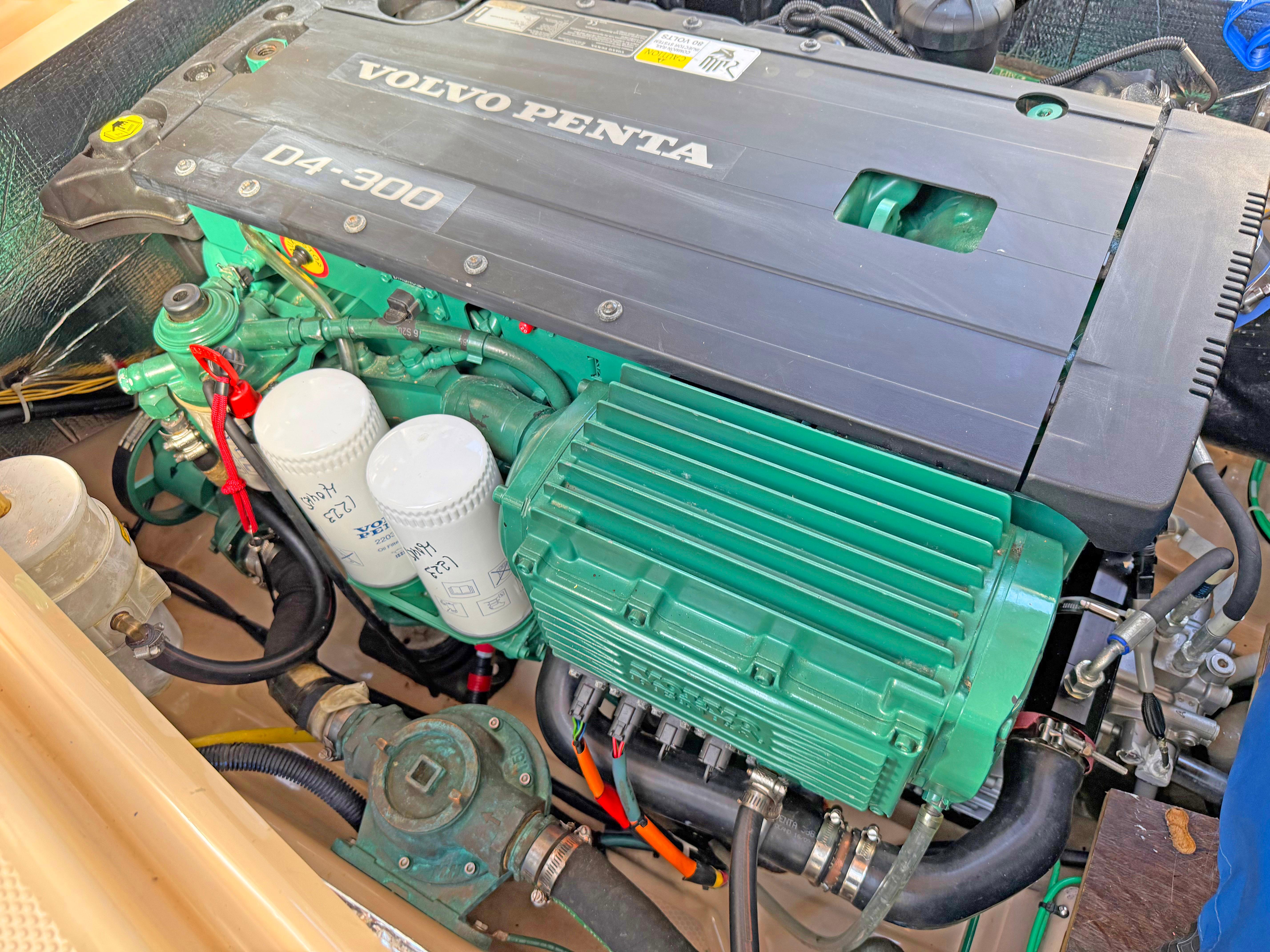 Volvo Penta D4-300 Common-Rail Diesel – 300 HP.  Hours 1230  Bow and Stern Thrusters with remote control pennant. Full colour engine display Easy access with an electric opening hatch. Low-temperature engine room heater for winter protection Electronic throttles – located at the helm and cockpit Trim tabs