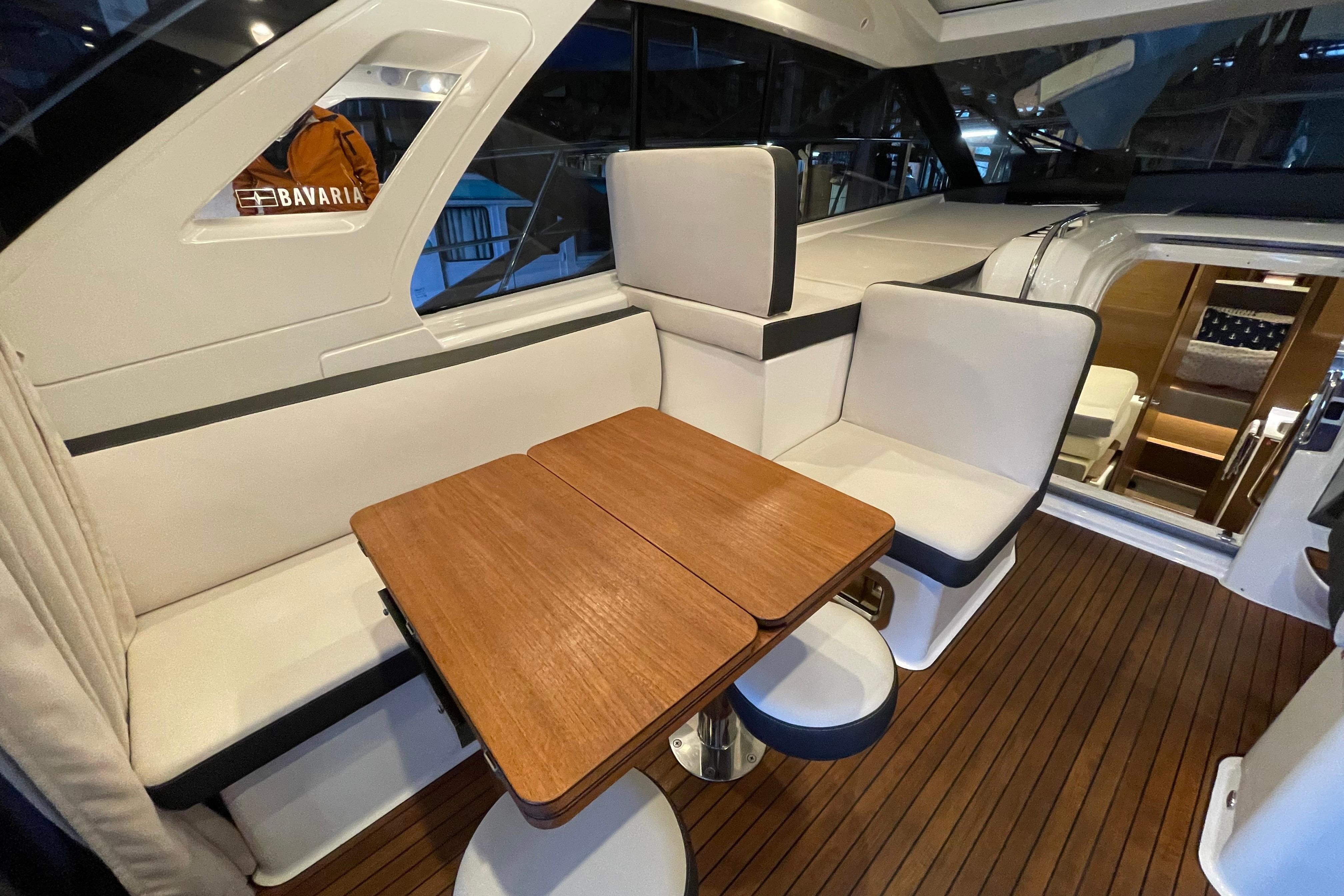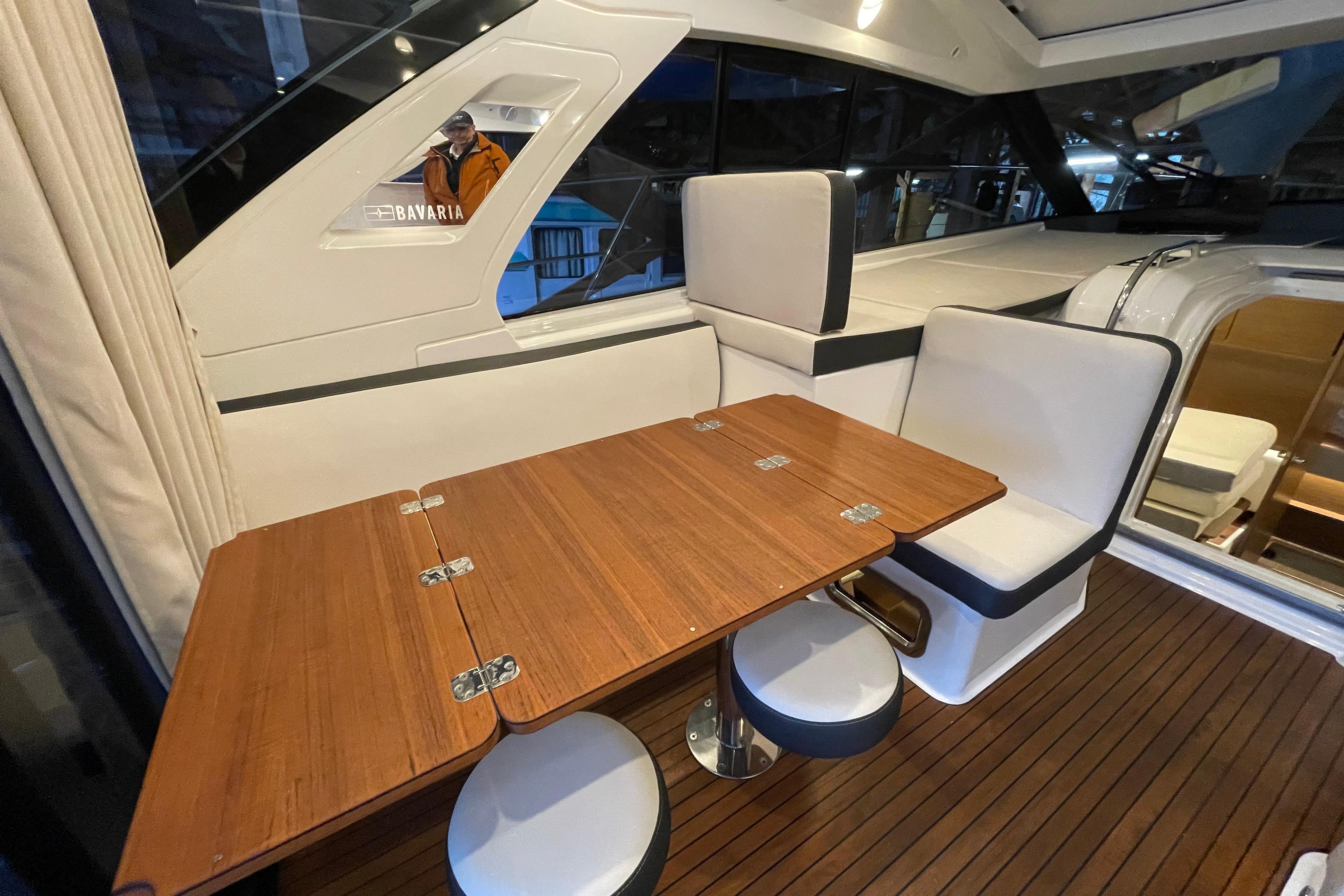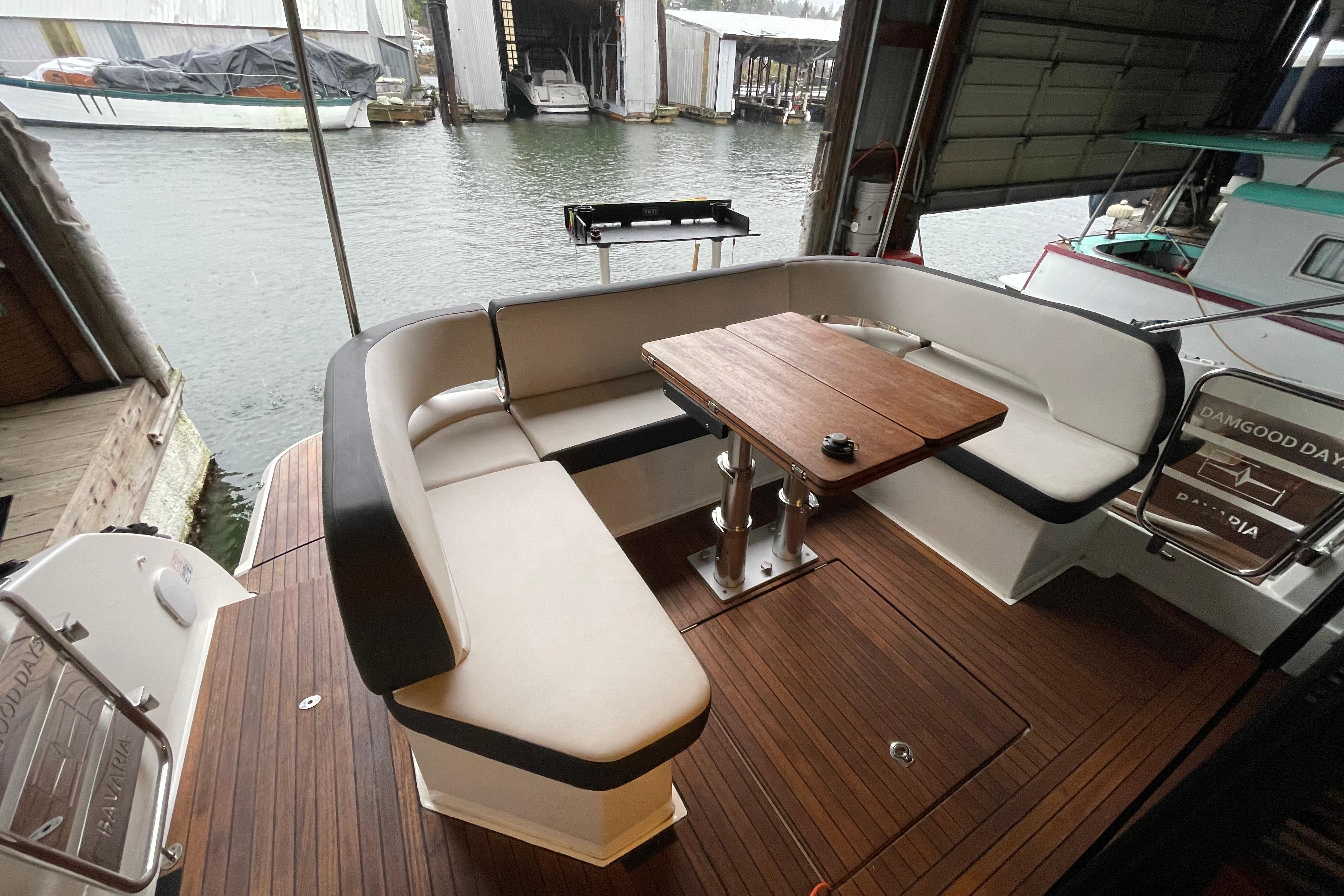 - Open the sliding doors to the aft deck which features an outdoor U-shaped settee and table and access to the side decks