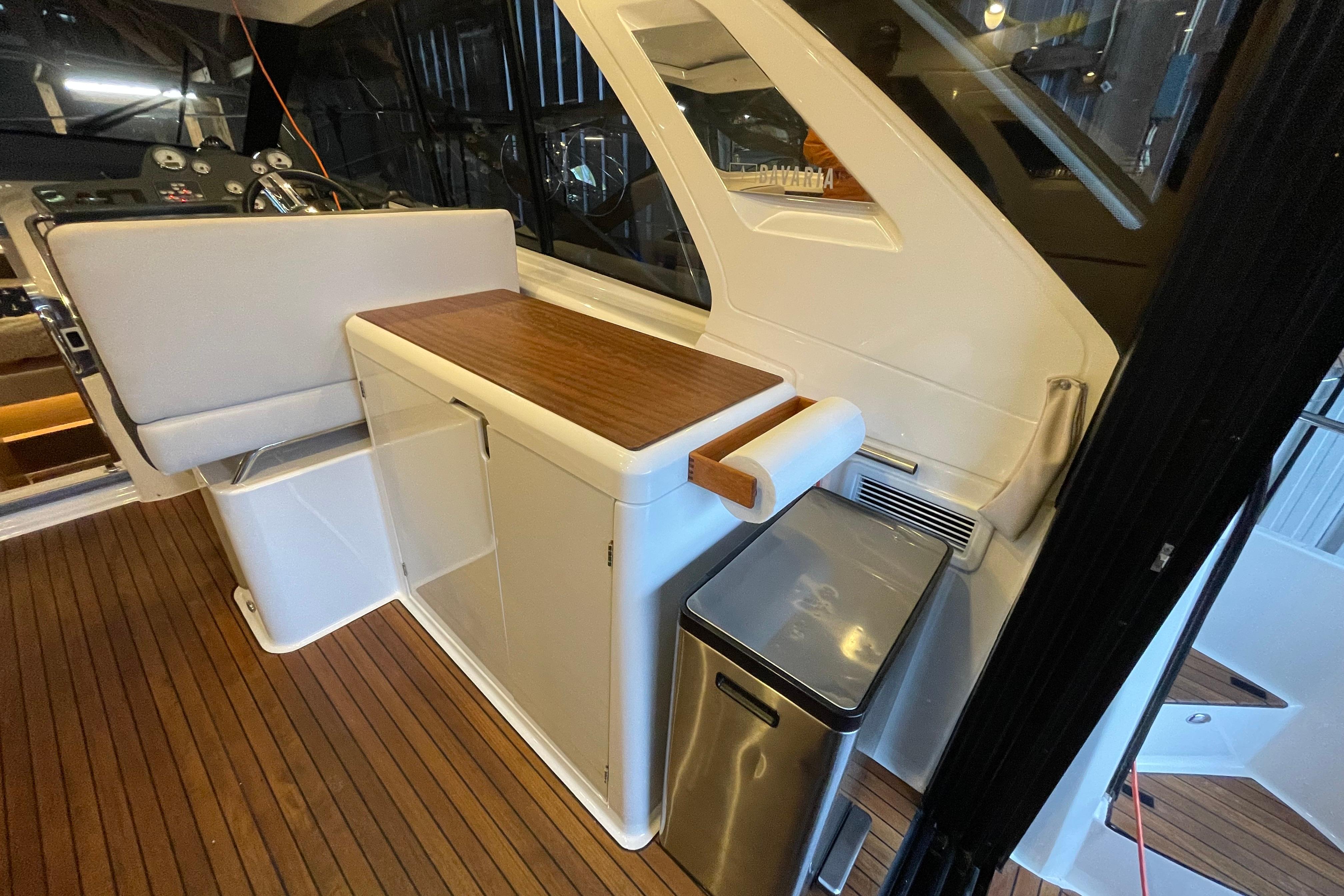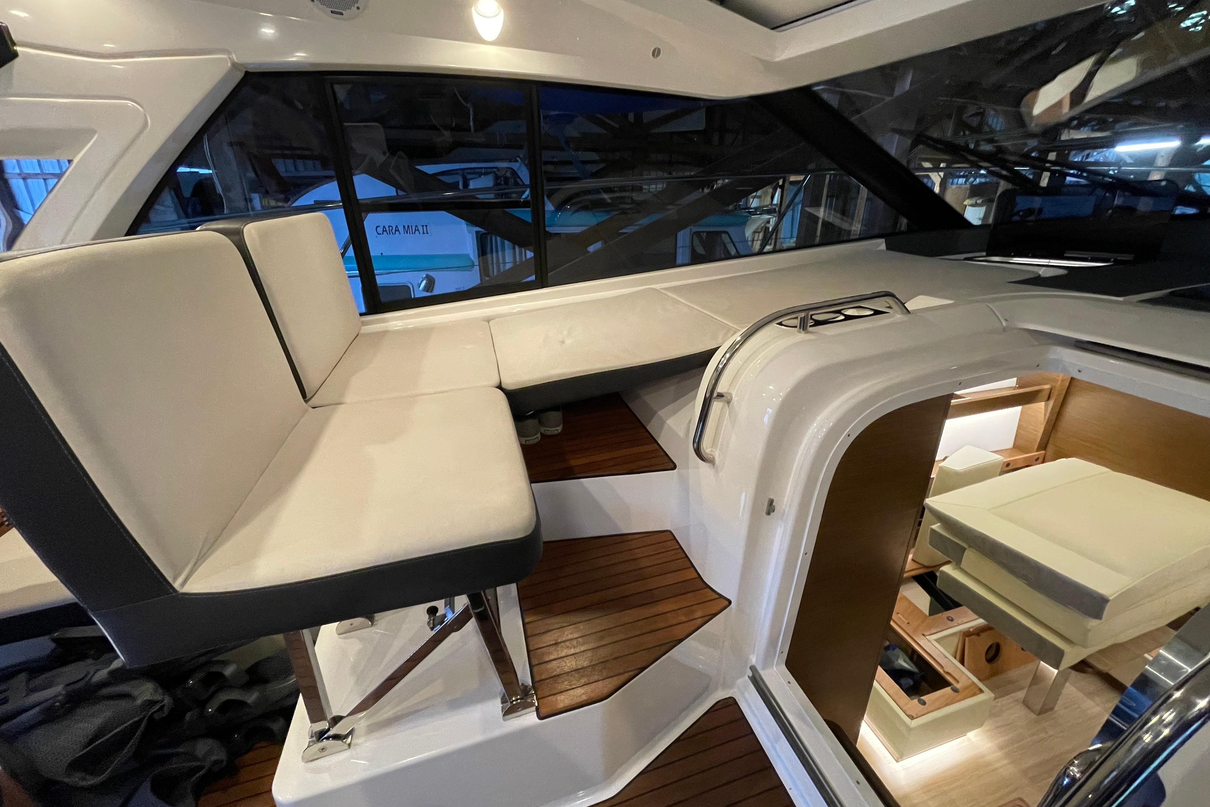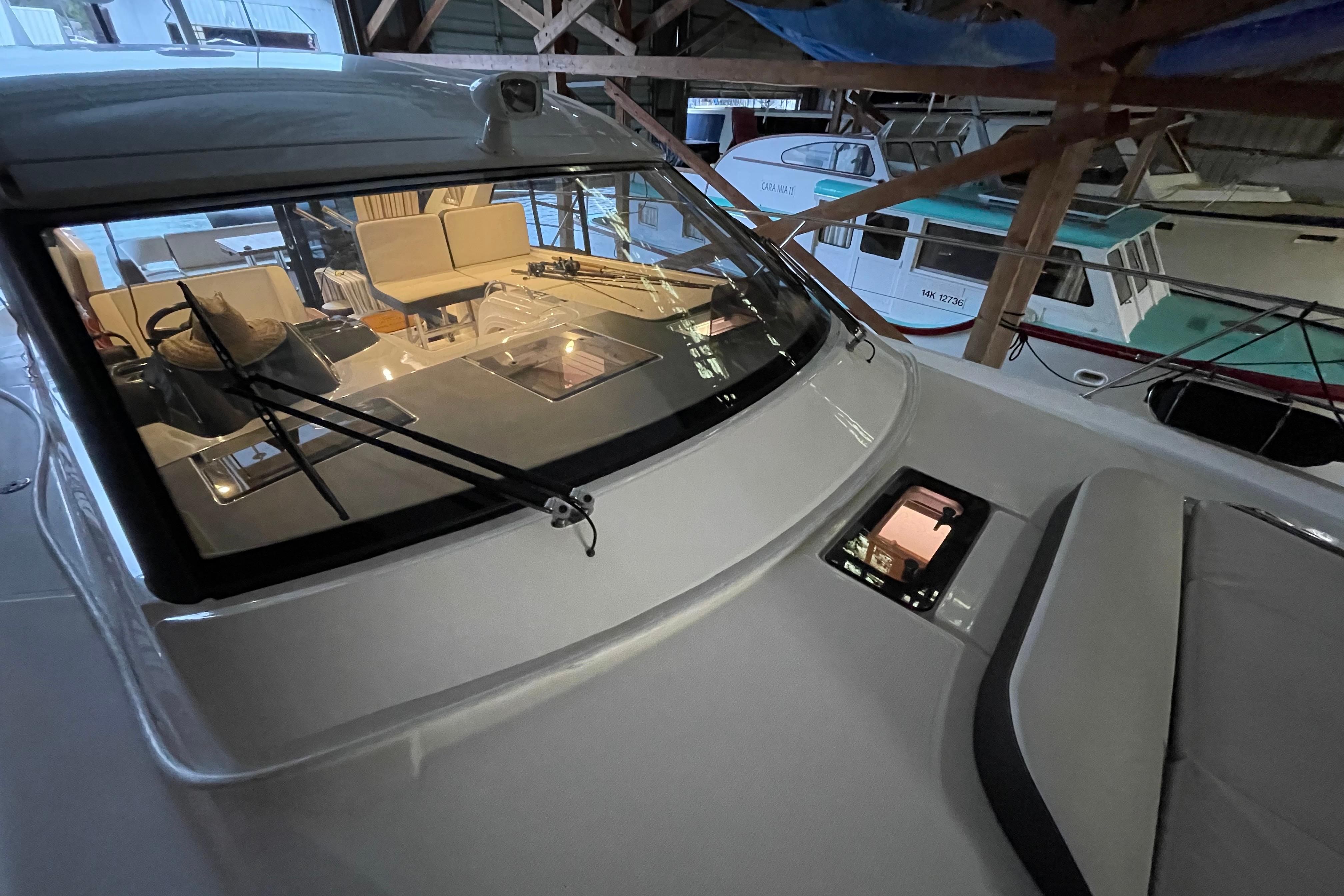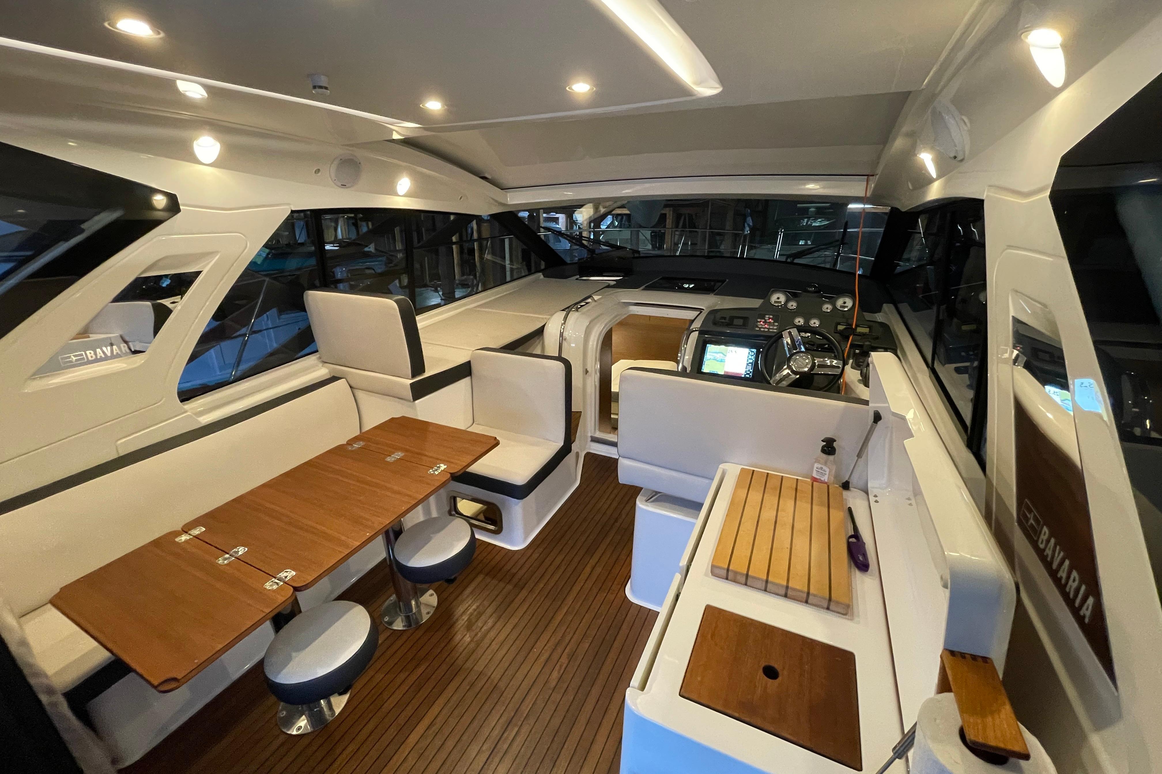 - A fully enclosed helm and seating area with a hard top enclosure including sliding glass doors separating the enclosed area and aft deck