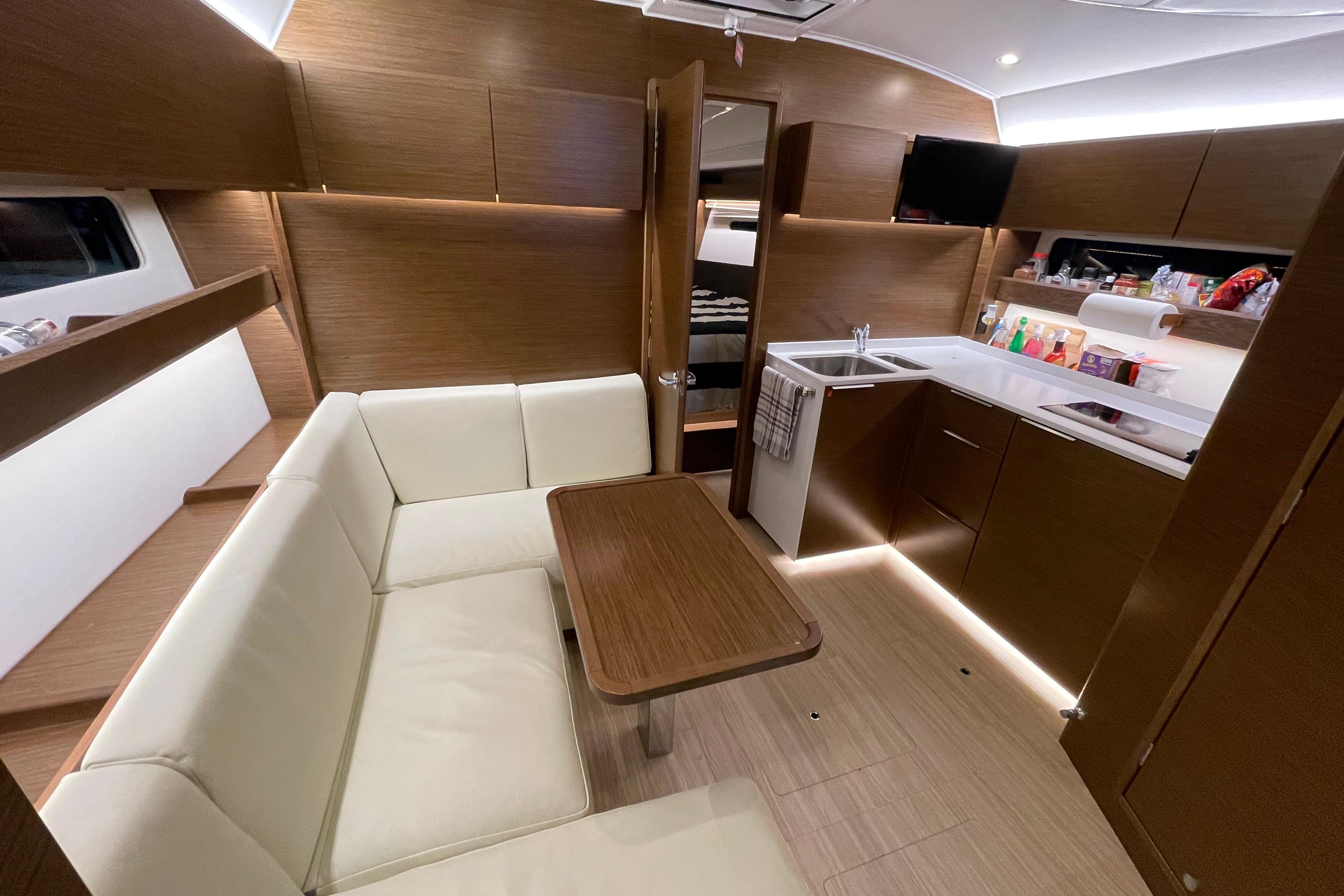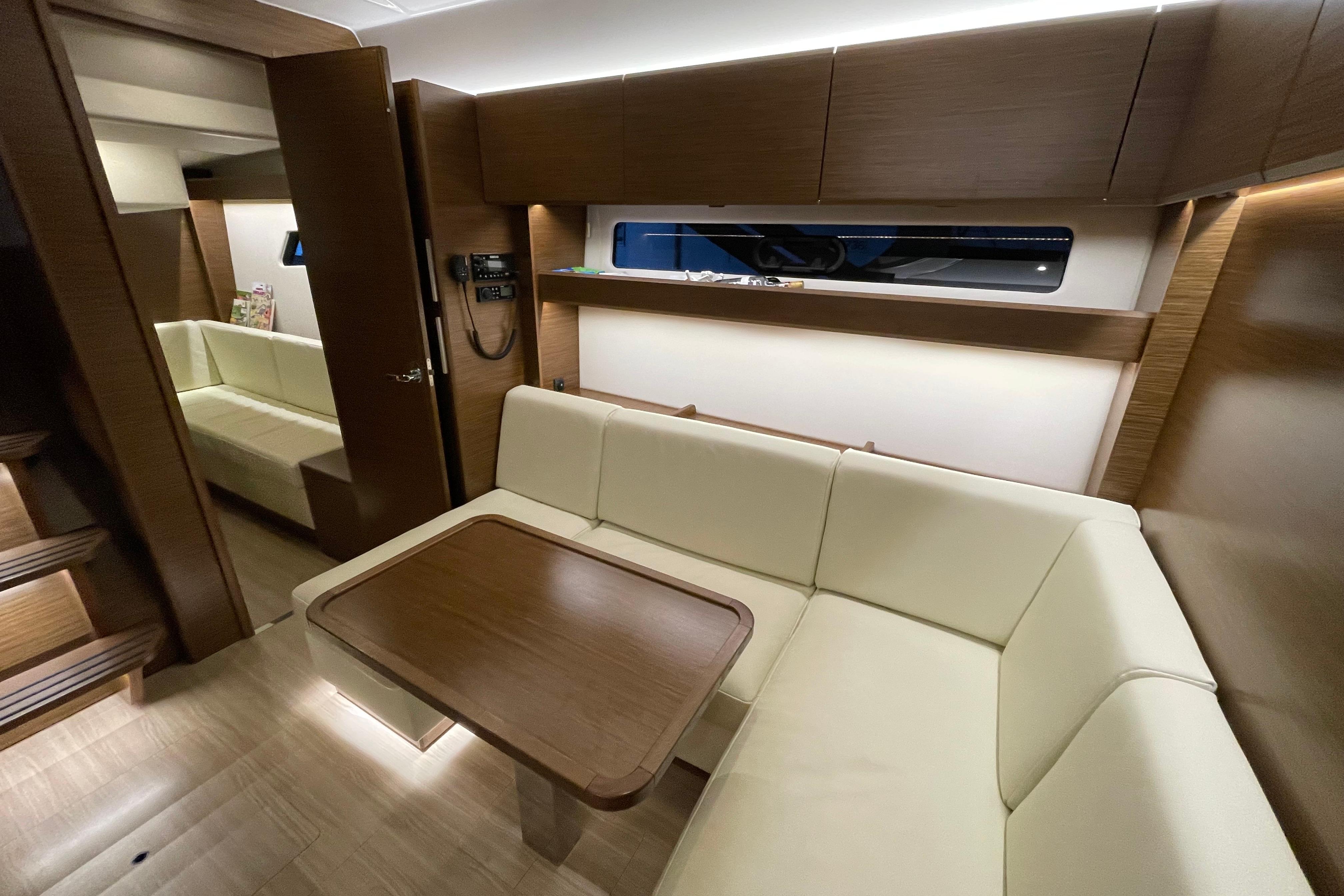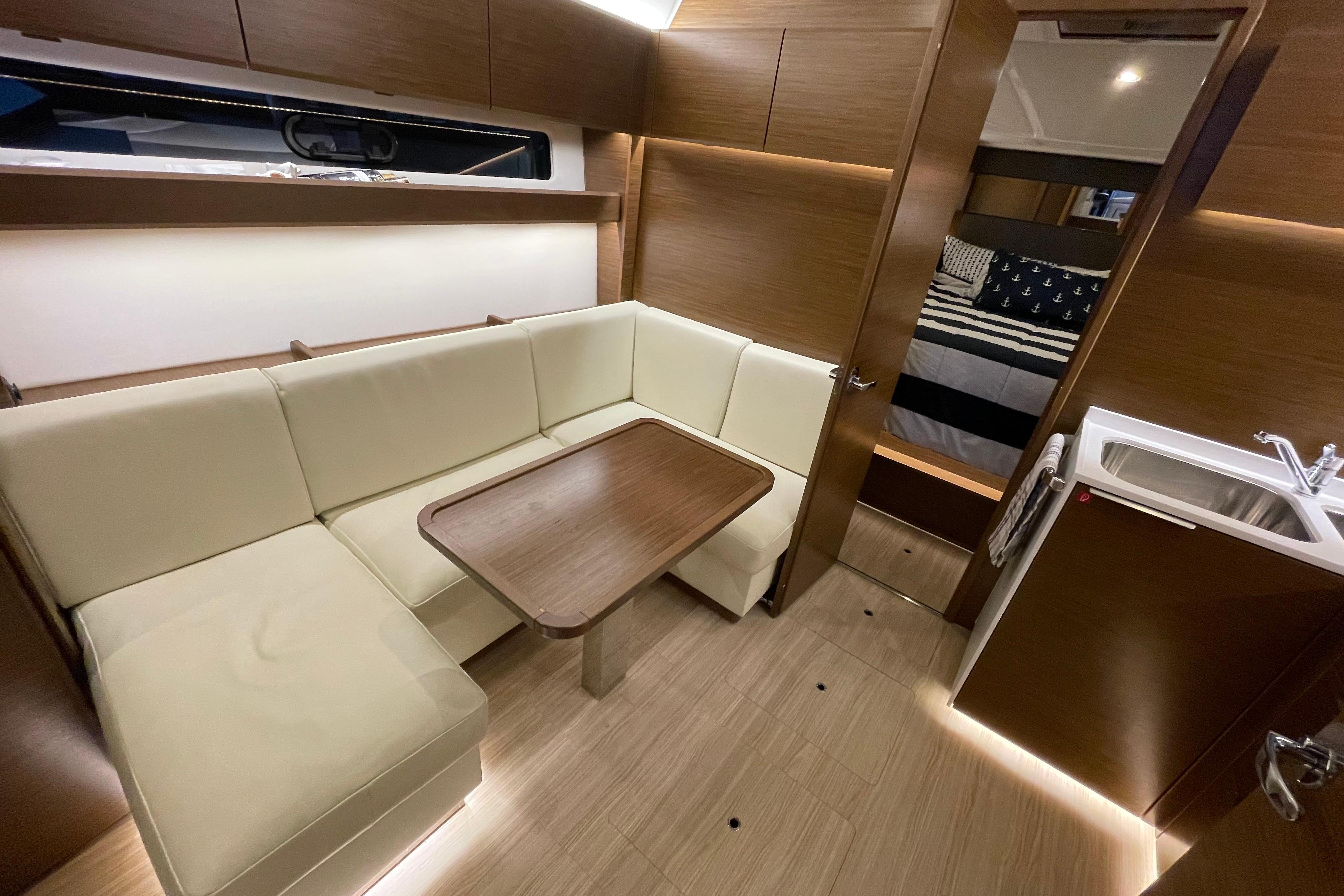 - The inboard seat flips from forward facing to aft facing to add another seat around the dinette table