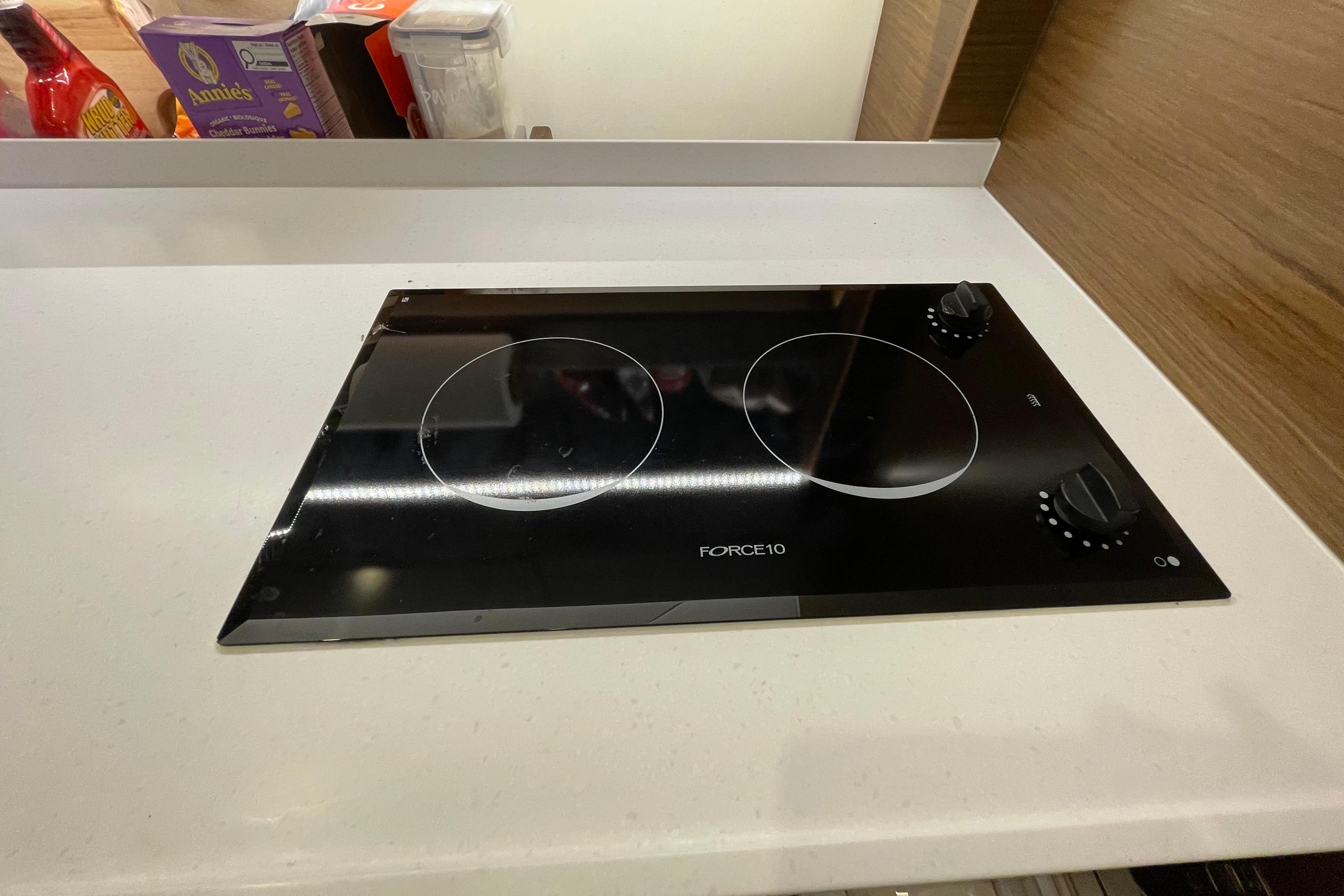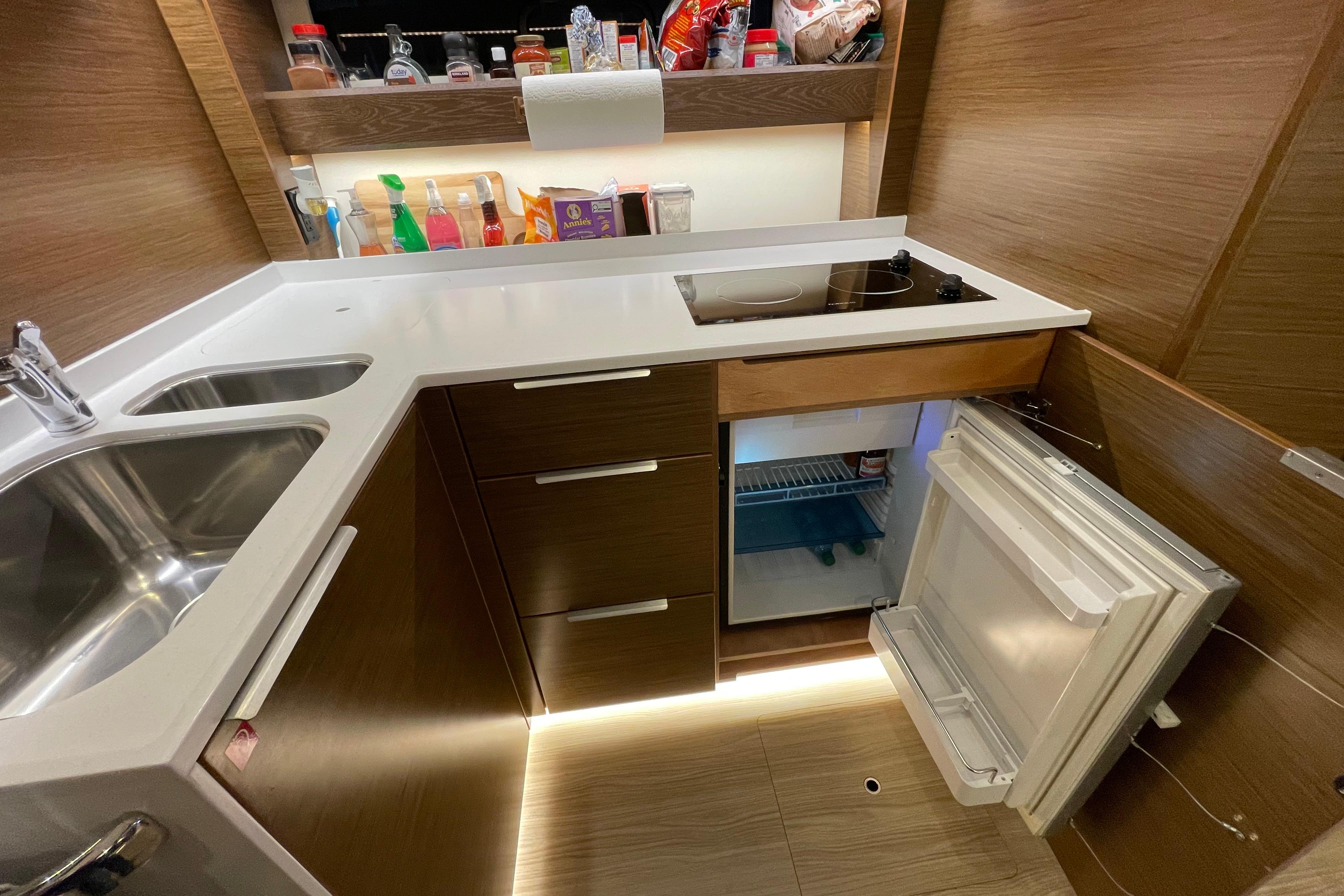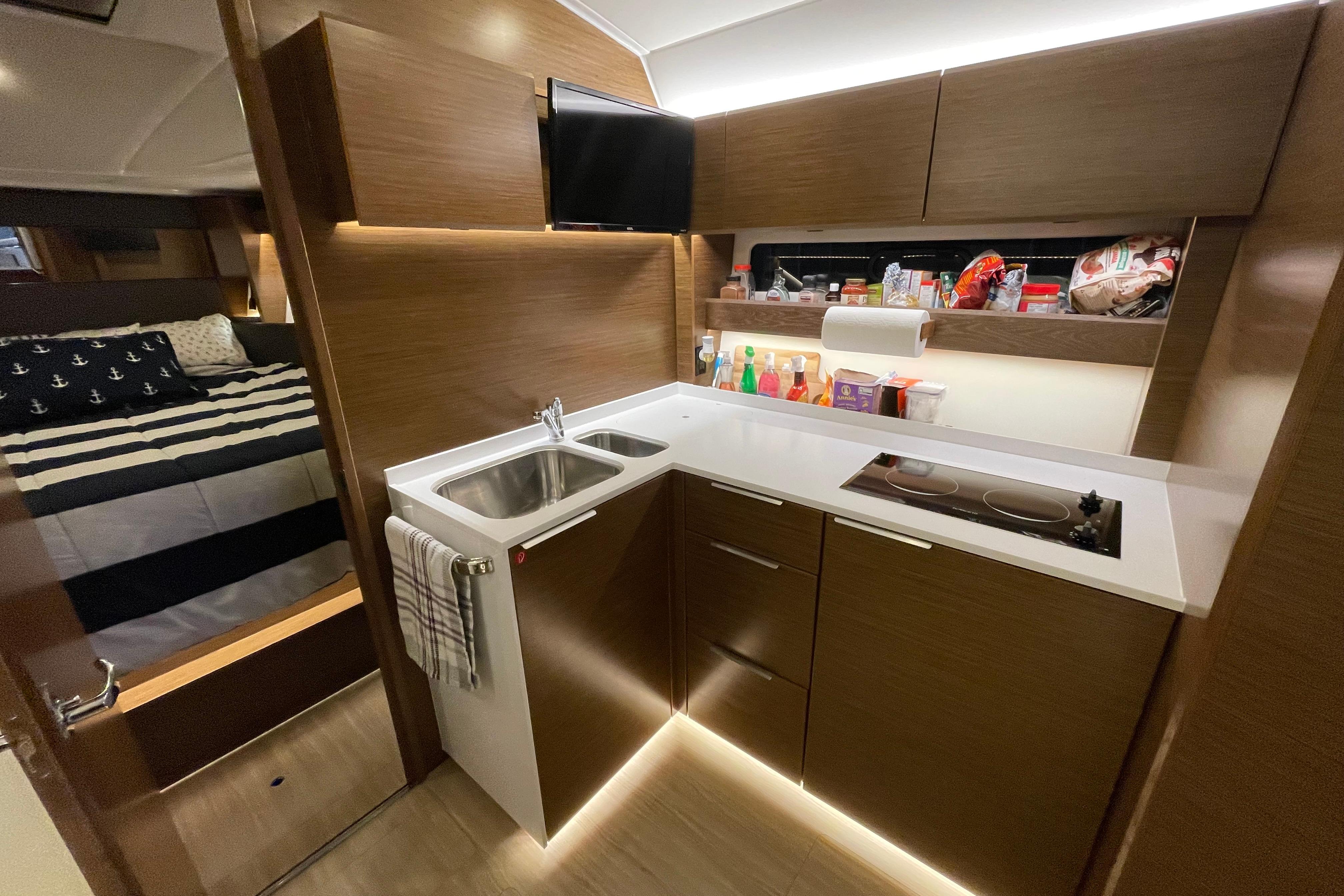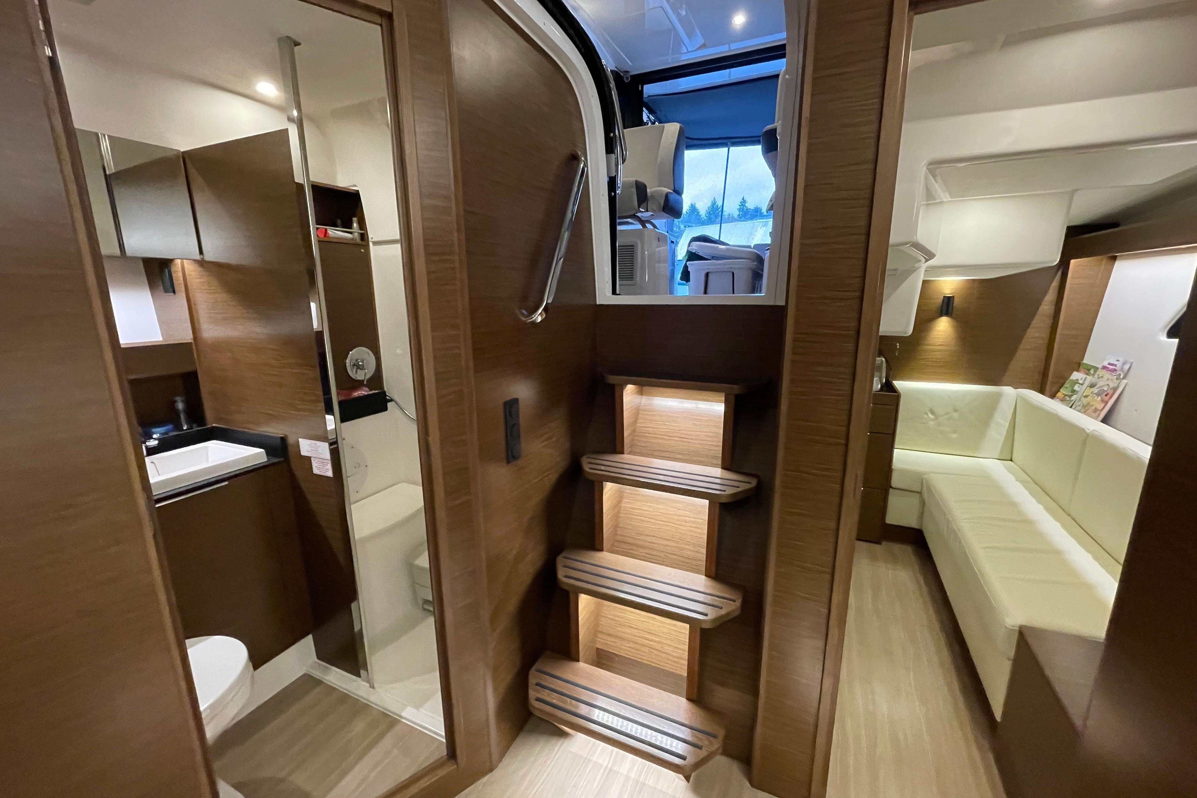 - Two steps down from the helm area accesses the salon, galley and cabins below