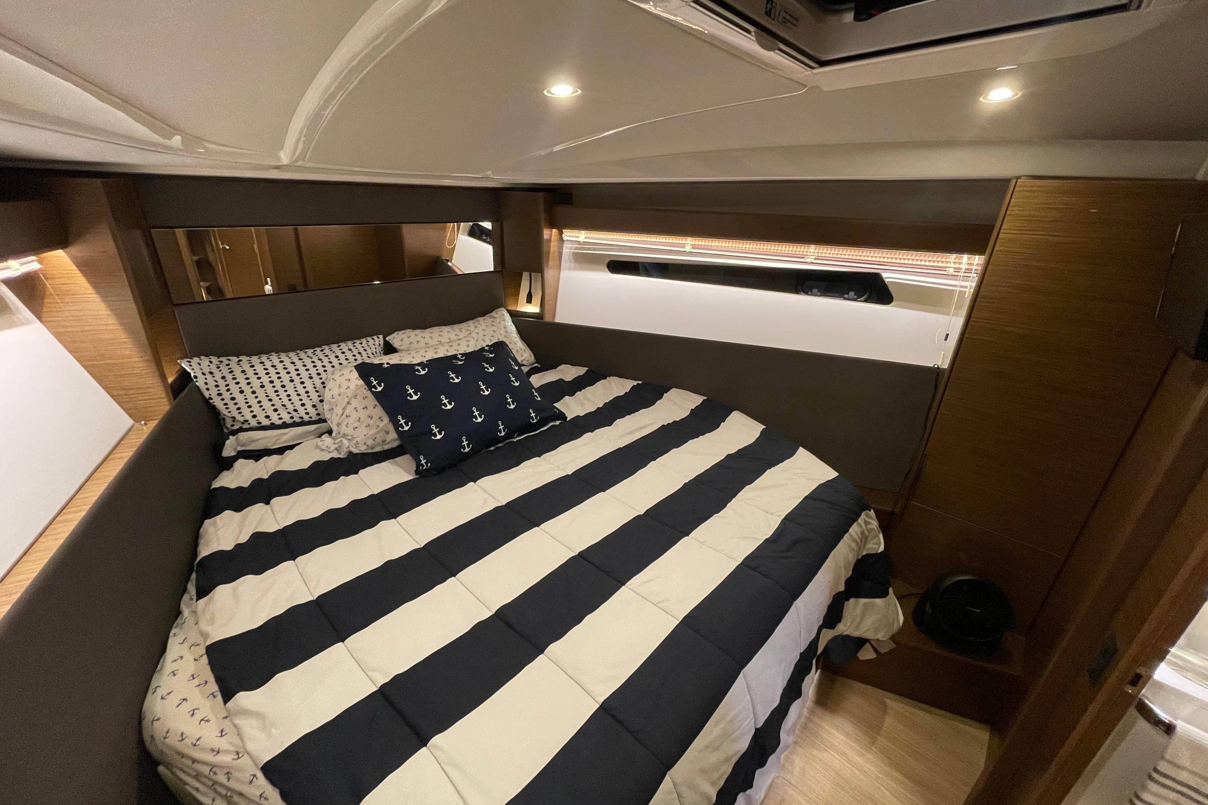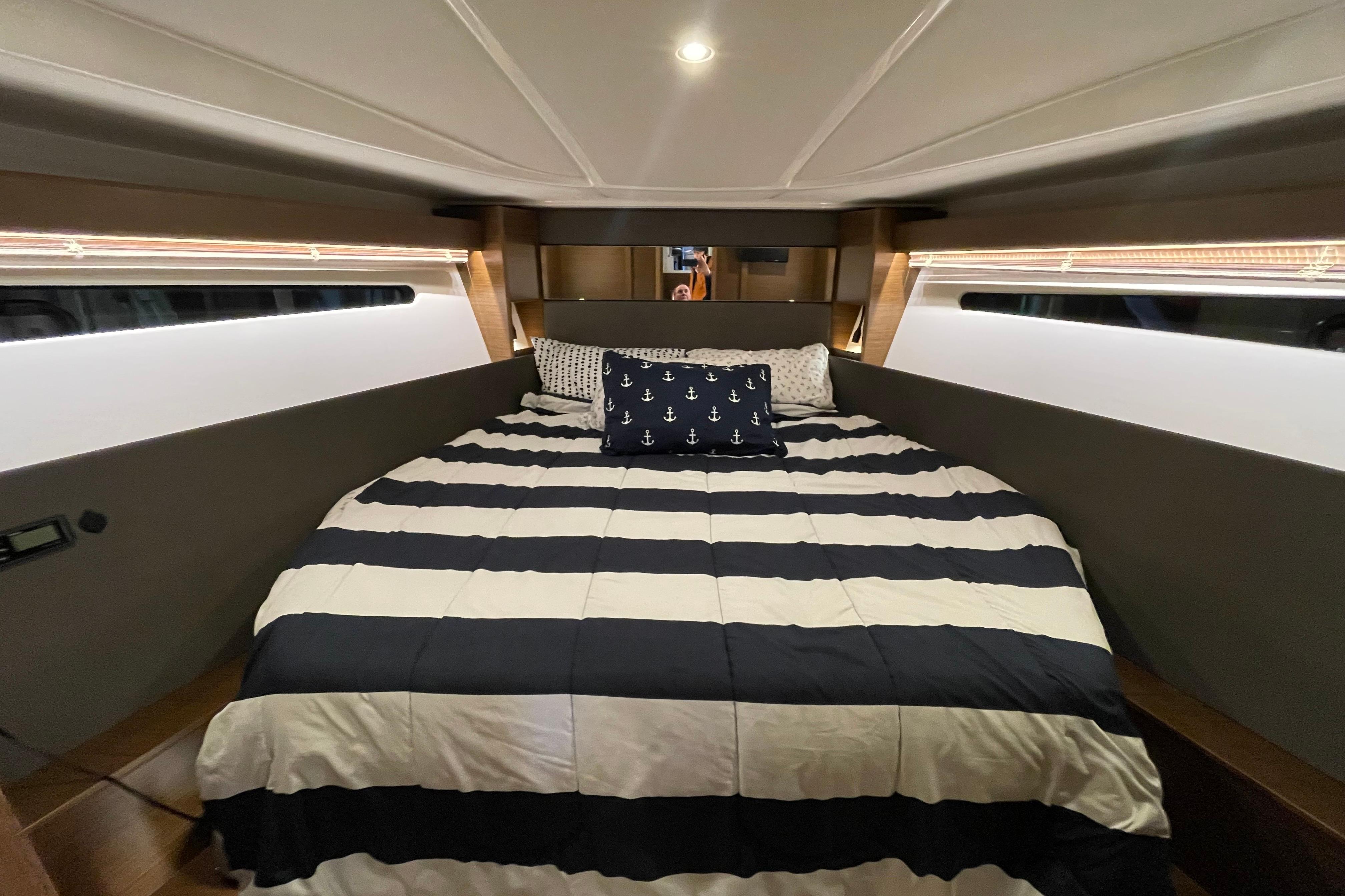 - Owner’s Cabin: forward features a walk around king-sized island bed