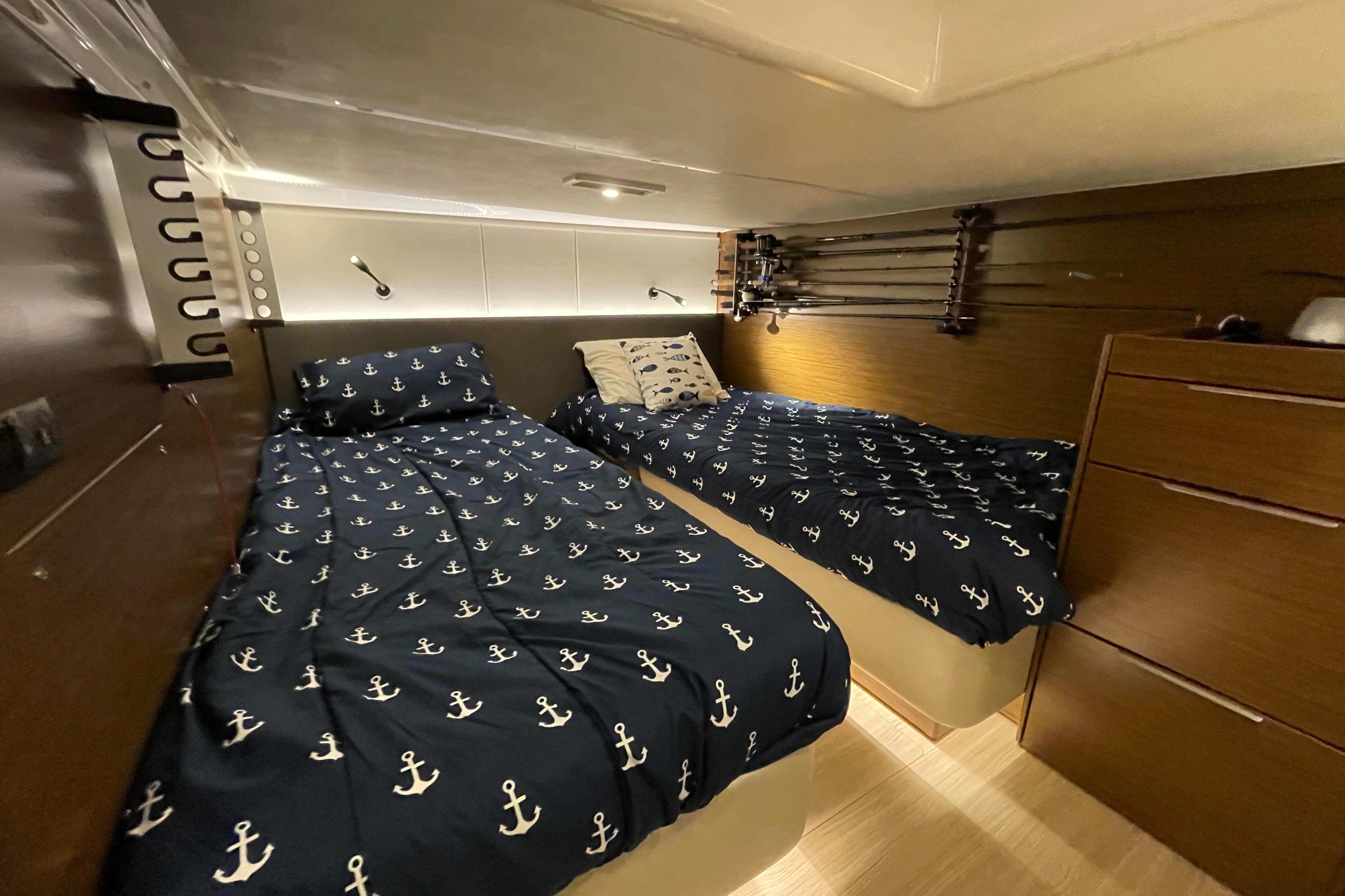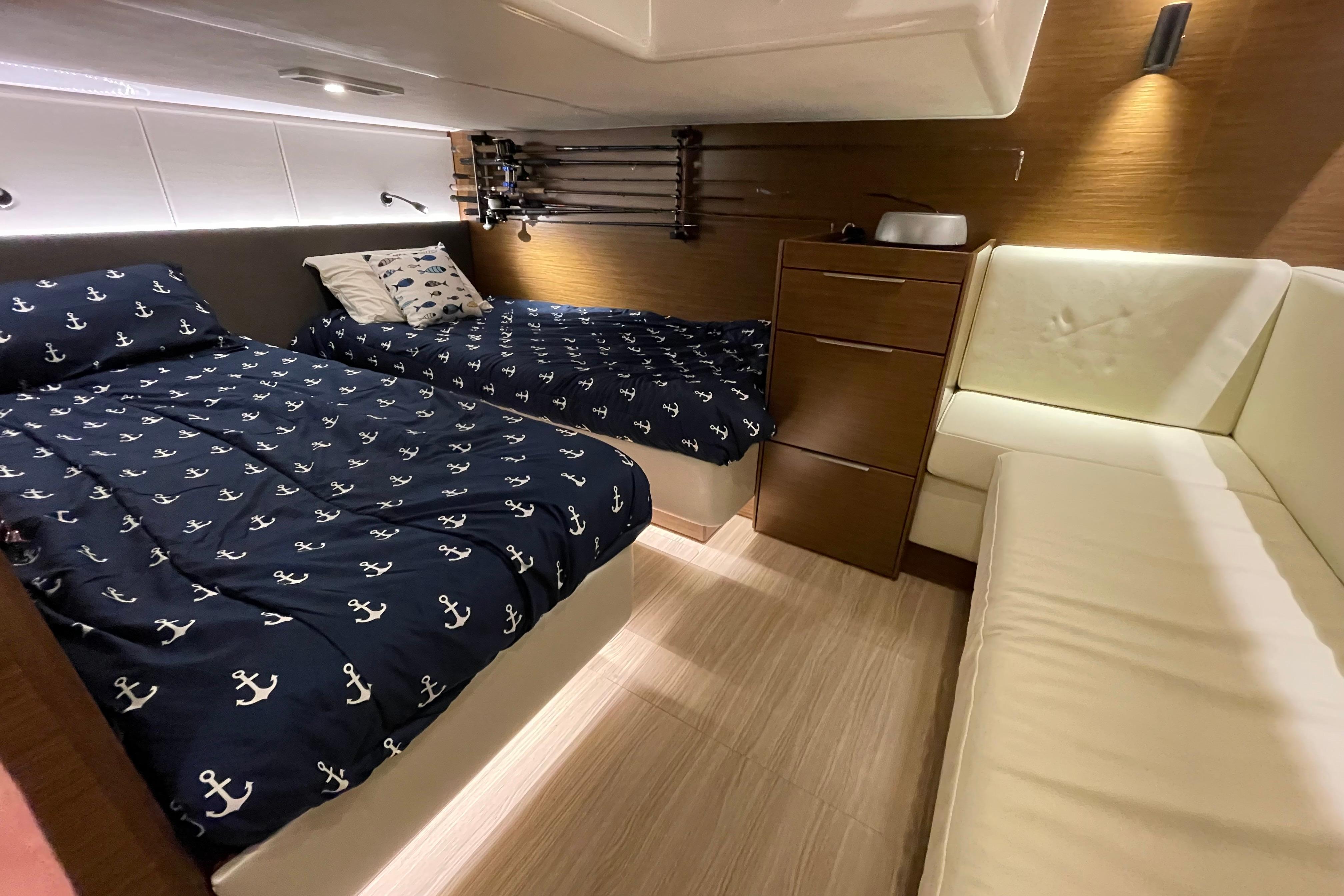 - To port features two crew seats that converts to a lounger for the outboard seat