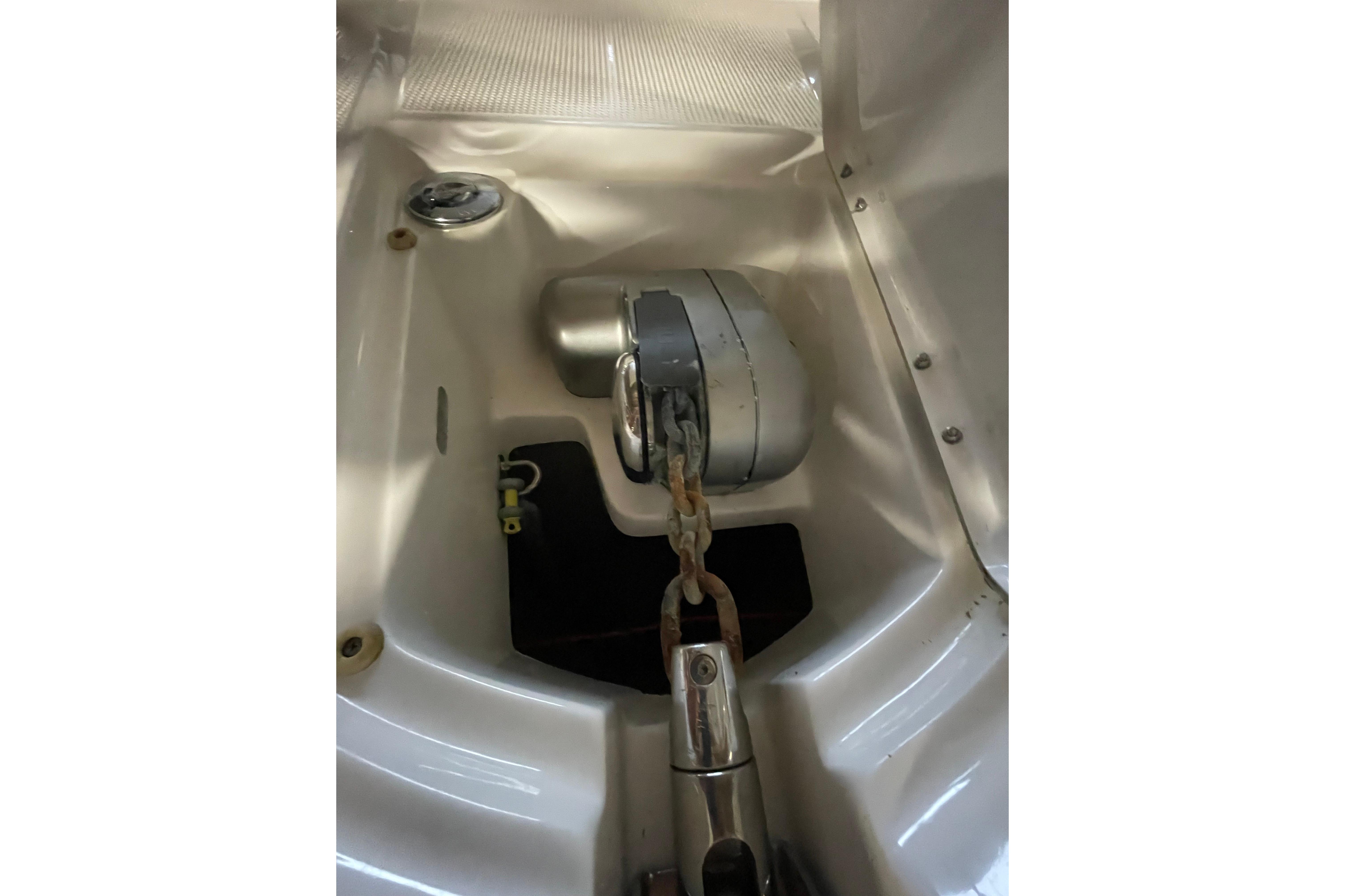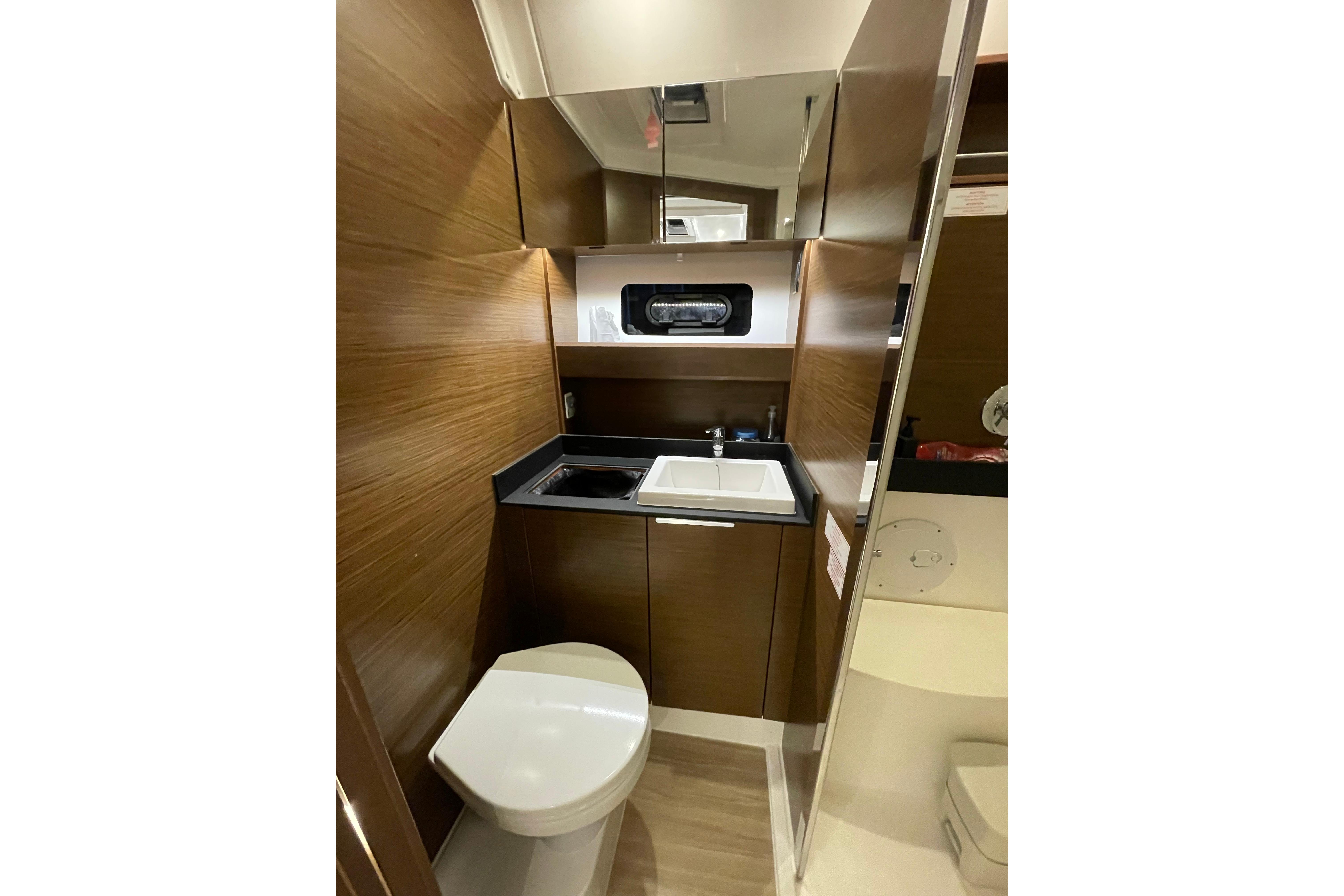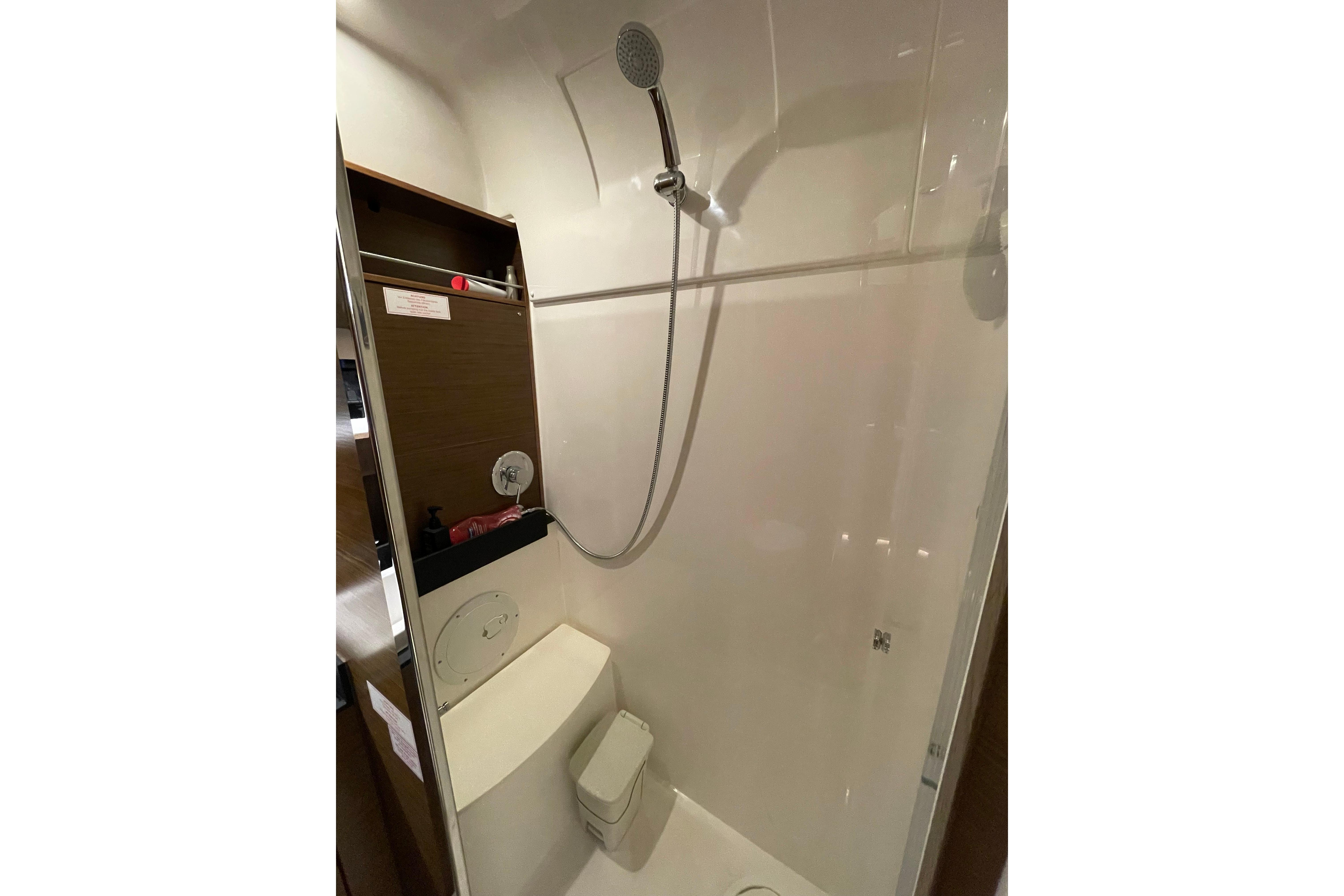 - Toilet: electric Jabsco, freshwater flush to holding tank which is gravity fed to empty overboard or deck discharge