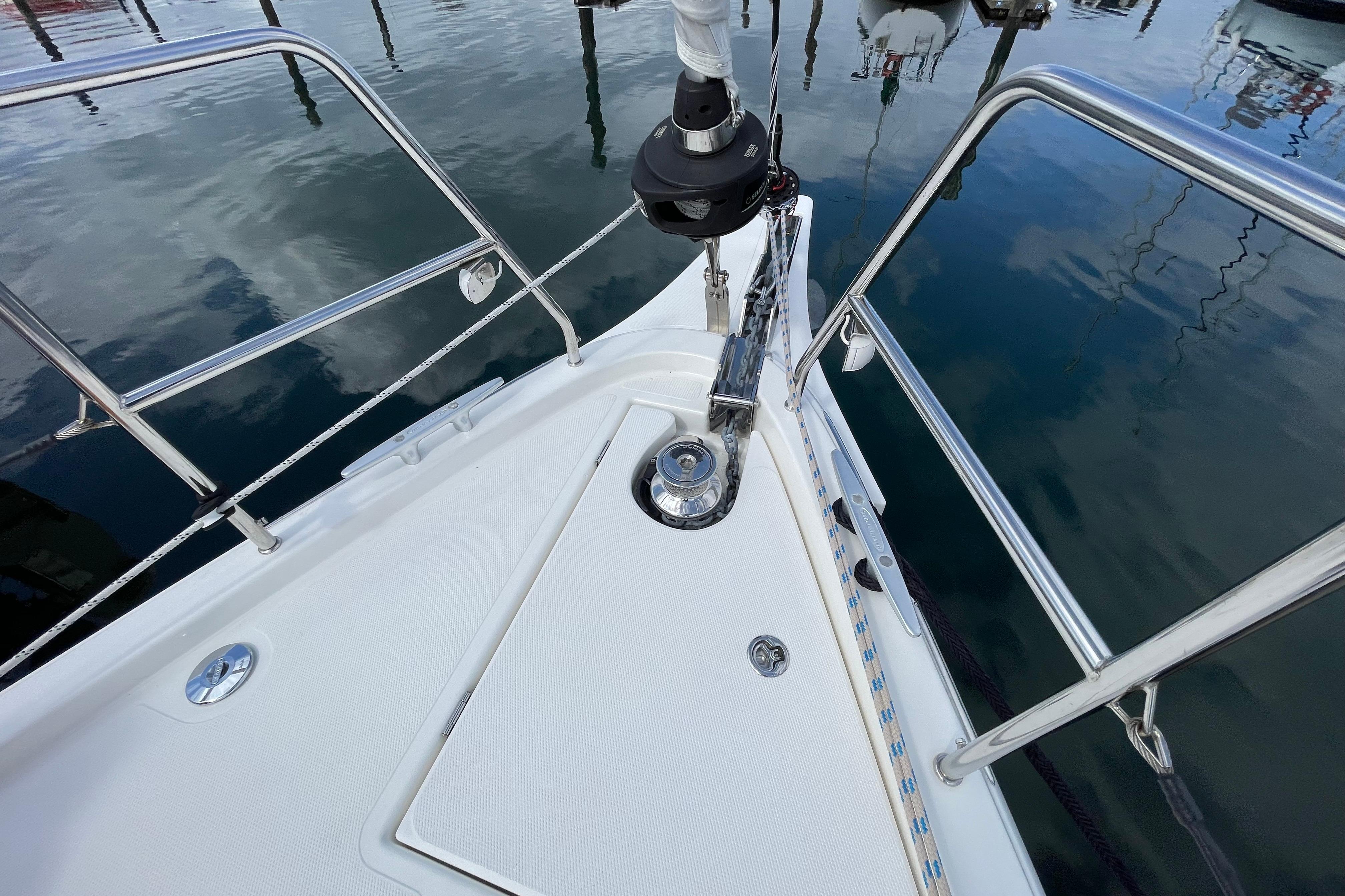 - Stainless steel pulpit and pushpit, double lifelines, midship boarding gates