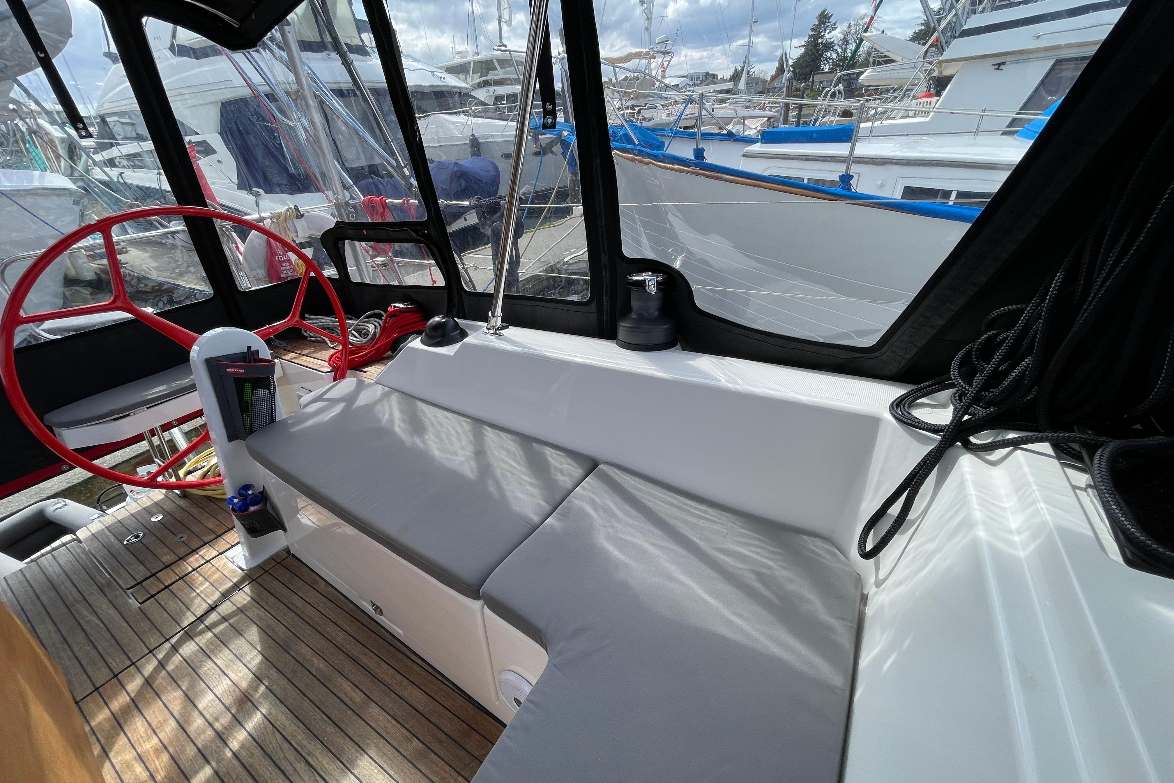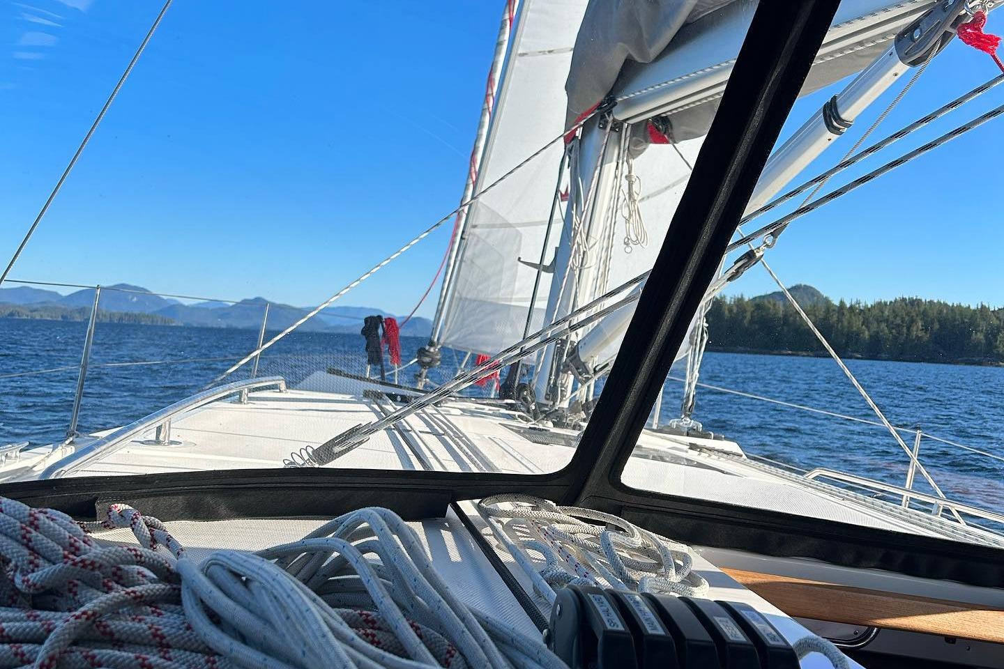 The sail plan is perfect for the PNW. The full battened main sail in a lazy bag gives the vessel the additional power and sail area required. The self tacking jib helps for short handed sailing and the code zero which is controlled from the cockpit allows for fun and easy sailing off the wind.
