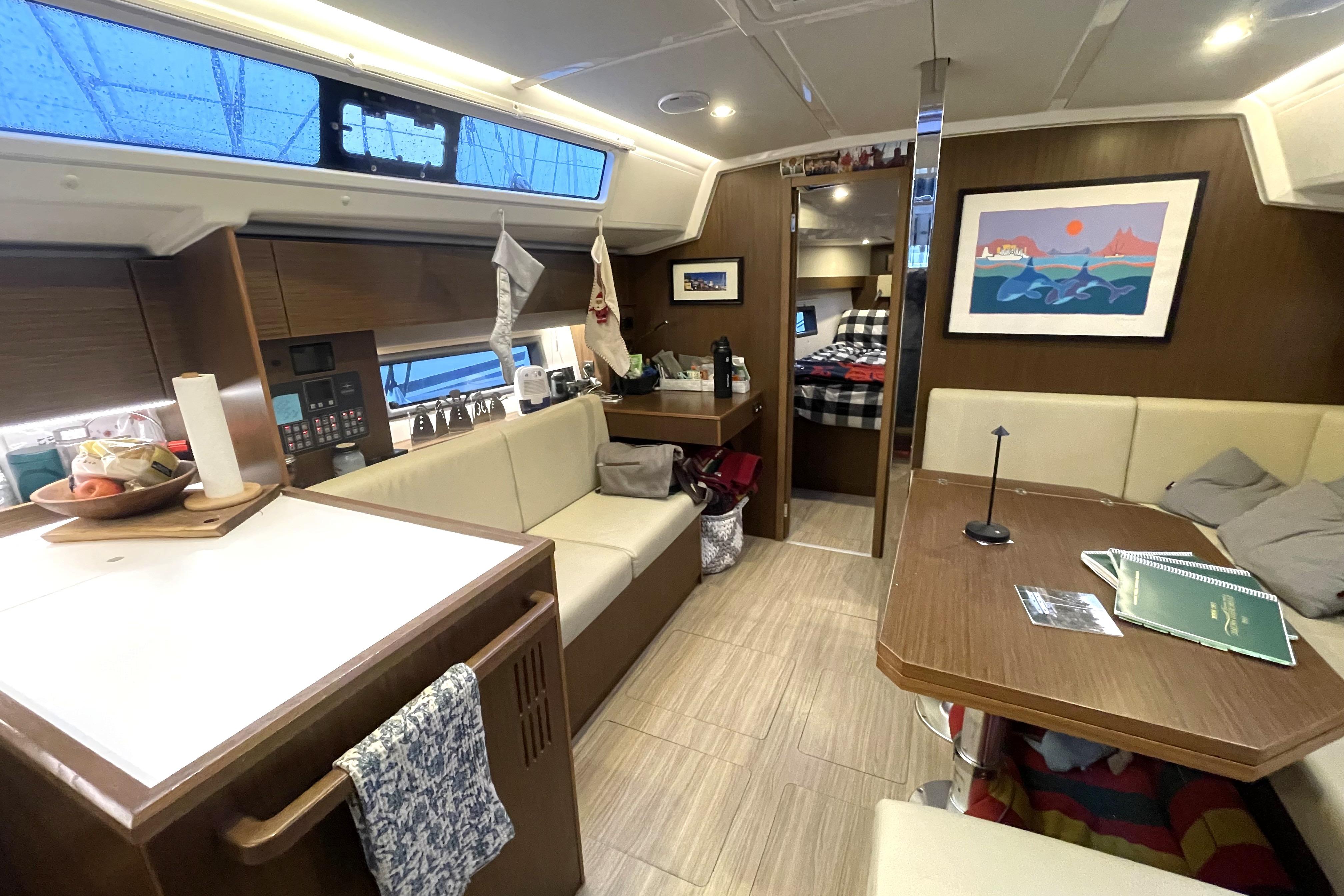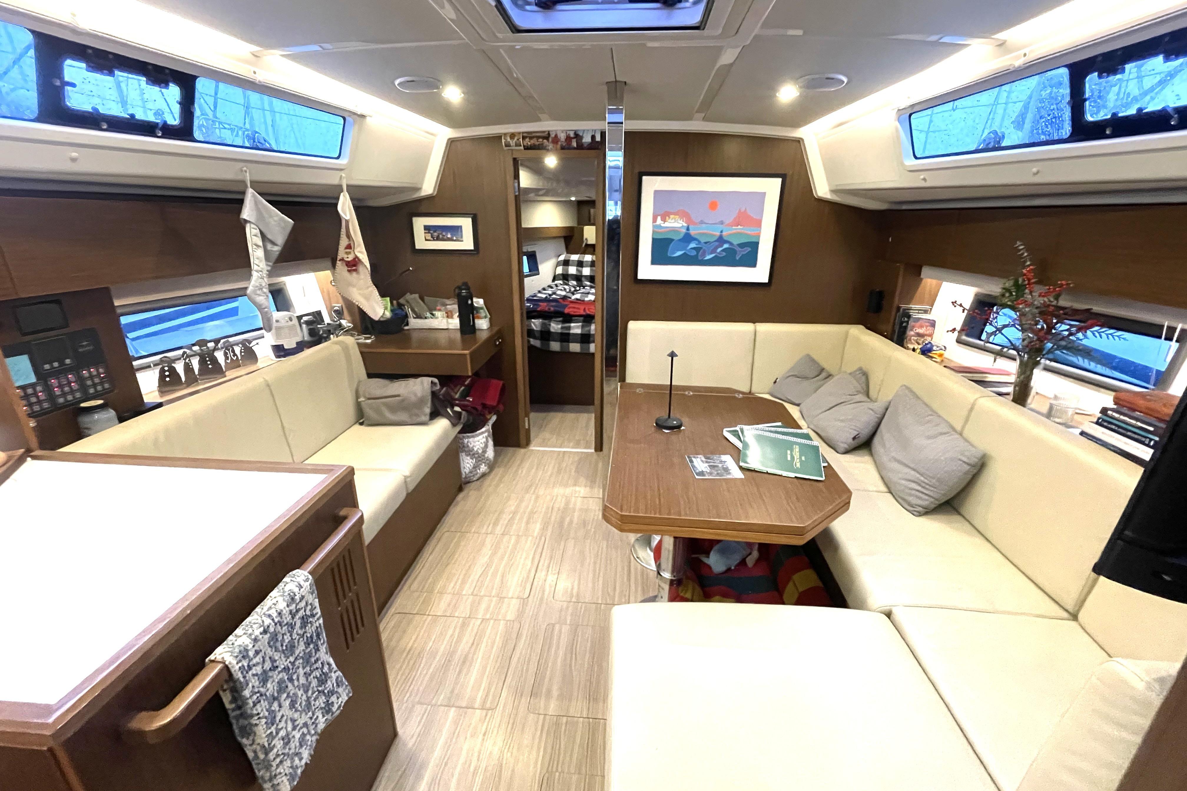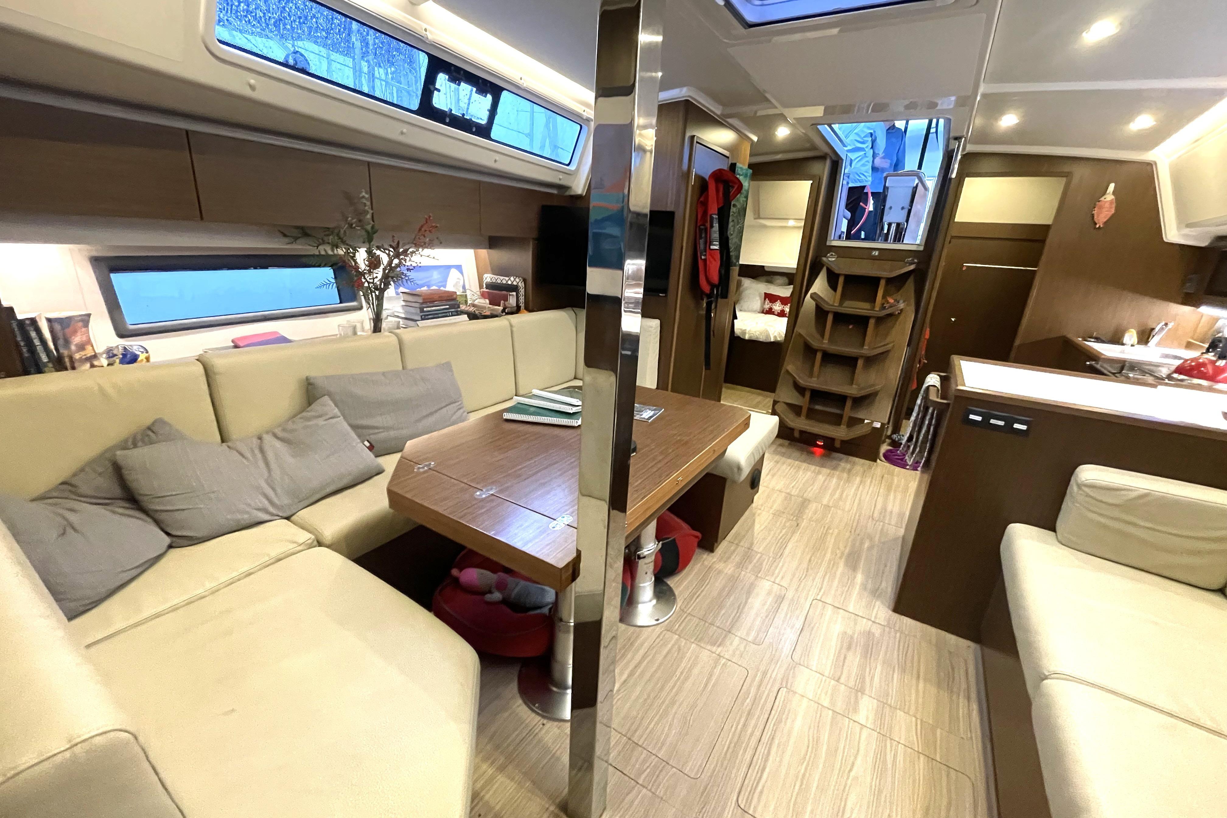 - Salon: forward of the galley features a sofa to port with the chart table forward of it.