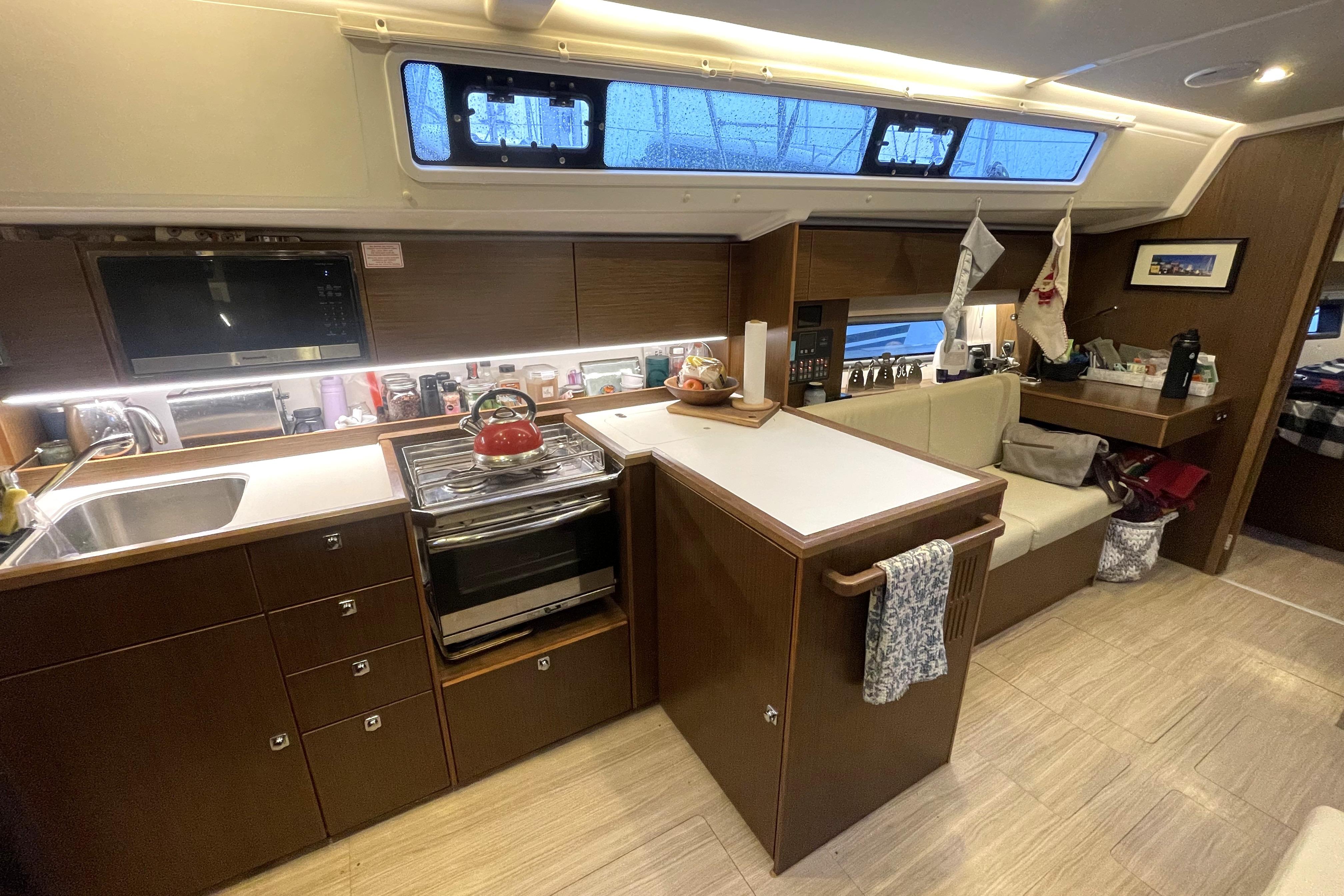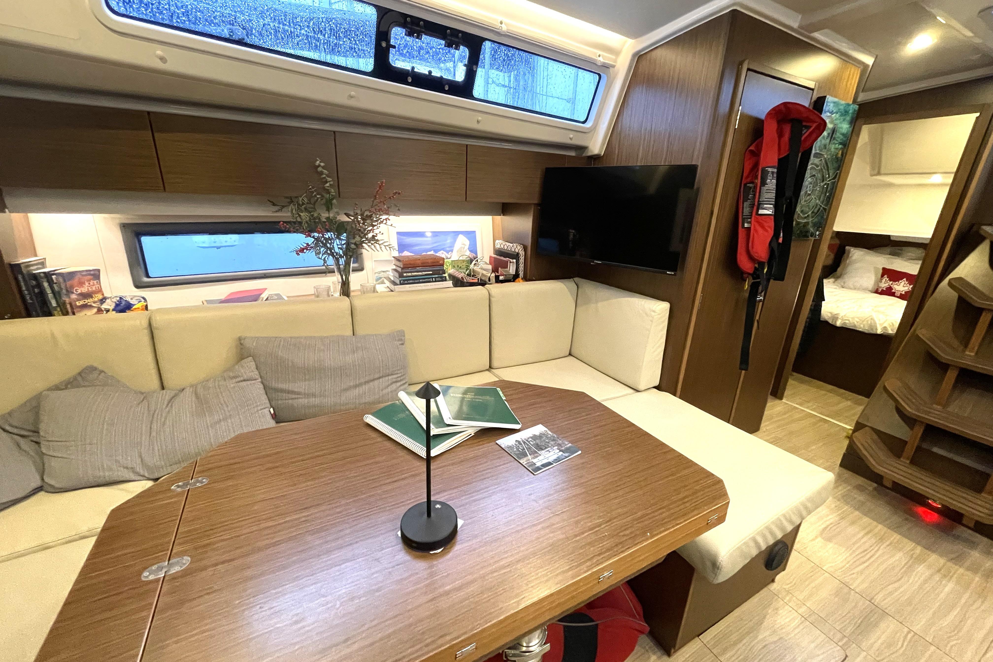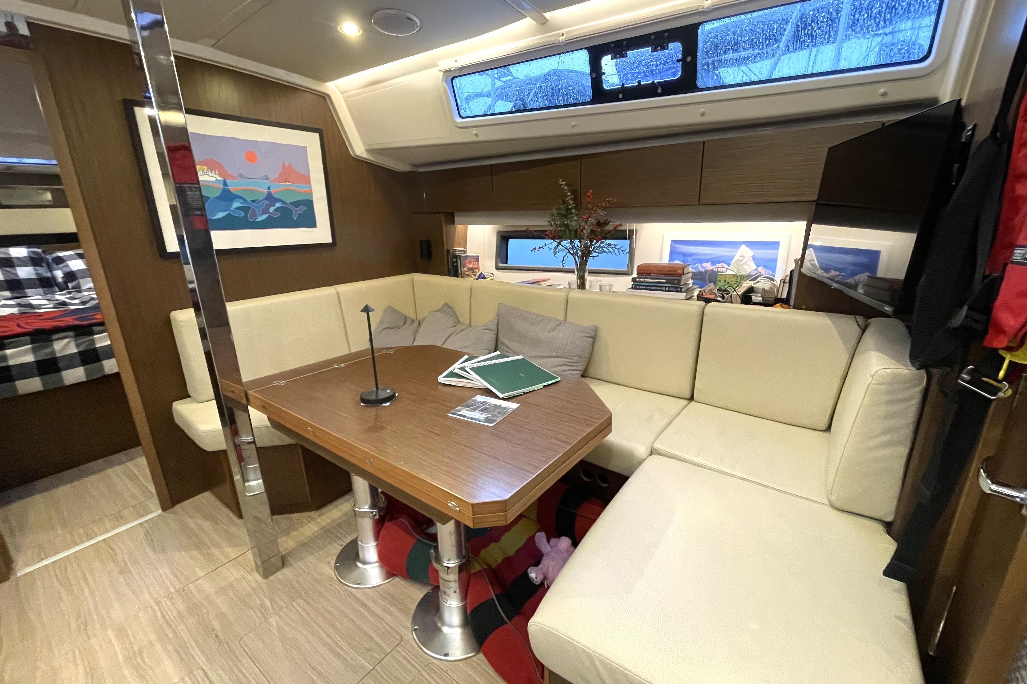 - Salon: forward of the galley features a sofa to port with the chart table forward of it.