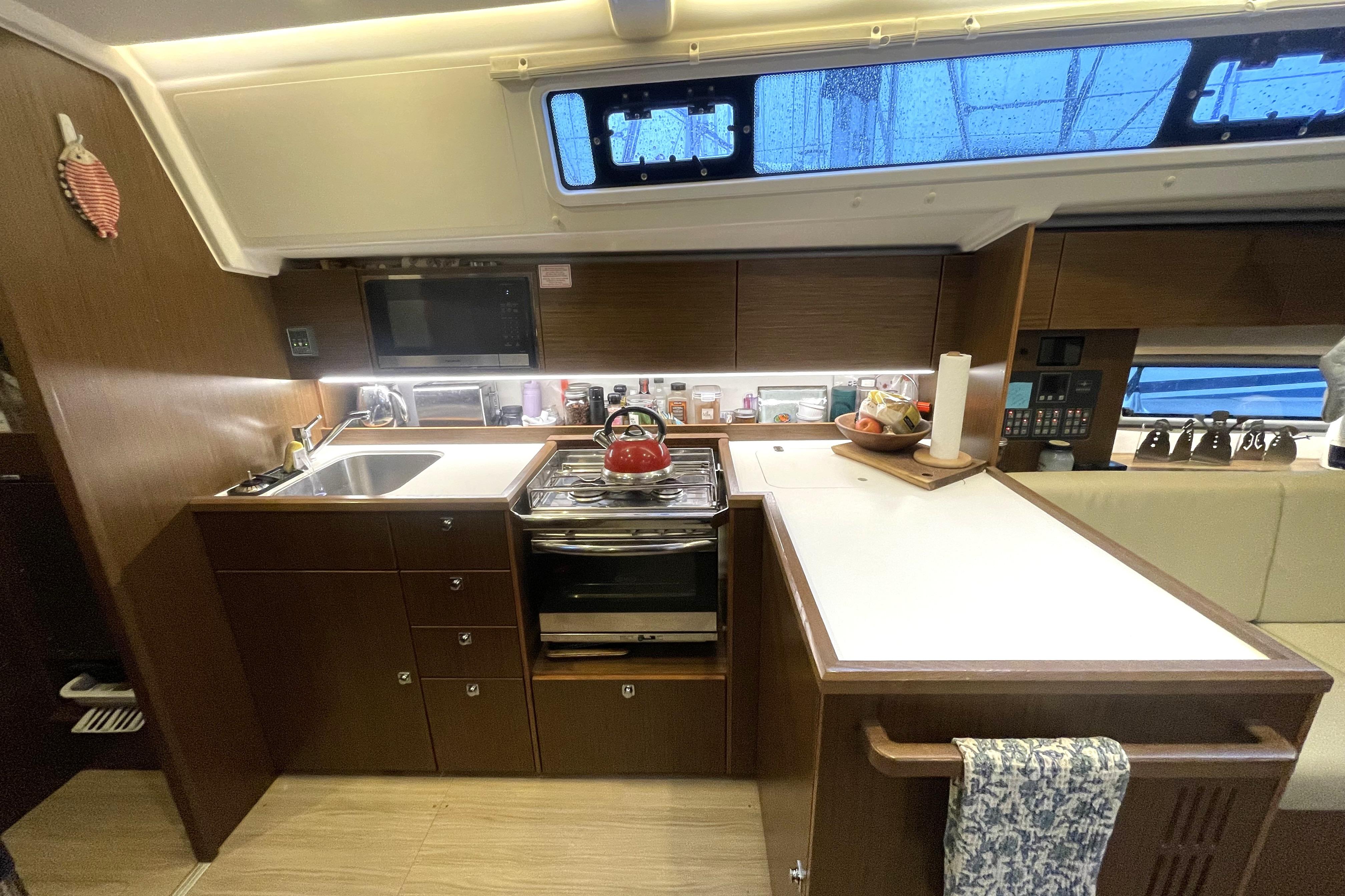 - Galley: L-shaped to port with large countertop in white, large deep top loading storage, sink with mixing faucet