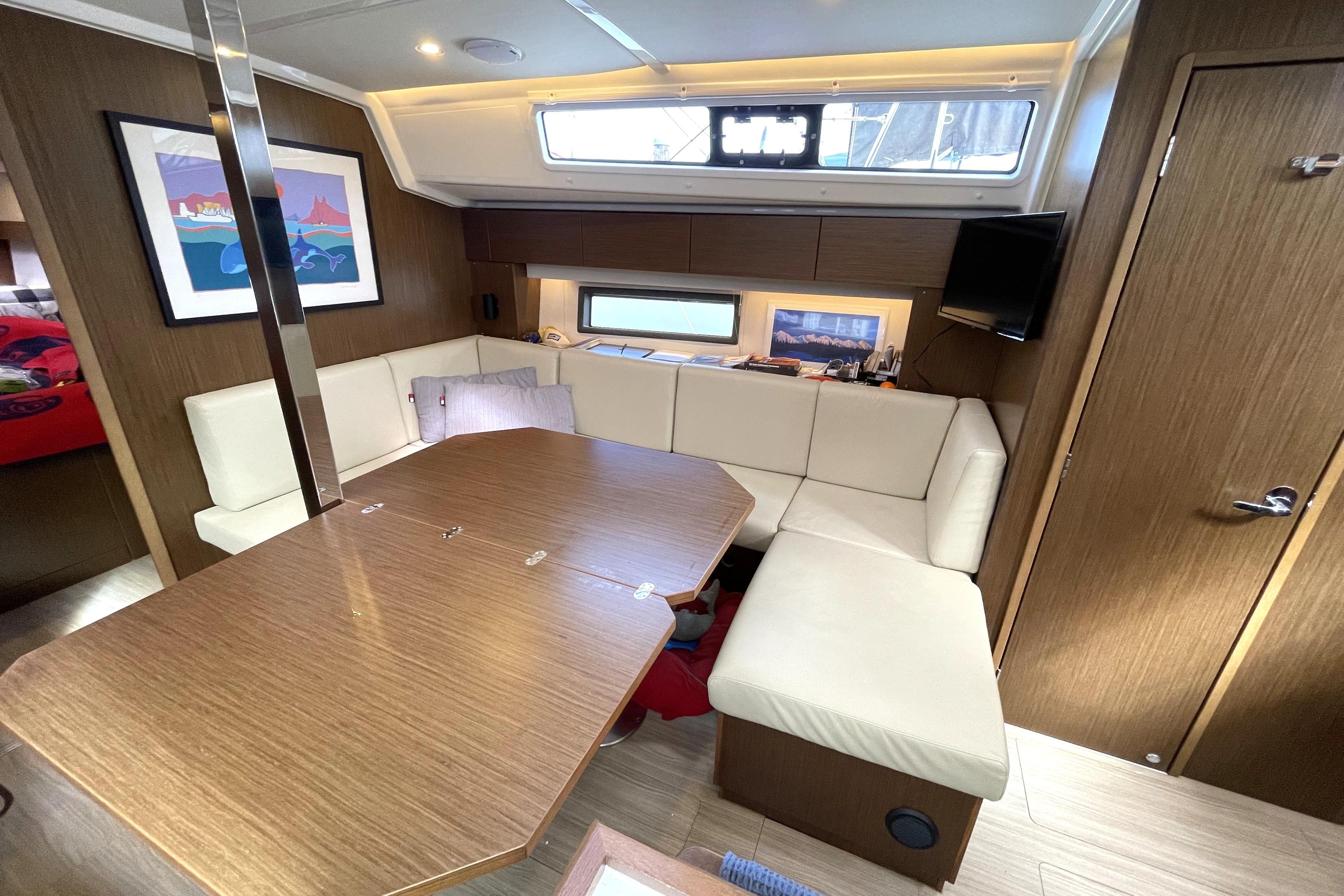 - U-shaped dinette to starboard with a large table that folds open to the bench seat allowing eight people to enjoy a meal together.