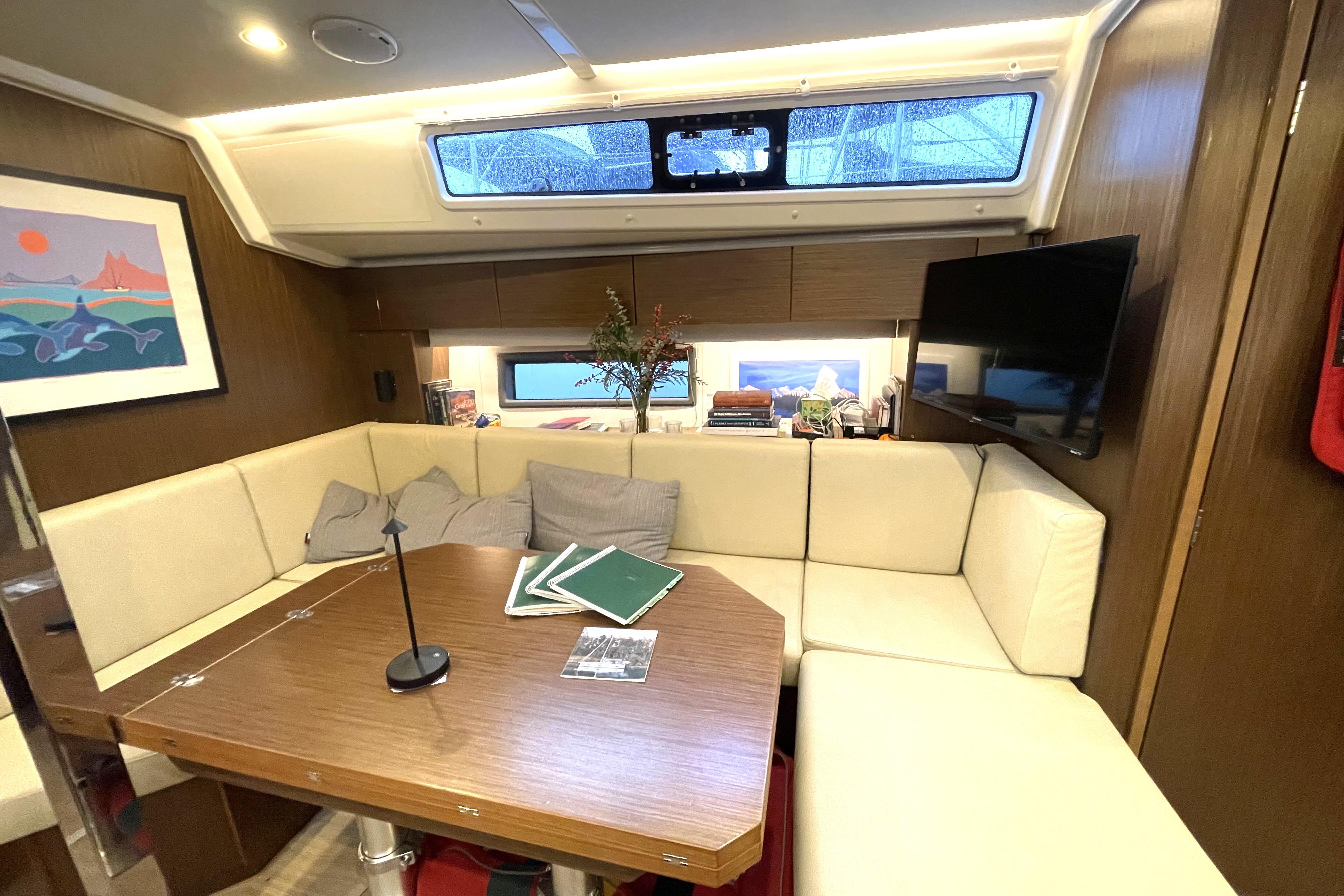 - TV mounted on bulkhead in salon