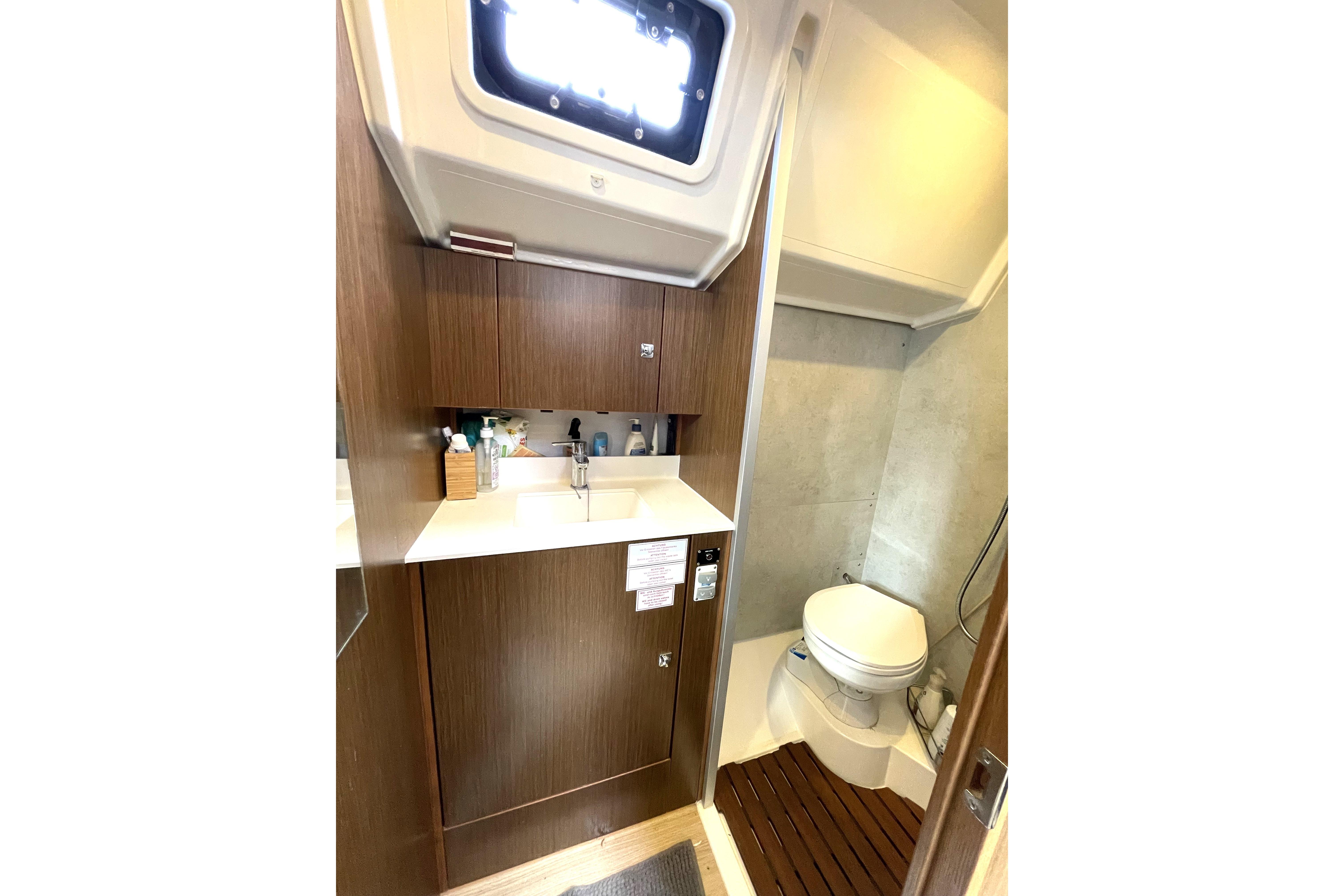 - Head: large compartment to starboard featuring a separate shower stall with toilet allowing you to use the toilet as seat while showering, glass shower door