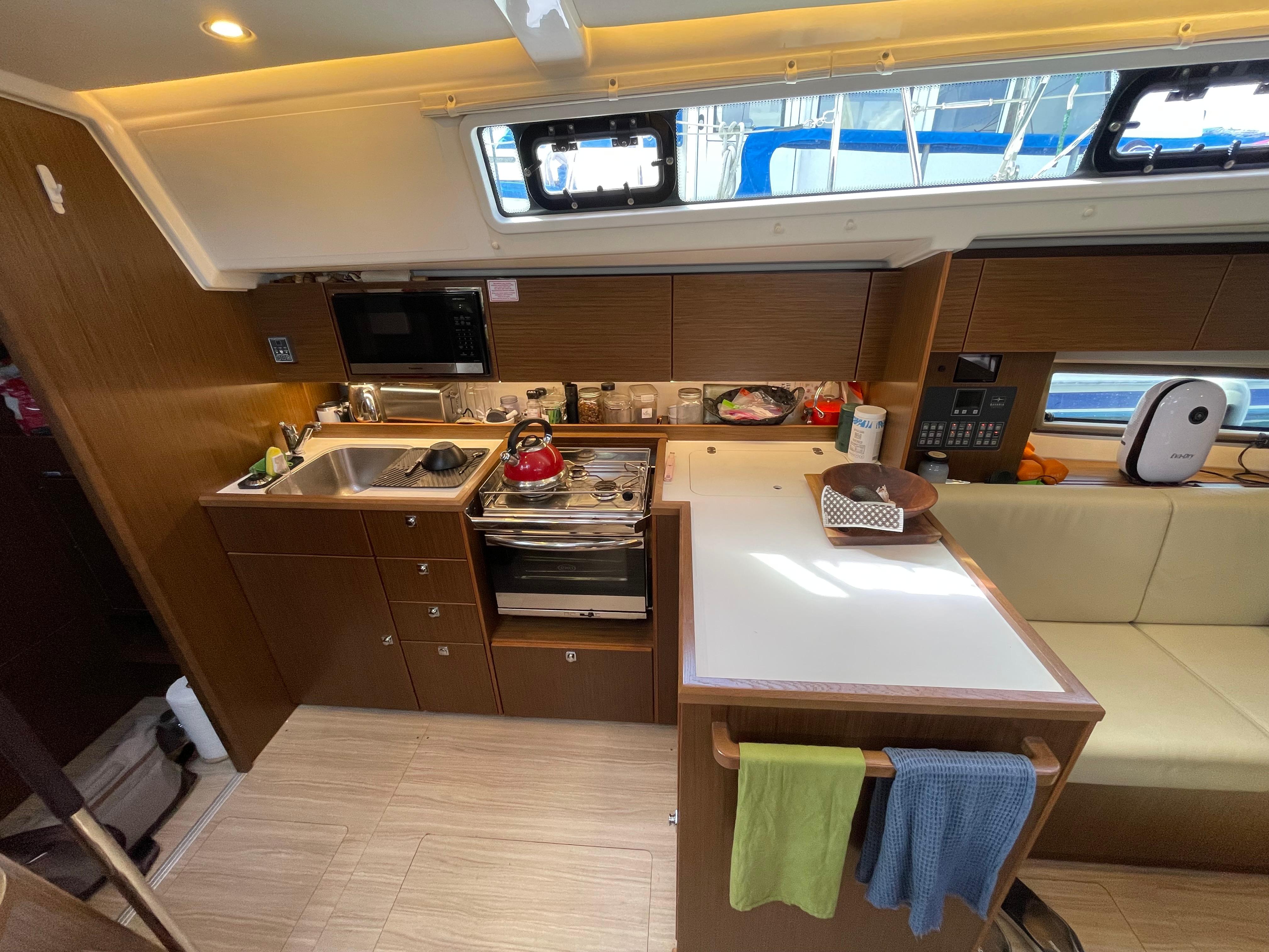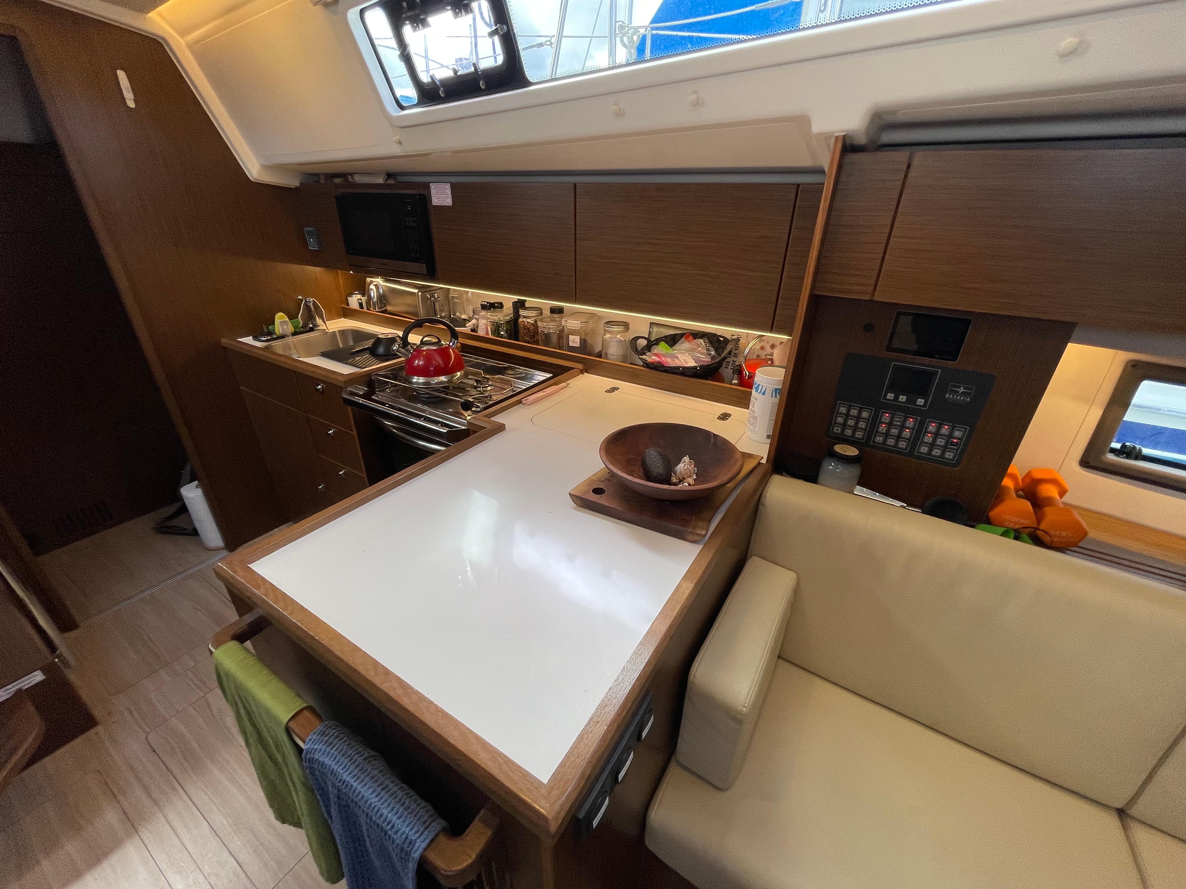 • Galley: L-shaped to port with large countertop in white, large deep top loading storage, sink with mixing faucet