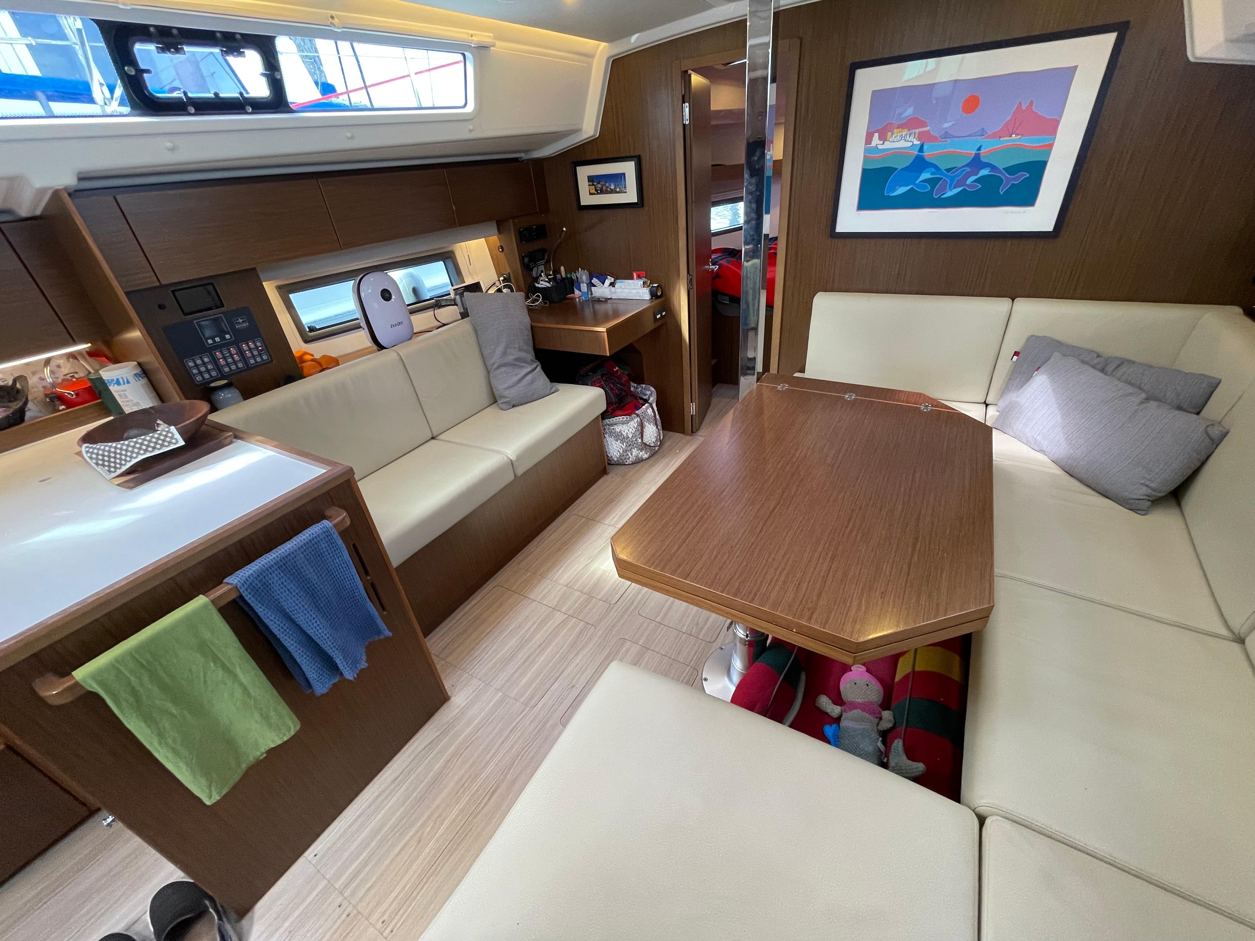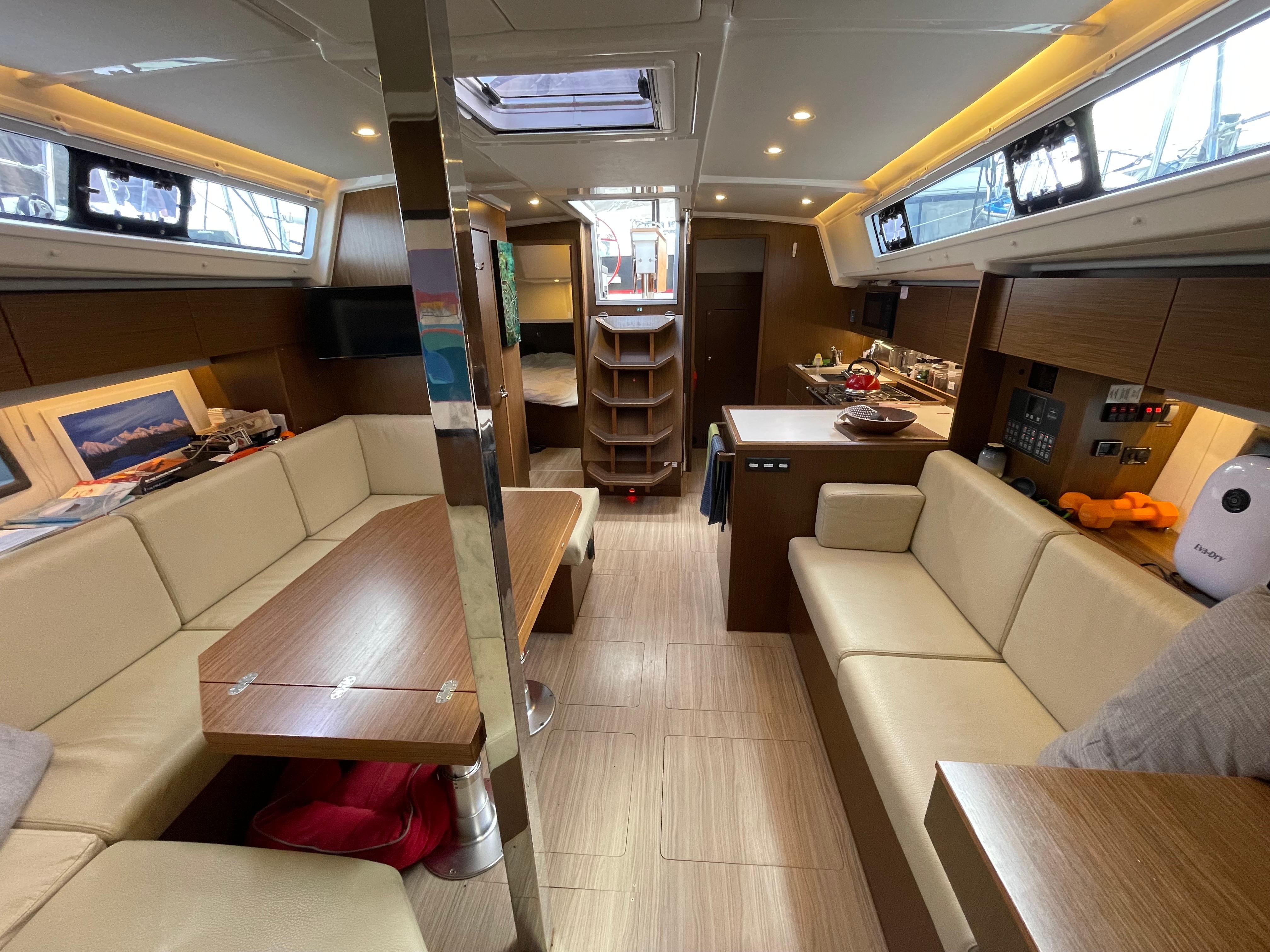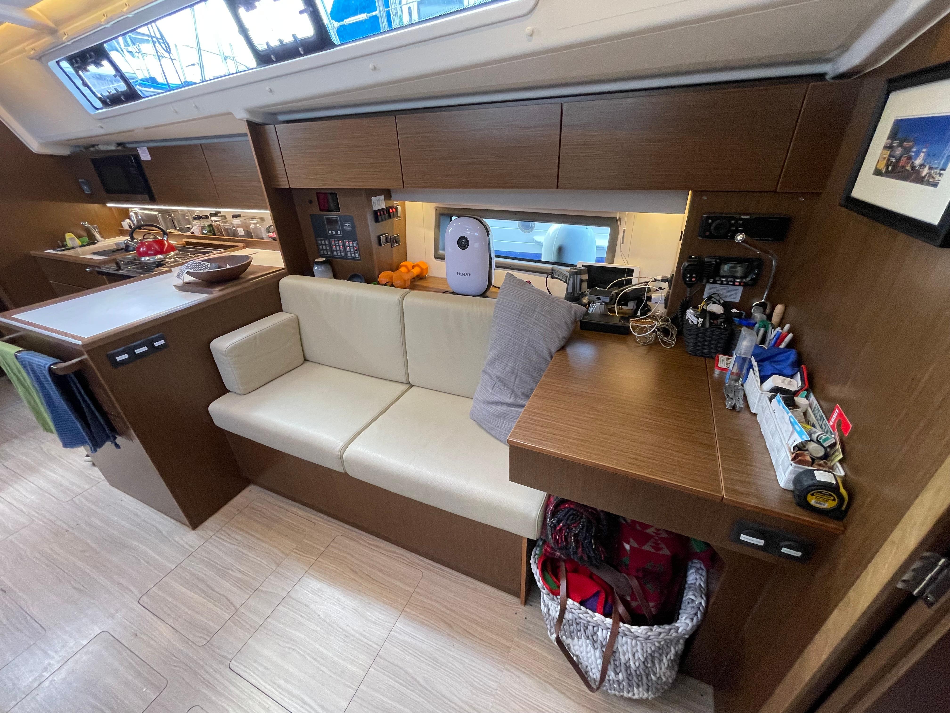 • Salon: forward of the galley features a sofa to port with the chart table forward of it.