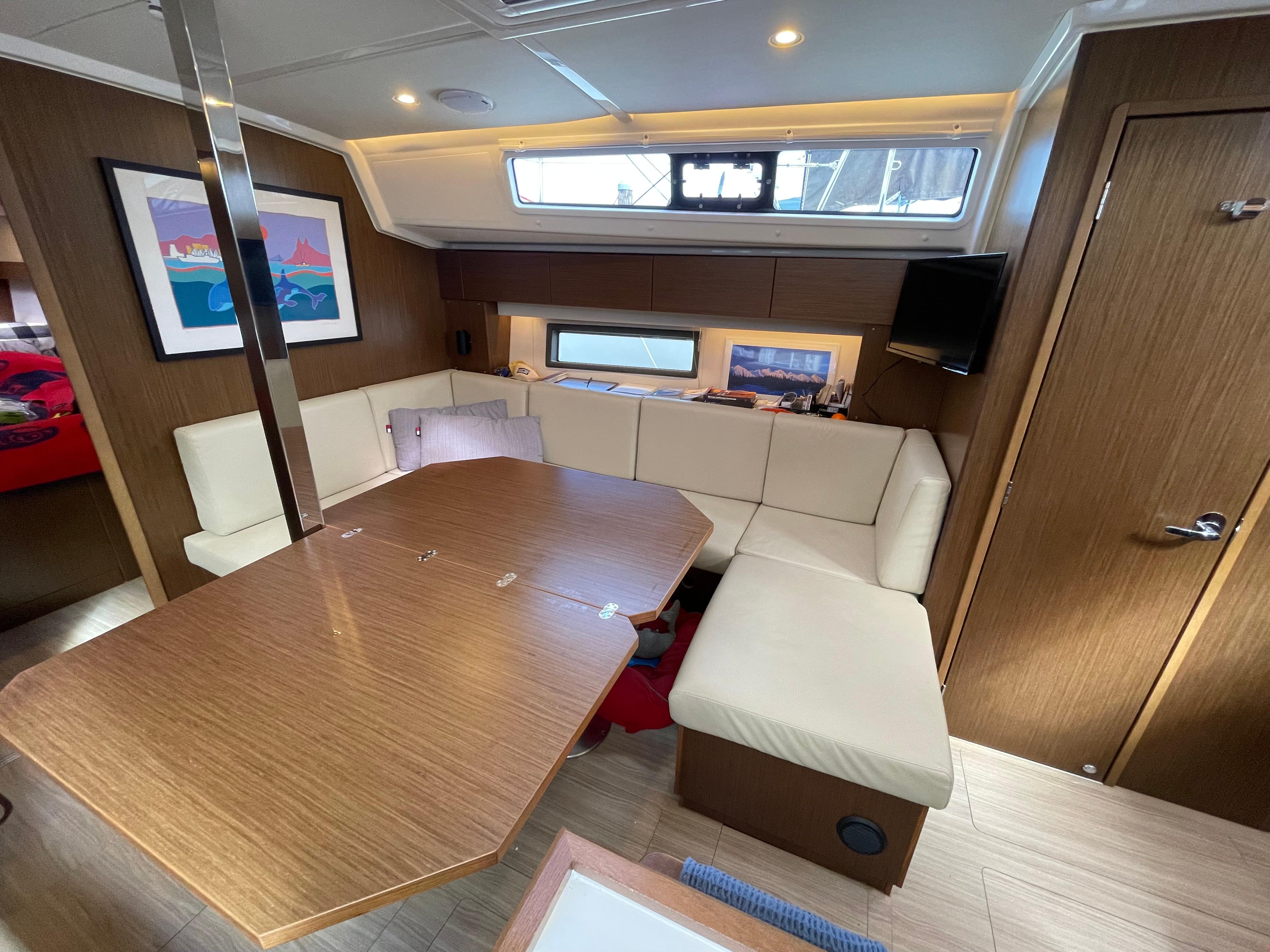 • U-shaped dinette to starboard with a large table that folds open to the bench seat allowing eight people to enjoy a meal together.