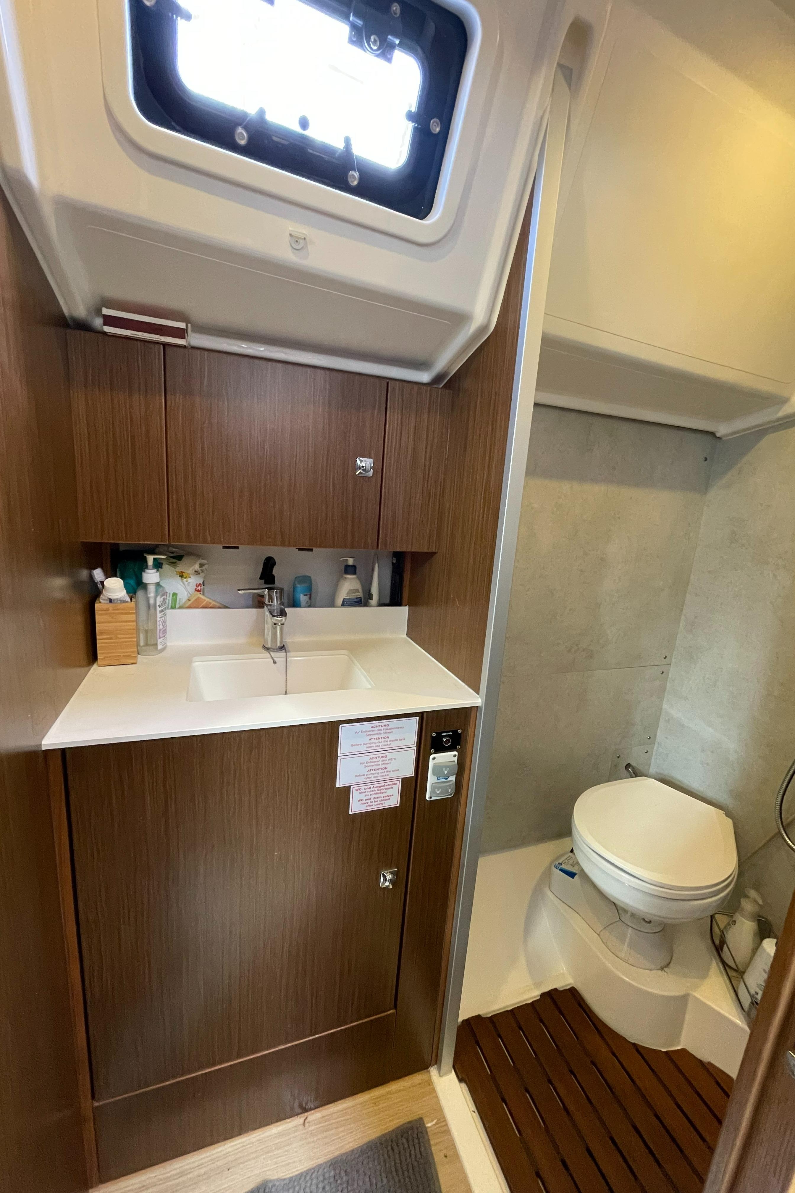 • Head: large compartment to starboard featuring a separate shower stall with toilet allowing you to use the toilet as seat while showering, glass shower door