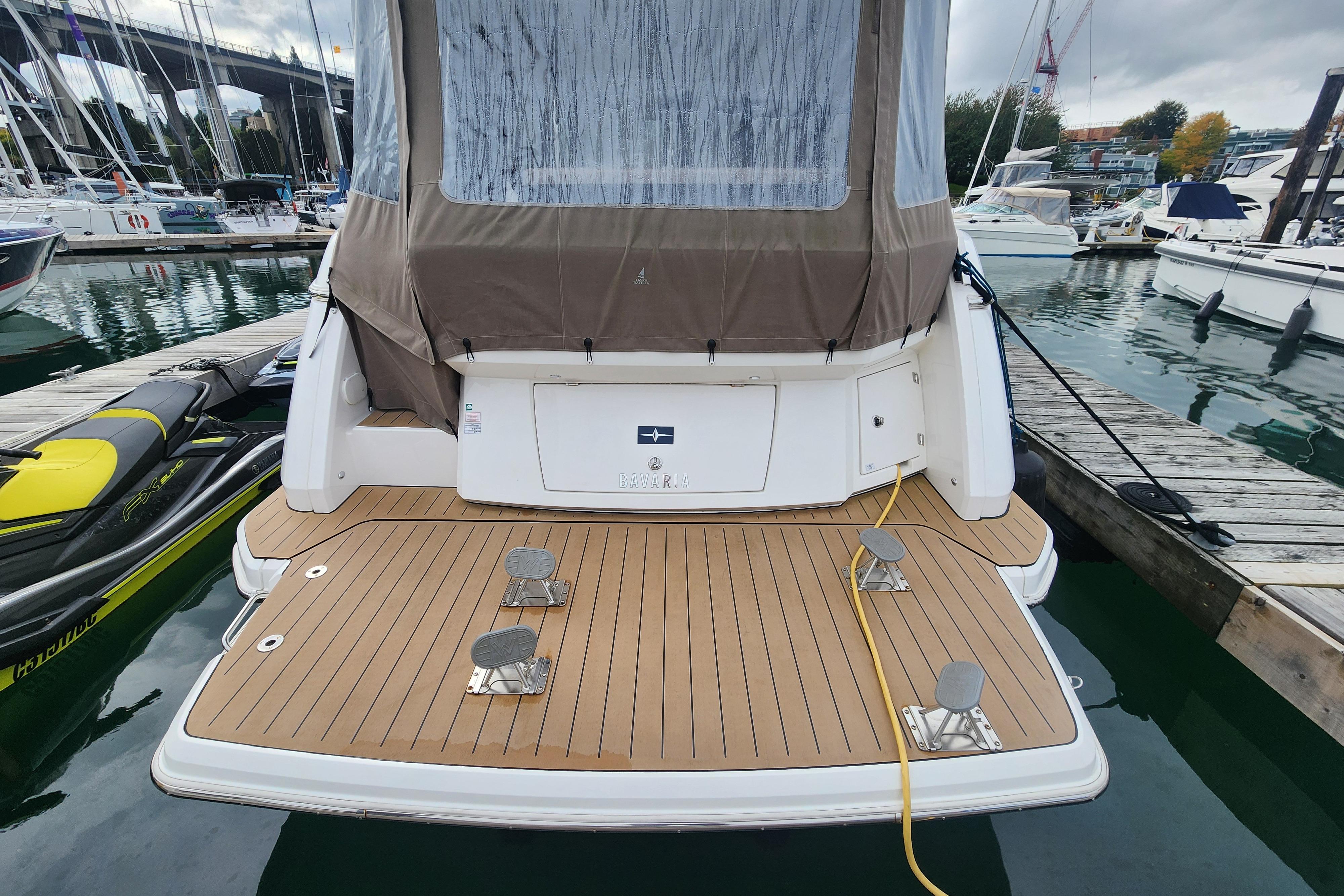 3 sliding doors creating a large opening between cockpit and salon Removable cushion on starboard to access side deck Esthec “classic” composite teak and holly decking in cockpit 50L refrigerator in FRG cabinet under stairs to fly Teak cockpit table, folding flaps, lowerable Solid overhead with recessed lighting Upgraded “Suntex” ice cockpit upholstery Stern shower Tenderlift electro hydraulic lowerable swim platform with dinghy chocks covered with Esthec “Classic” composite teak and holly finish