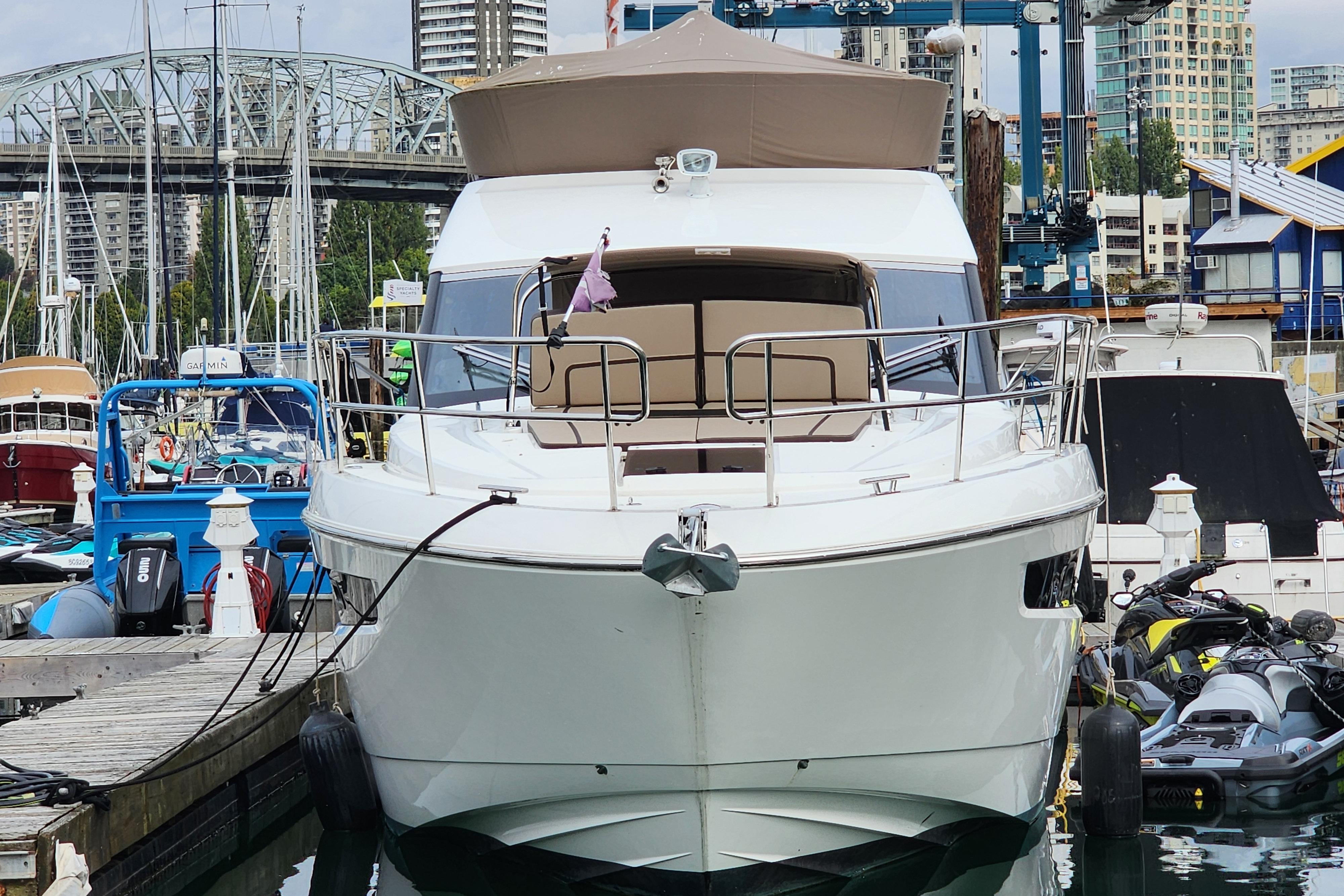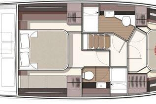 Deck Salon: Bright with large windows, extremely airy Walnut color cabinetry and Elm flooring Upholstery is artificial leather “Ivory” Additional lighting package for the interior Venetian blinds in cabins, salon and heads Sliding opening side window to port Sliding door next to helm for side deck access Climate control: 110V Air conditioning, reverse air heat Galley: Linear galley to port, integrated into the saloon large counter top 12V under counter fridge (140L) Two burner electric stove top, Microwave Stainless steel sink with hot/cold mixer faucet Overhead and below cabinet storage Lower Helm station: 2 separate bucket seats, 3rd co- pilot bucket seat to port Opening door window to side deck from helm Well laid out instrument panel with 2 x 12” MFD screens Height adjustable electric steering wheel All instrumentation at ones fingertips Throttle and joystick accessible on the right of the wheel if side door is open and standing outside Large windshield with excellent visibility Dinette: L-Shaped settee to starboard Dinette table with foldable leaves to make into a coffee table Dinette also lowers to provide berth (includes cushion) Port side window slides open for extra venting in galley Curtain for aft sliding door Forward cabin: Scissor Island queen bed, walk around access ( scissor allows bed to be 2 single berths) Upgraded cold foam mattress with memory top Port and starboard wardrobes with overhead lockers Deep pile carpeting Large side windows in the hull, opening hatch Excellent lighting Day head: features day access door Separate shower cubicle, porcelain basin in vanity Electric flush toilet Overhead lockers and below sink storage Midship Owners cabin: Full beam midship cabin Large hull windows with opening ports either side Venetian blinds on side windows Full size Island double bed, walk-around Large chase lounge to starboard Sideboard unit with storage to port Port and starboard wardrobes Deep pile carpeting Ensuite Head: separate shower cubical, with seat Fresh water electric flush toilet Porcelain basin in vanity Overhead lockers and under sink storageMECHANICAL