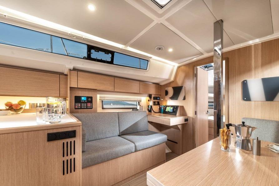 The U-shaped seating area at the starboard side and the portside lounge bench easily cater for eight people during a cosy dinner. As in classic layouts, the L-shaped pantry is located portside.