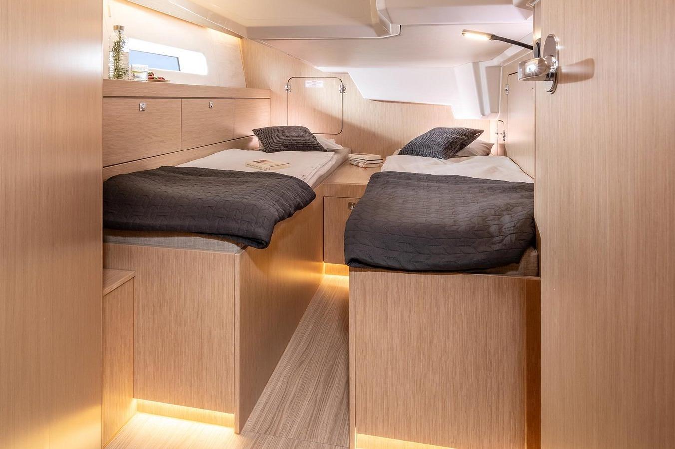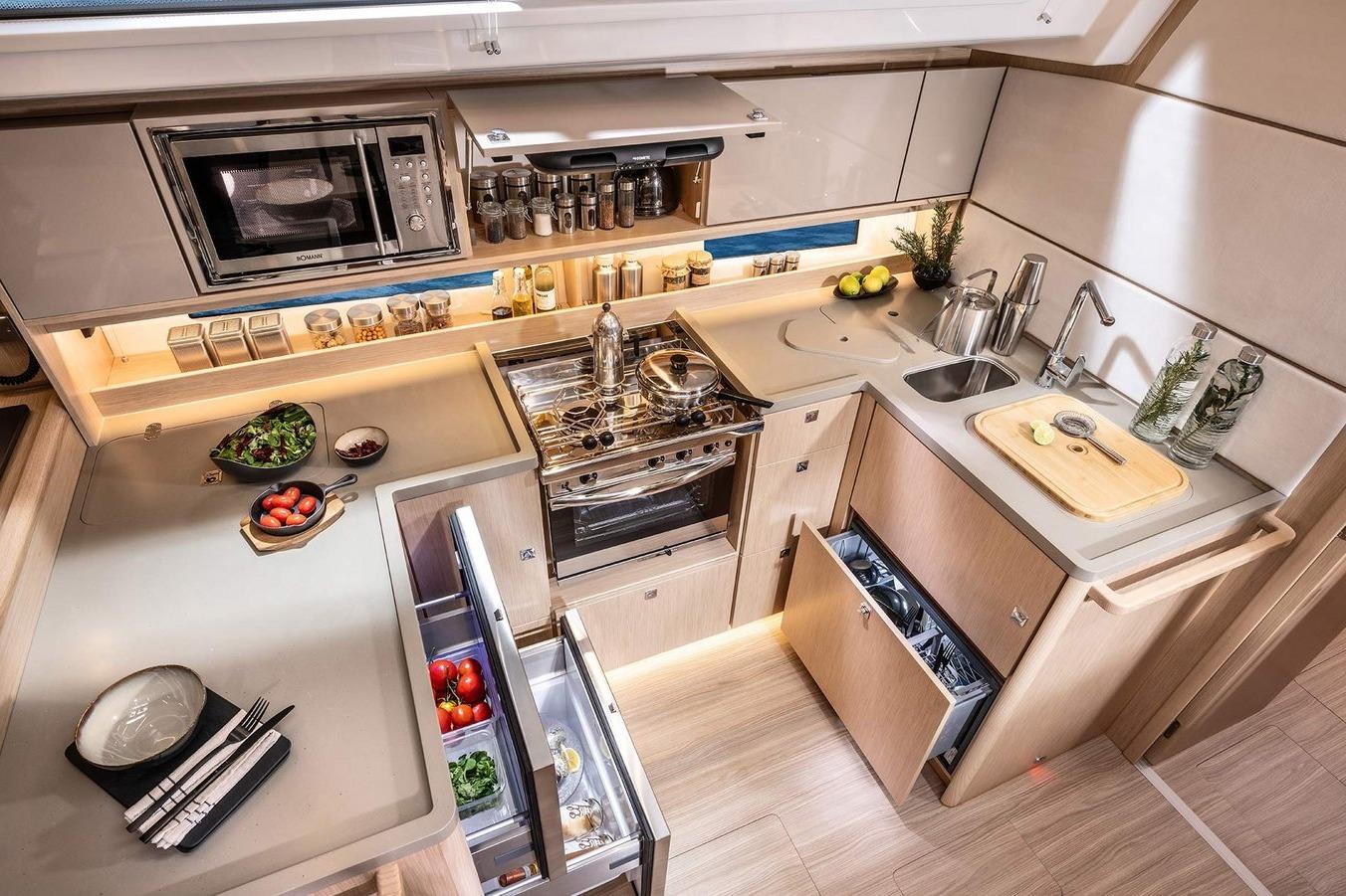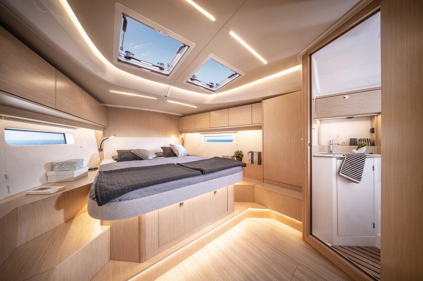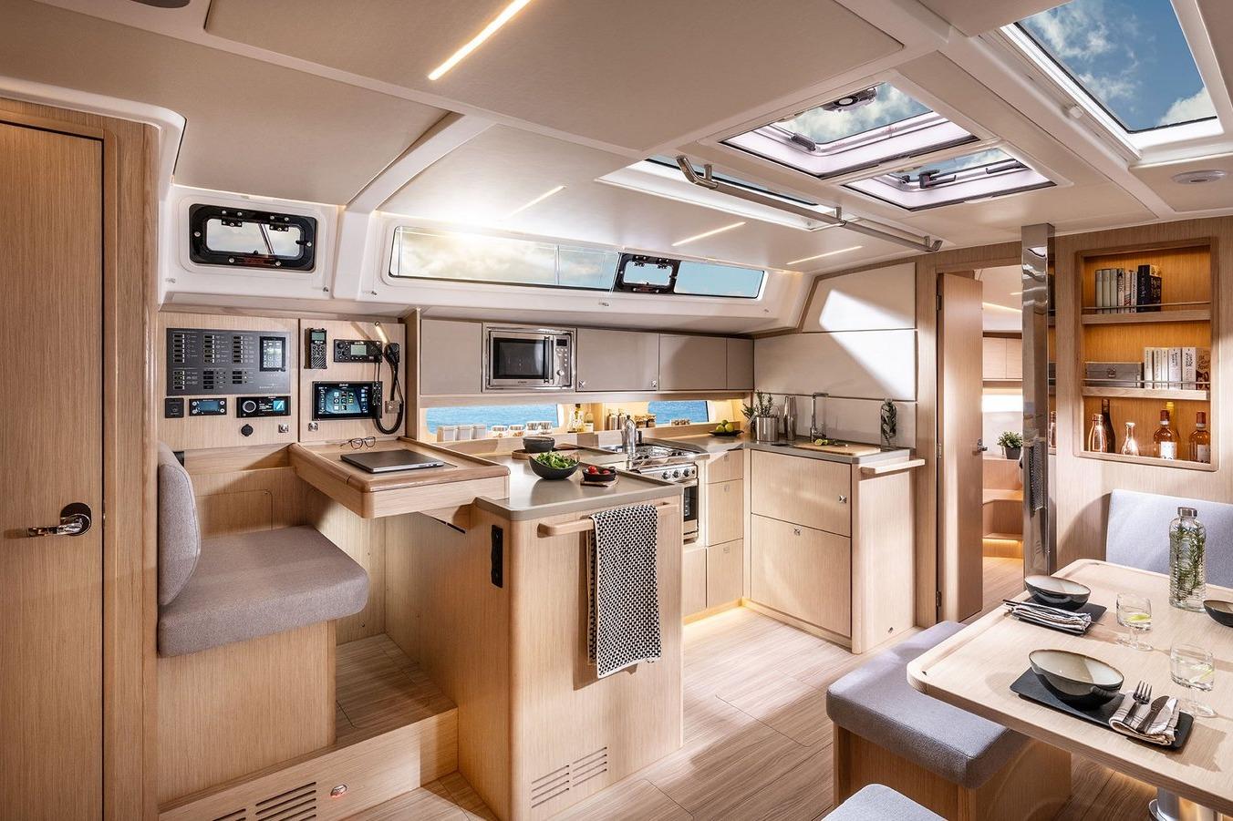 The further more of yachting from BAVARIA YACHTSBAVARIA C46 - InteriorWelcome on board - Simply feel at homeIn addition to modern design and high quality fittings, the clear goal in the development of the BAVARIA C46 was to guarantee owners and crew maximum privacy in the cabins for a relaxing time on board and to offer the greatest possible individualisation through a wide range of layout options.To port, the BAVARIA Board Office and the large galley. To starboard, space for social hours with the crew at the large salon table. And in the 4-cabin variant, the open main bulkhead for an even larger salon.In the foreship, the spacious owner's cabin, plenty of sunlight during the day in the salon, warm light in the evening in all cabins and the on-board library at the main bulkhead. Simply feel good in the 3-cabin variant of the BAVARIA C46Alone or as a couple, the aft cabin to starboard with two berths that quickly convert into a large double bed.The owner's cabin not only has a large double bed, but also plenty of storage space and room to relax.You won't miss a thing in the fully equipped kitchen. Delicious meals can be prepared on the gas hob including extractor bonnet and the dishwasher will do the rest after the mealThe large utility room to starboard, for all sailors who would prefer to be on board all year round. Just one of many possibilities for the configuration of a very individual BAVARIA C46.BAVARIA C46 - Exterior - For the pure joy of sailingThe BAVARIA C46 is full of clever details for maximum sailing pleasure and comfort on board. The exceptionally good sailing characteristics already known from the BAVARIA C-LINE have been further optimized with the new rig-sail concept on the BAVARIA C46 for the pure joy of sailing.Hull design, sail plan and deck layout were created by Cossutti Yacht Design from Italy, well known in the offshore scene for fast sailing yachts.The integrated bowsprit for Code 0 and Gennaker as a second headsail and of course, to protect the anchor.The chart plotter and all important instruments in the helmsman's field of vision on the newly developed steering columns.The well-proven reinvented: Information for the whole crew through additional displays directly above the companionway.BAVARIA C46 - Data and OptionsNo wish remains unfulfilledA large owner's cabin with a separate shower or rather two cabins with their own bathroom in the bow? A fifth cabin with double bunk beds for the crew, a utility room or rather a fourth bathroom? The BAVARIA C46 offers a wide range of possibilities below deck.