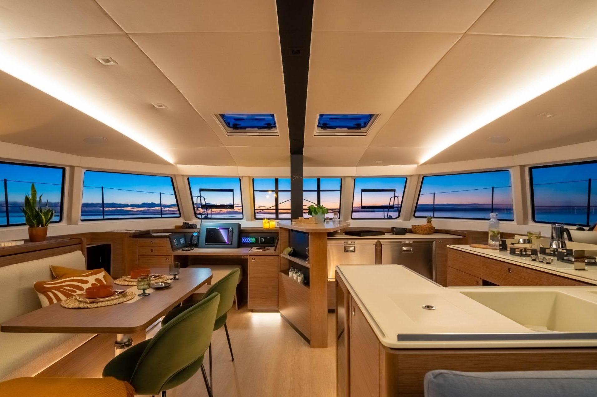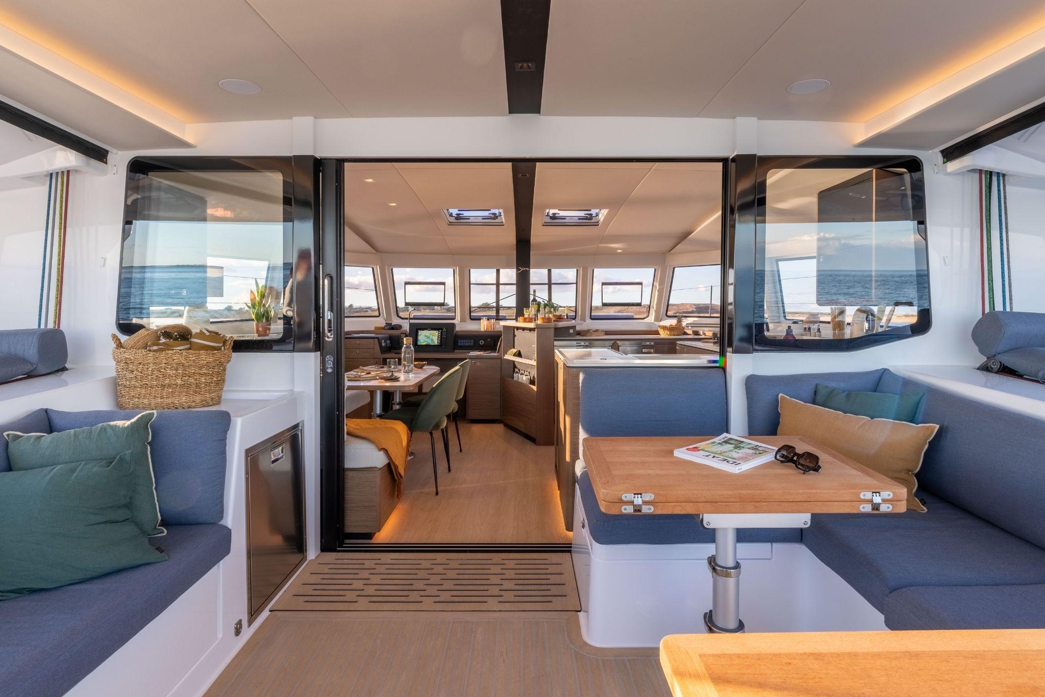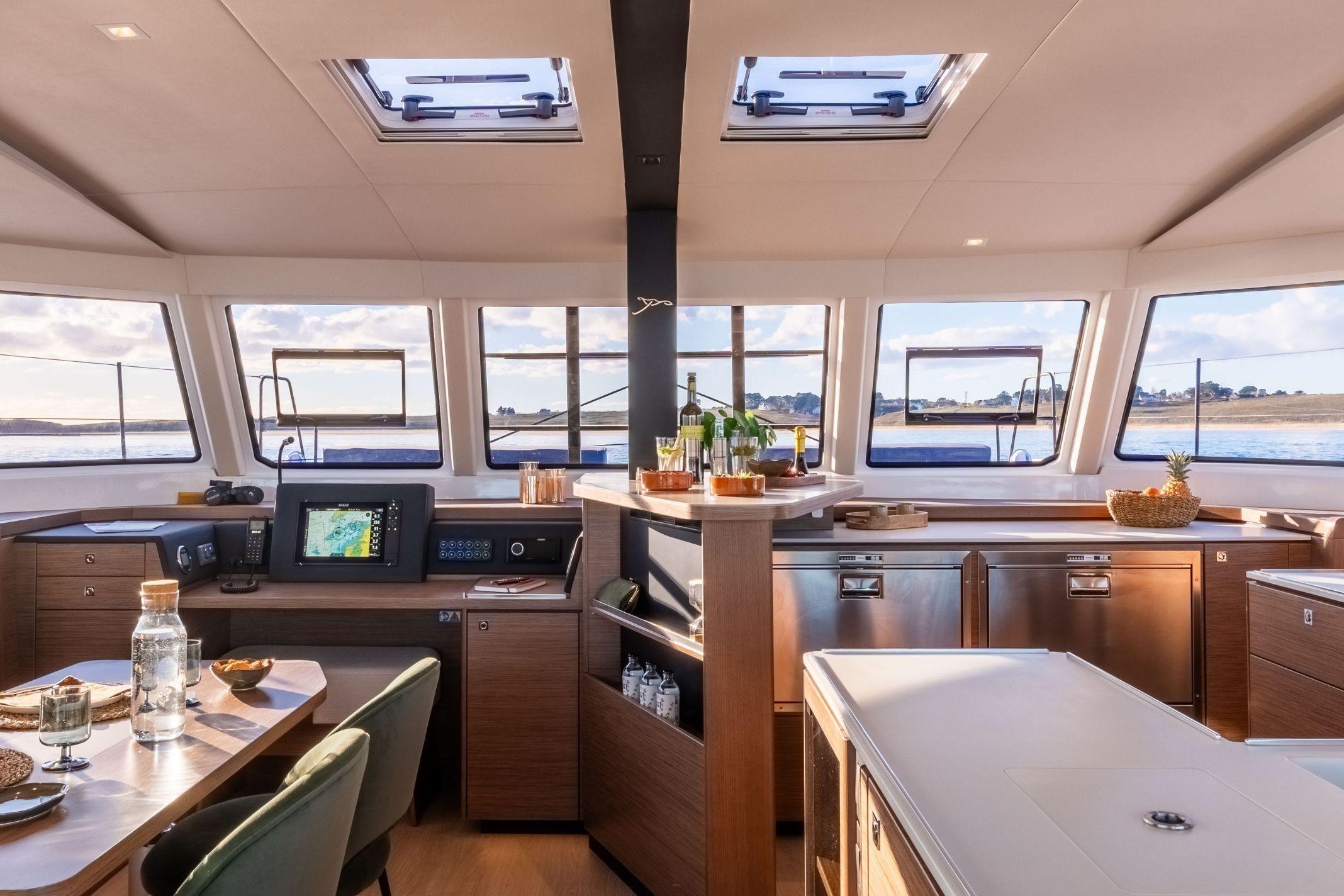 A unique living space, the "open" concept Guided by the desire to satisfy all navigation and lifestyle programs, five different layouts are proposed. Subtles details for a perfect harmony A modern and elegant atmosphere created in collaboration with the designer Christophe Chedal-Anglay. The 48 Open is available in standard light walnut and optional oak finishing to match with all tastes. Enjoy the spacious kitchen with all the appliances at your fingertips. Benefit also from the iconic bar in the heart of the living area. Close to the mast and located at the center of gravity of the boat, it is where people will join together, discuss the route, and probably "elevate their dream" with enthusiasm. The place that naturally attracts everyone on board. Benefit from the large lounge area and a large chart table. A high-range quality finish, offering a sophisticated interior Unrivaled finishes, modularity, and generous volumes are the keywords used in the development of the 48 OPEN. Take advantage of the quality materials and the soft and pleasant natural light thanks to the large panoramic windows providing a calm and inspiring view of the horizon. This new model of the Open range raises the standards combining comfort and elegance to offer a unique experience of life on board.