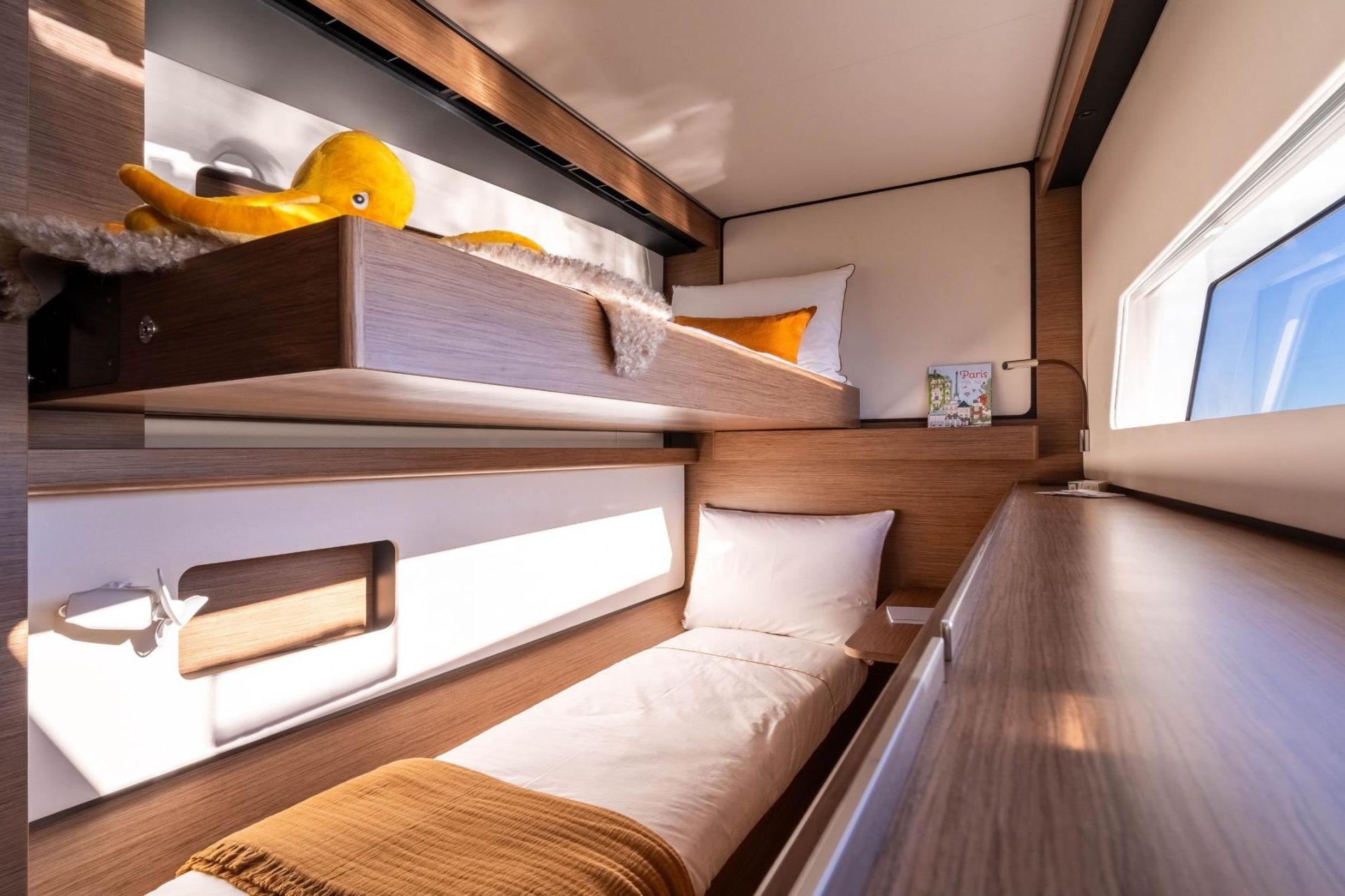 Open, authentic moments of sharing The opening of the interior saloon to the outside is an undeniable quality of this new model. An optimized circulation and well-defined spaces will make the border between the interior and the exterior disappear to offer more space on board. This unique concept, revisited by the designer Christophe Chedal-Anglay, takes on a new meaning by centering itself around the bar placed in the heart of the saloon and at the center of gravity of the boat. This iconic element creates a unique living space that adapts to all moments of the day and to all lifestyles. Everyone will find their own use for the space, and all will be able to share these moments together. Each space has its own function, in perfect harmony with you and your crew. A space that will evolve onboard with you. An elegant suite with incomparable finishing qualities Enjoy the comfort of this spacious and luxurious owner suite with its own integrated dressing. Also flooded with natural light from the long window in the hull and above the headboard, this elegant suite is the perfect place to relax. A luxurious bathroom with a separate toilet From design to manufacture, all choices have been guided by the desire to offer a top-of-the-range boat where the term "Quality" takes on its full meaning. You will be able to discover a quality of finish and materials in this very luminous bathroom, thanks to its deck panels which offer ventilation and natural light, and its large mirror. You also have a large resin worktop with an integrated sink, easy to clean, and many storage spaces for your greater comfort.